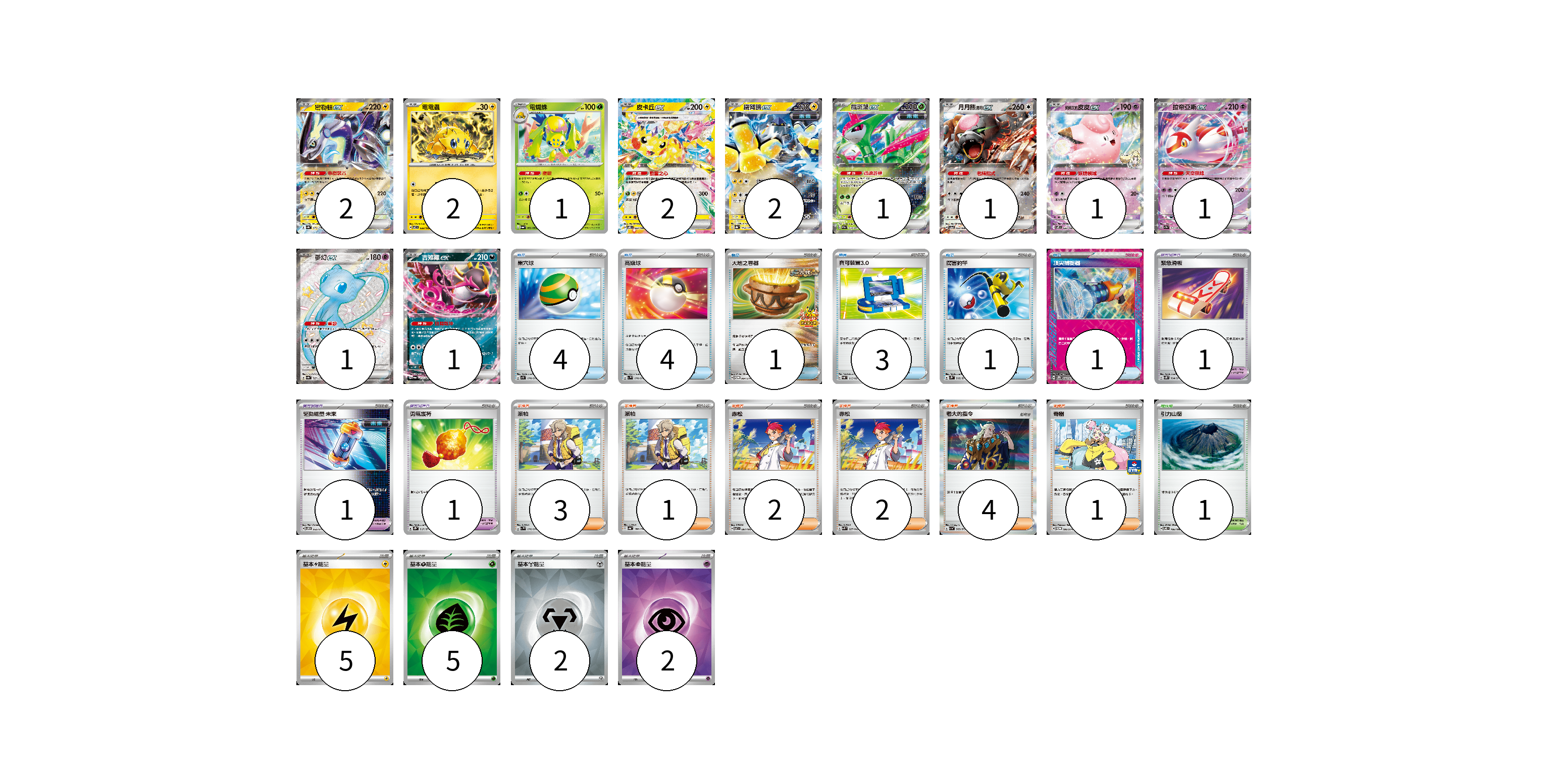 牌組構築方案 以此牌組為基礎新構築牌組 顯示卡面 顯示列表 寶可夢卡(15) 2 2 1 2 2 1 1 1 1 1 1 寶可夢道具(3) 1 1 1 物品卡(14) 4 4 1 3 1 1 支援者卡(13) 3 1 2 2 4 1 競技場卡(1) 1 能量卡(14) 5 5 2 2 寶可夢卡(15) 卡牌名稱 張數 卡牌名稱 張數 密勒頓ex SV4a 071/190 02 電電蟲 SV7 032/102 02 電蜘蛛 SV6a 002/064 01 皮卡丘ex SV8 033/106 02 鐵臂膀ex SV8a 054/187 02 鐵斑葉ex SV5M 016/071 01 月月熊 赫月 ex SV5a 052/066 01 莉莉艾的皮皮ex SV9 033/100 01 拉帝亞斯ex SV7a 019/064 01 夢幻ex SV4a 327/190 01 吉雉雞ex SV6a 038/064 01 寶可夢道具(3) 卡牌名稱 張數 卡牌名稱 張數 緊急滑板 SV5K 064/071 01 驅勁能量 未來 SV5M 065/071 01 勇氣護符 SV2D 067/071 01 物品卡(14) 卡牌名稱 張數 卡牌名稱 張數 巢穴球 SV1S 070/078 04 高級球 SV1V 070/078 04 大地之容器 SV-P 084/SV-P 01 寶可裝置3.0 SVAL 015/021 03 厲害釣竿 SV2P 066/071 01 頂尖捕捉器 SV5M 062/071 01 支援者卡(13) 卡牌名稱 張數 卡牌名稱 張數 派帕 SV1V 076/078 03 派帕 SV4a 180/190 01 赤松 SV7 097/102 02 赤松 SVK 027/042 02 老大的指令 SV1a 069/073 04 奇樹 SV-P 106/SV-P 01 競技場卡(1) 卡牌名稱 張數 卡牌名稱 張數 引力山岳 SV8 106/106 01 能量卡(14) 卡牌名稱 張數 卡牌名稱 張數 基本【雷】能量 SVK LIG 05 基本【草】能量 SVK GRA 05 基本【鋼】能量 SVOD MET 02 基本【超】能量 SVOD PSY 02 以此牌組為基礎新構築牌組 牌組編碼 UCfdbC-VhRlfq-JLfoJM copy 列印牌組單 牌組編碼已複製 分享至SNS