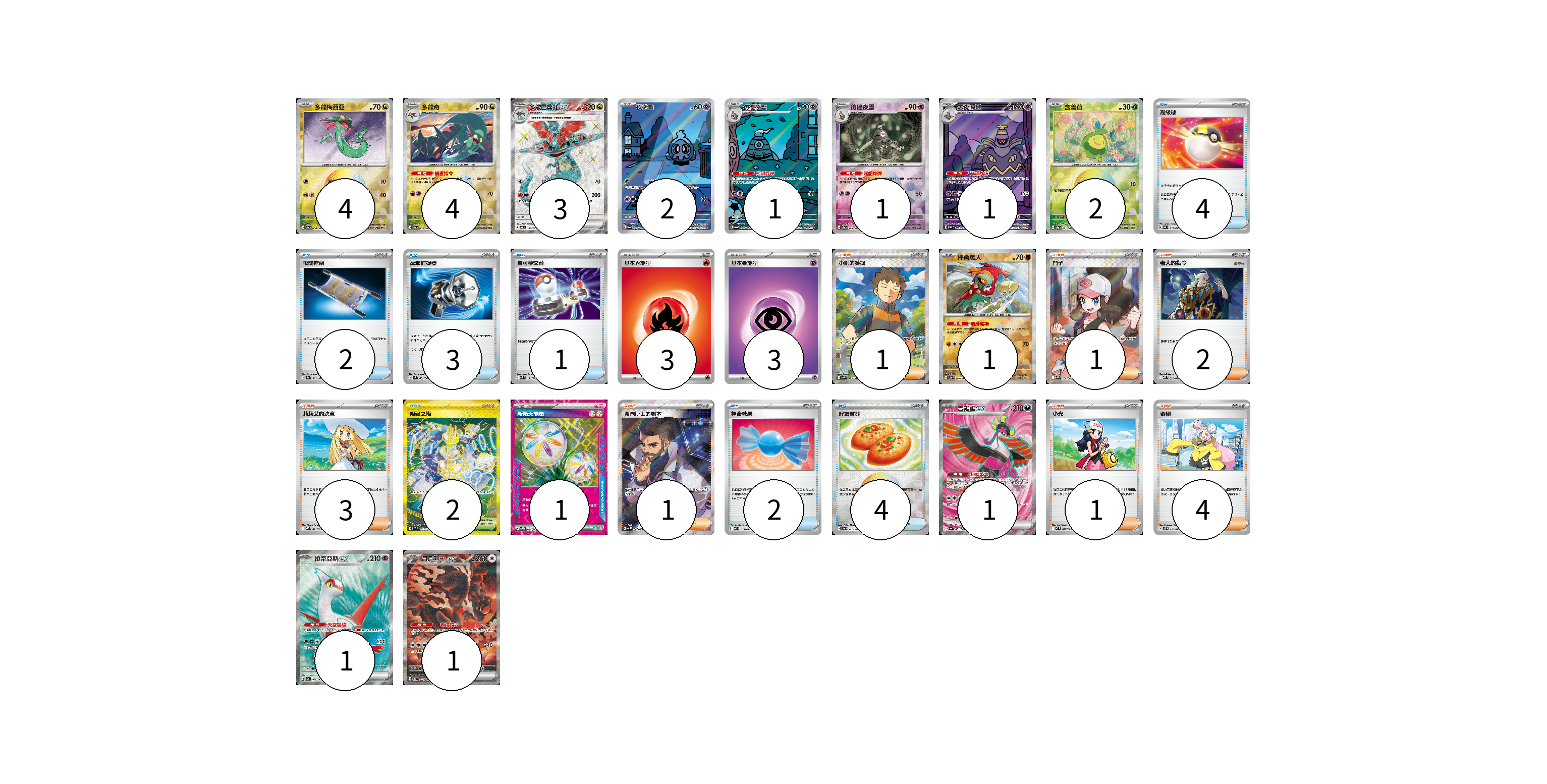 牌組構築方案 以此牌組為基礎新構築牌組 顯示卡面 顯示列表 寶可夢卡(22) 4 4 3 2 1 1 1 2 1 1 1 1 物品卡(16) 4 2 3 1 2 4 支援者卡(13) 1 1 2 3 1 1 4 競技場卡(2) 2 能量卡(7) 3 3 1 寶可夢卡(22) 卡牌名稱 張數 卡牌名稱 張數 多龍梅西亞 SV8a 118/187 04 多龍奇 SV8a 119/187 04 多龍巴魯托ex SV6 120/101 03 夜巡靈 SV6a 068/064 02 彷徨夜靈 SV6a 069/064 01 彷徨夜靈 SV8a 065/187 01 黑夜魔靈 SV6a 070/064 01 含羞苞 SV8a 001/187 02 摔角鷹人 SV8a 084/187 01 吉雉雞ex SV6a 081/064 01 拉帝亞斯ex SV7a 078/064 01 月月熊 赫月ex SV8a 225/187 01 物品卡(16) 卡牌名稱 張數 卡牌名稱 張數 高級球 SVAL 013/021 04 夜間擔架 SV8a 151/187 02 反擊捕捉器 SV4M 059/066 03 寶可夢交替 SVM 136/175 01 神奇糖果 SVEL 013/020 02 好友寶芬 SV8a 147/187 04 支援者卡(13) 卡牌名稱 張數 卡牌名稱 張數 小剛的發掘 SV9 123/100 01 鬥子 SV11W 166/086 01 老大的指令 MBD 020/022 02 莉莉艾的決意 MBD 021/022 03 弗圖博士的劇本 SV4M 086/066 01 小光 M2 077/080 01 奇樹 SVTS 018/022 04 競技場卡(2) 卡牌名稱 張數 卡牌名稱 張數 阻礙之塔 SV10 132/098 02 能量卡(7) 卡牌名稱 張數 卡牌名稱 張數 基本【火】能量 SVTL FIR 03 基本【超】能量 SVTS PSY 03 新衝天能量 SV5K 071/071 01 以此牌組為基礎新構築牌組 牌組編碼 UDfkhu-rcACoo-LBHqrg copy 列印牌組單 牌組編碼已複製 分享至SNS
