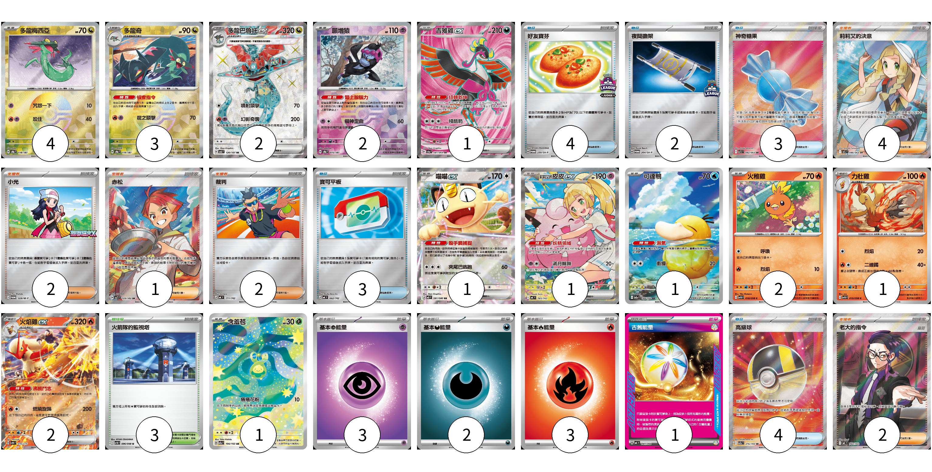 牌組構築方案 以此牌組為基礎新構築牌組 顯示卡面 顯示列表 寶可夢卡(21) 4 3 2 2 1 1 1 1 2 1 2 1 物品卡(16) 4 2 3 3 4 支援者卡(11) 4 2 1 2 2 競技場卡(3) 3 能量卡(9) 3 2 3 1 寶可夢卡(21) 卡牌名稱 張數 卡牌名稱 張數 多龍梅西亞 SV8a 118/187 04 多龍奇 SV8a 119/187 03 多龍巴魯托ex SV6 120/101 02 願增猿 SV8a 075/187 02 吉雉雞ex SV6a 081/064 01 喵喵ex M3 061/080 01 莉莉艾的皮皮ex MC 765/742 01 可達鴨 M2a 199/193 01 火稚雞 SV10 018/098 02 力壯雞 SV10 019/098 01 火焰雞ex SVM 016/175 02 含羞苞 M2a 196/193 01 物品卡(16) 卡牌名稱 張數 卡牌名稱 張數 好友寶芬 SV-P 230/SV-P 04 夜間擔架 SV-P 204/SV-P 02 神奇糖果 M1S 082/063 03 寶可平板 MC 662/742 03 高級球 M2a 216/193 04 支援者卡(11) 卡牌名稱 張數 卡牌名稱 張數 莉莉艾的決意 M1L 086/063 04 小光 M-P 028/M-P 02 赤松 SV7 123/102 01 裁判 MC 711/742 02 老大的指令(烏羽) MC 760/742 02 競技場卡(3) 卡牌名稱 張數 卡牌名稱 張數 火箭隊的監視塔 SV10 096/098 03 能量卡(9) 卡牌名稱 張數 卡牌名稱 張數 基本【超】能量 MC PSY 03 基本【惡】能量 MBG DAR 02 基本【火】能量 MC FIR 03 古舊能量 MC 741/742 01 以此牌組為基礎新構築牌組 牌組編碼 UDzfUM-wSoABR-AFoHwJ copy 列印牌組單 牌組編碼已複製 分享至SNS