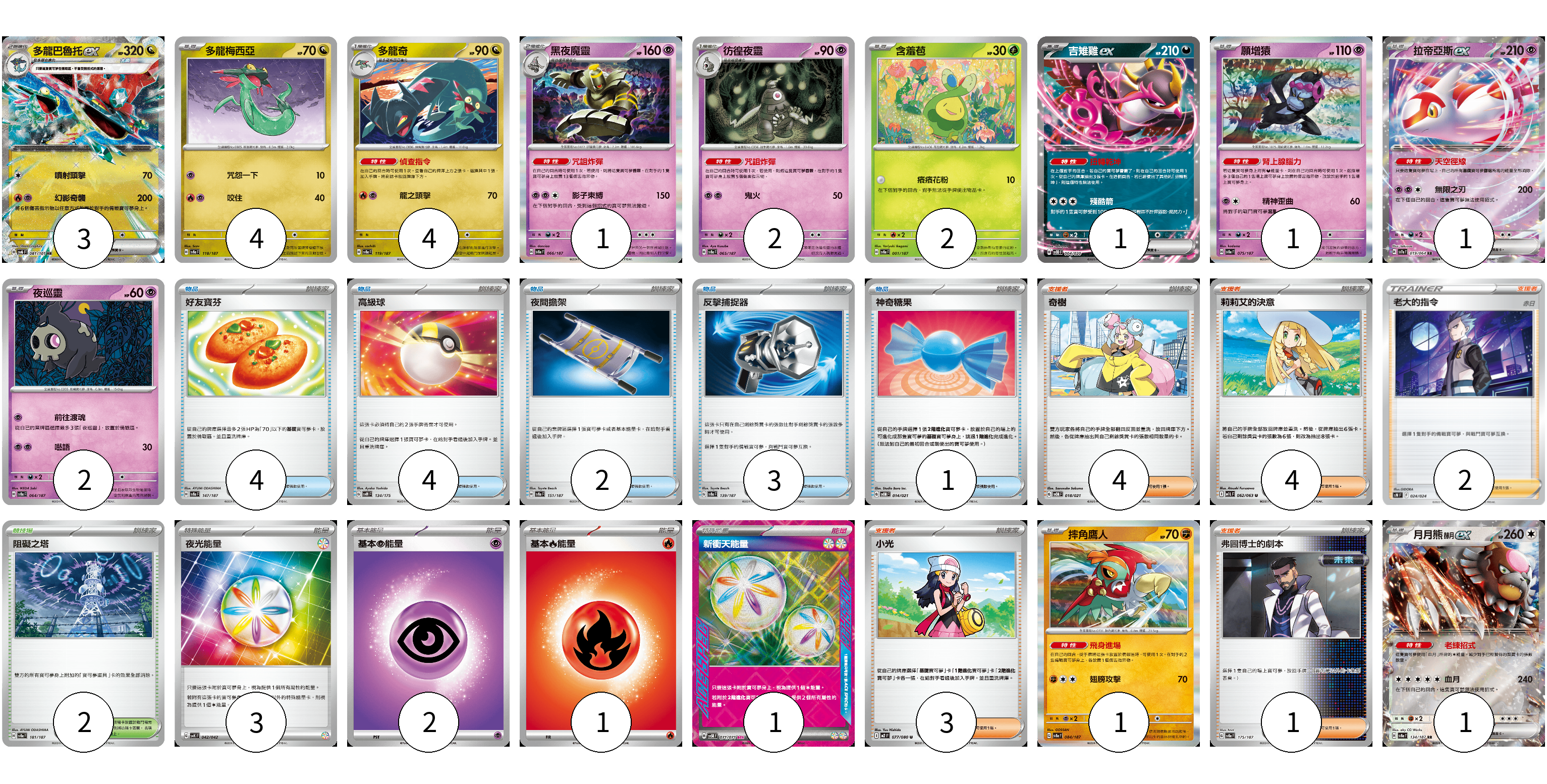 牌組構築方案 以此牌組為基礎新構築牌組 顯示卡面 顯示列表 寶可夢卡(23) 3 4 4 1 2 2 1 1 1 2 1 1 物品卡(14) 4 4 2 3 1 支援者卡(14) 4 4 2 3 1 競技場卡(2) 2 能量卡(7) 3 2 1 1 寶可夢卡(23) 卡牌名稱 張數 卡牌名稱 張數 多龍巴魯托ex SV6 081/101 03 多龍梅西亞 SV8a 118/187 04 多龍奇 SV8a 119/187 04 黑夜魔靈 SV8a 066/187 01 彷徨夜靈 SV8a 065/187 02 含羞苞 SV8a 001/187 02 吉雉雞ex SVOD 004/020 01 願增猿 SV8a 075/187 01 拉帝亞斯ex SV7a 019/064 01 夜巡靈 SV8a 064/187 02 摔角鷹人 SV8a 084/187 01 月月熊 赫月ex SV8a 134/187 01 物品卡(14) 卡牌名稱 張數 卡牌名稱 張數 好友寶芬 SV8a 147/187 04 高級球 SVM 134/175 04 夜間擔架 SV8a 151/187 02 反擊捕捉器 SV8a 139/187 03 神奇糖果 SVOM 014/021 01 支援者卡(14) 卡牌名稱 張數 卡牌名稱 張數 奇樹 SVOM 018/021 04 莉莉艾的決意 M1L 062/063 04 老大的指令(赤日) SN 024/024 02 小光 M2 077/080 03 弗圖博士的劇本 SV8a 175/187 01 競技場卡(2) 卡牌名稱 張數 卡牌名稱 張數 阻礙之塔 SV8a 181/187 02 能量卡(7) 卡牌名稱 張數 卡牌名稱 張數 夜光能量 SVK 042/042 03 基本【超】能量 MBD PSY 02 基本【火】能量 M-P FIR 01 新衝天能量 SV5K 071/071 01 以此牌組為基礎新構築牌組 牌組編碼 UETnrM-OIOMmi-GOCksq copy 列印牌組單 牌組編碼已複製 分享至SNS