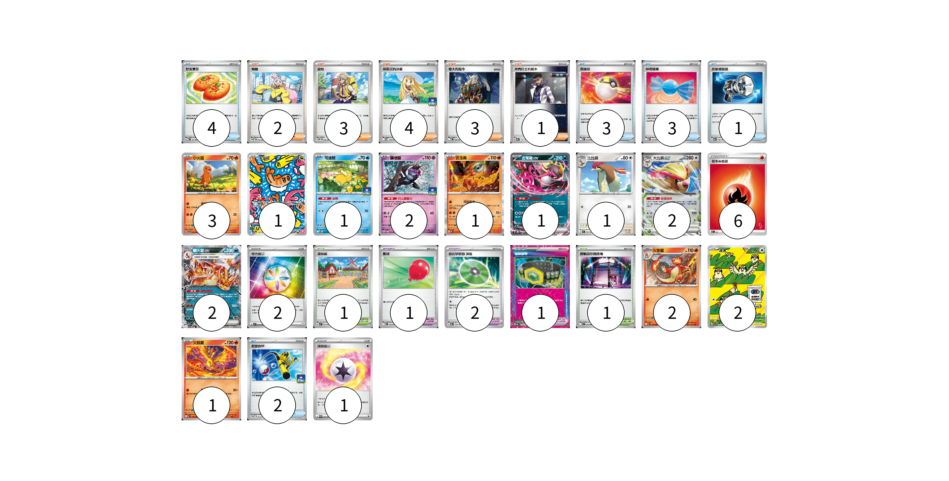 牌組構築方案 以此牌組為基礎新構築牌組 顯示卡面 顯示列表 寶可夢卡(19) 3 1 1 2 1 1 1 2 2 2 2 1 寶可夢道具(4) 1 2 1 物品卡(13) 4 3 3 1 2 支援者卡(13) 2 3 4 3 1 競技場卡(2) 1 1 能量卡(9) 6 2 1 寶可夢卡(19) 卡牌名稱 張數 卡牌名稱 張數 小火龍 SVTL 001/021 03 米立龍 SV6 112/101 01 可達鴨 SV-P 220/SV-P 01 願增猿 M-P 014/M-P 02 古玉魚 SV8a 025/187 01 吉雉雞ex SVOD 004/020 01 比比鳥 SVK 004/042 01 大比鳥ex SVK 005/042 02 噴火龍ex SVTL 006/021 02 火恐龍 M2 012/080 02 波波 SV3 118/108 02 火焰鳥 M2 014/080 01 寶可夢道具(4) 卡牌名稱 張數 卡牌名稱 張數 氣球 MBD 018/022 01 招式學習器 演進 SV8a 160/187 02 極限腰帶 SV8a 159/187 01 物品卡(13) 卡牌名稱 張數 卡牌名稱 張數 好友寶芬 MBD 013/022 04 高級球 MBD 014/022 03 神奇糖果 MBG 013/022 03 反擊捕捉器 SV8a 139/187 01 厲害釣竿 SV-P 112/SV-P 02 支援者卡(13) 卡牌名稱 張數 卡牌名稱 張數 奇樹 SVOD 016/020 02 派帕 SVOD 018/020 03 莉莉艾的決意 M-P 018/M-P 04 老大的指令 MBD 020/022 03 弗圖博士的劇本 SV8a 175/187 01 競技場卡(2) 卡牌名稱 張數 卡牌名稱 張數 深缽鎮 SVK 039/042 01 對戰圓形競技場 M2 079/080 01 能量卡(9) 卡牌名稱 張數 卡牌名稱 張數 基本火能量 SH FIR 06 夜光能量 SVK 042/042 02 薄霧能量 SV5M 071/071 01 以此牌組為基礎新構築牌組 牌組編碼 UEtvMC-yEvLoO-rLclFZ copy 列印牌組單 牌組編碼已複製 分享至SNS