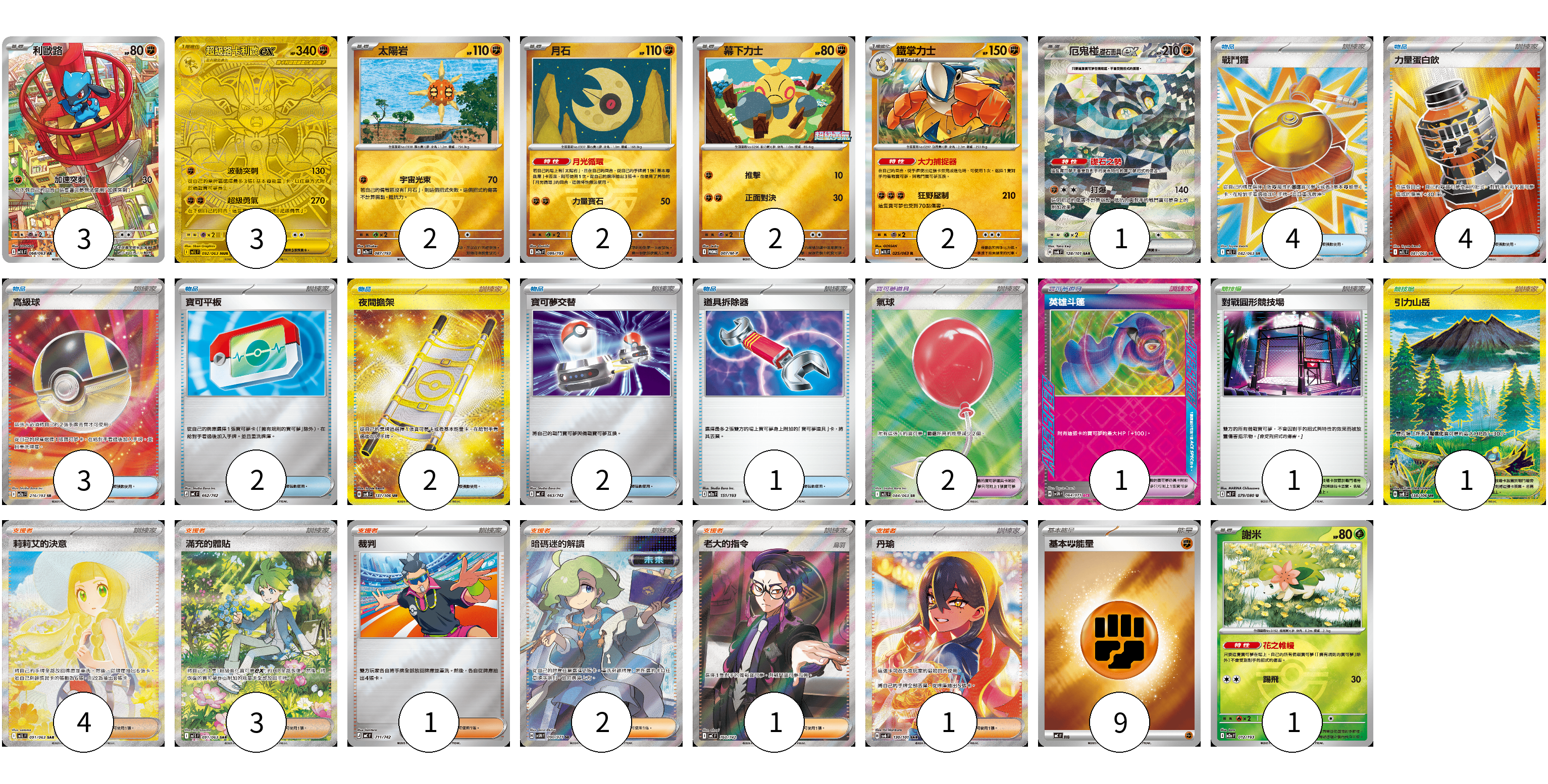 牌組構築方案 以此牌組為基礎新構築牌組 顯示卡面 顯示列表 寶可夢卡(16) 3 3 2 2 2 2 1 1 寶可夢道具(3) 2 1 物品卡(18) 4 4 3 2 2 2 1 支援者卡(12) 4 3 1 2 1 1 競技場卡(2) 1 1 能量卡(9) 9 寶可夢卡(16) 卡牌名稱 張數 卡牌名稱 張數 利歐路 M1L 068/063 03 超級路卡利歐ex M1L 092/063 03 太陽岩 M2a 087/193 02 月石 M2a 086/193 02 幕下力士 M-P 007/M-P 02 鐵掌力士 M1L 025/063 02 厄鬼椪 礎石面具ex SV6 128/101 01 謝米 M2a 012/193 01 寶可夢道具(3) 卡牌名稱 張數 卡牌名稱 張數 氣球 M1L 084/063 02 英雄斗篷 SV5M 064/071 01 物品卡(18) 卡牌名稱 張數 卡牌名稱 張數 戰鬥鑼 M1L 082/063 04 力量蛋白飲 M1L 081/063 04 高級球 M2a 216/193 03 寶可平板 MC 662/742 02 夜間擔架 SV8 137/106 02 寶可夢交替 MC 663/742 02 道具拆除器 M2a 151/193 01 支援者卡(12) 卡牌名稱 張數 卡牌名稱 張數 莉莉艾的決意 M1L 091/063 04 滿充的體貼 M1S 091/063 03 裁判 MC 711/742 01 暗碼迷的解讀 SV5M 090/071 02 老大的指令(烏羽) MC 760/742 01 丹瑜 SV6 130/101 01 競技場卡(2) 卡牌名稱 張數 卡牌名稱 張數 對戰圓形競技場 M2 079/080 01 引力山岳 SV8 138/106 01 能量卡(9) 卡牌名稱 張數 卡牌名稱 張數 基本【鬥】能量 MC FIG 09 以此牌組為基礎新構築牌組 牌組編碼 UGMKyi-AHGwFi-MXvelz copy 列印牌組單 牌組編碼已複製 分享至SNS