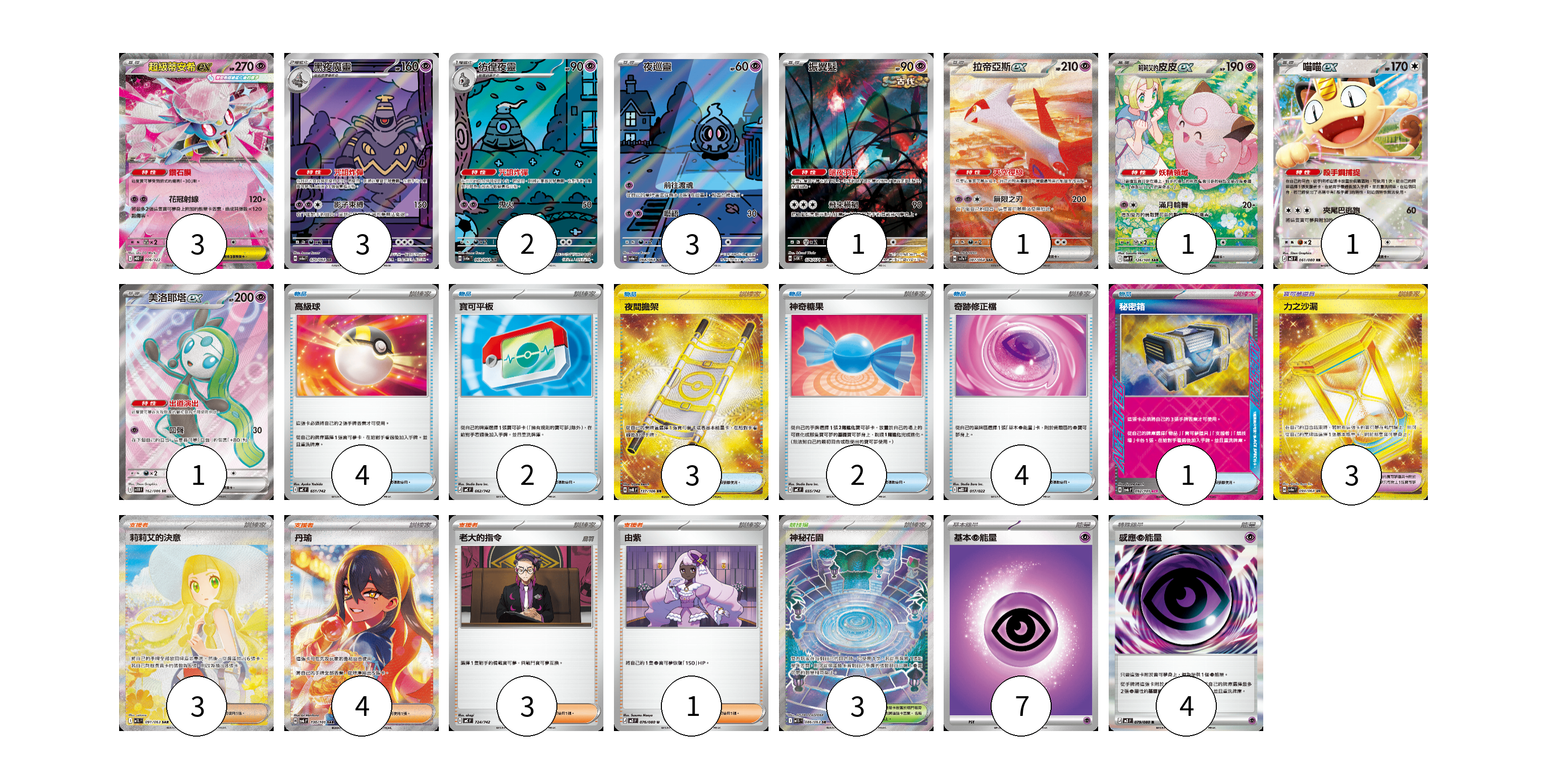 牌組構築方案 以此牌組為基礎新構築牌組 顯示卡面 顯示列表 寶可夢卡(16) 3 3 2 3 1 1 1 1 1 寶可夢道具(3) 3 物品卡(16) 4 2 3 2 4 1 支援者卡(11) 3 4 3 1 競技場卡(3) 3 能量卡(11) 7 4 寶可夢卡(16) 卡牌名稱 張數 卡牌名稱 張數 超級蒂安希ex MBD 006/022 03 黑夜魔靈 SV6a 070/064 03 彷徨夜靈 SV6a 069/064 02 夜巡靈 SV6a 068/064 03 振翼髮 SV5K 076/071 01 拉帝亞斯ex SV7a 087/064 01 莉莉艾的皮皮ex SV9 126/100 01 喵喵ex M3 061/080 01 美洛耶塔ex SV11B 162/086 01 寶可夢道具(3) 卡牌名稱 張數 卡牌名稱 張數 力之沙漏 SV6a 094/064 03 物品卡(16) 卡牌名稱 張數 卡牌名稱 張數 高級球 MC 651/742 04 寶可平板 MC 662/742 02 夜間擔架 SV8 137/106 03 神奇糖果 MC 655/742 02 奇跡修正檔 MBD 017/022 04 秘密箱 SV6 092/101 01 支援者卡(11) 卡牌名稱 張數 卡牌名稱 張數 莉莉艾的決意 M1L 091/063 03 丹瑜 SV6 130/101 04 老大的指令 MC 724/742 03 由紫 M3 076/080 01 競技場卡(3) 卡牌名稱 張數 卡牌名稱 張數 神秘花園 M1S 086/063 03 能量卡(11) 卡牌名稱 張數 卡牌名稱 張數 基本【超】能量 MC PSY 07 感應【超】能量 M3 079/080 04 以此牌組為基礎新構築牌組 牌組編碼 UIevJq-bTMCyx-JtYIcs copy 列印牌組單 牌組編碼已複製 分享至SNS
