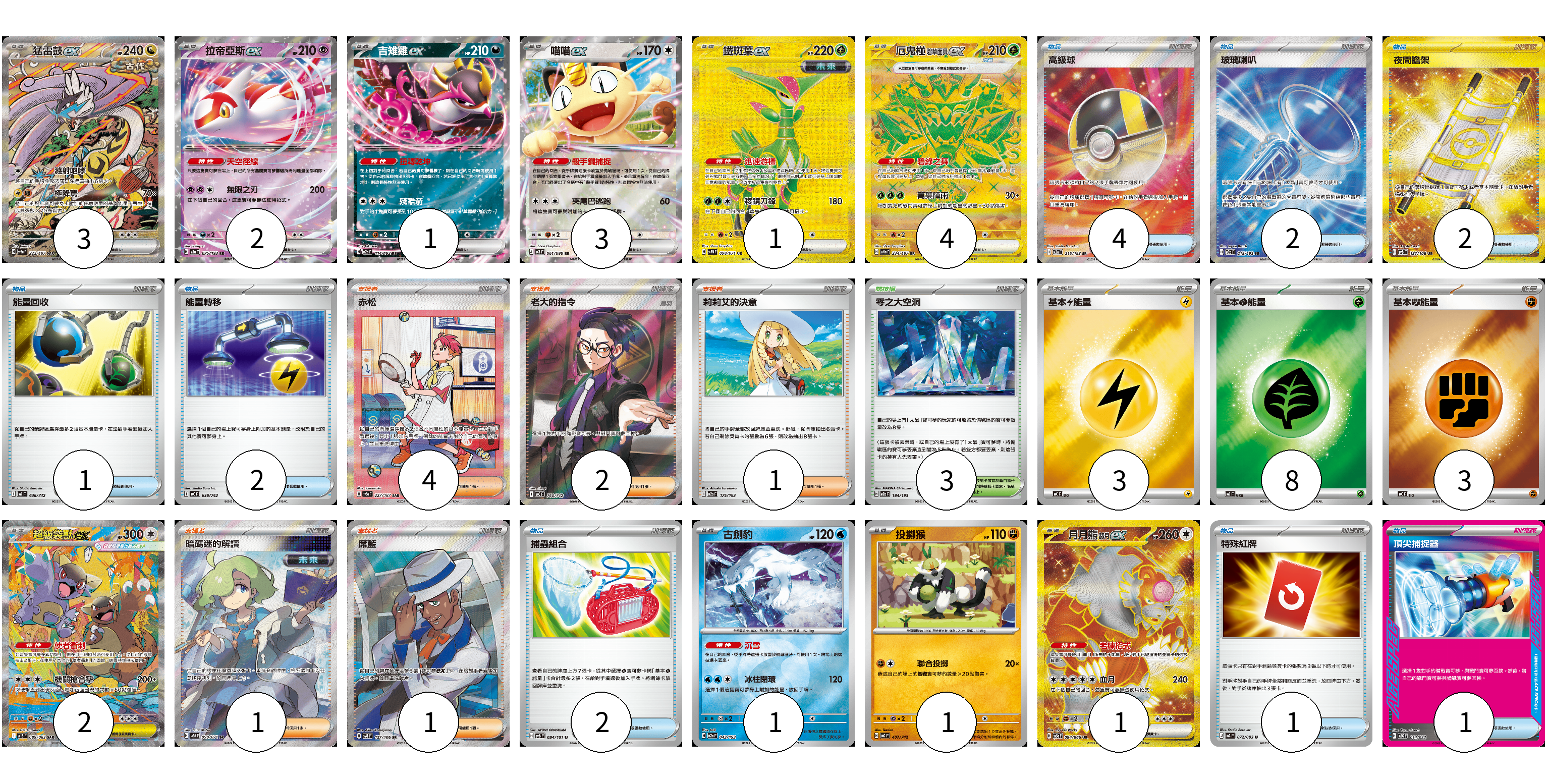 牌組構築方案 以此牌組為基礎新構築牌組 顯示卡面 顯示列表 寶可夢卡(19) 3 2 1 3 1 4 2 1 1 1 物品卡(15) 4 2 2 1 2 2 1 1 支援者卡(9) 4 2 1 1 1 競技場卡(3) 3 能量卡(14) 3 8 3 寶可夢卡(19) 卡牌名稱 張數 卡牌名稱 張數 猛雷鼓ex SV8a 222/187 03 拉帝亞斯ex M2a 075/193 02 吉雉雞ex M2a 114/193 01 喵喵ex M3 061/080 03 鐵斑葉ex SV5M 098/071 01 厄鬼椪 碧草面具ex SV8a 234/187 04 超級袋獸ex M1S 089/063 02 古劍豹 M2a 043/193 01 投擲猴 MC 407/742 01 月月熊 赫月 ex SV5a 094/066 01 物品卡(15) 卡牌名稱 張數 卡牌名稱 張數 高級球 M2a 216/193 04 玻璃喇叭 M2a 215/193 02 夜間擔架 SV8 137/106 02 能量回收 MC 636/742 01 能量轉移 MC 638/742 02 捕蟲組合 SV6 094/101 02 特殊紅牌 M4 072/083 01 頂尖捕捉器 MBG 014/022 01 支援者卡(9) 卡牌名稱 張數 卡牌名稱 張數 赤松 SV8a 227/187 04 老大的指令(烏羽) MC 760/742 02 莉莉艾的決意 M2a 175/193 01 暗碼迷的解讀 SV5M 090/071 01 席藍 SV8 127/106 01 競技場卡(3) 卡牌名稱 張數 卡牌名稱 張數 零之大空洞 M2a 184/193 03 能量卡(14) 卡牌名稱 張數 卡牌名稱 張數 基本【雷】能量 MC LIG 03 基本【草】能量 MC GRA 08 基本【鬥】能量 MC FIG 03 以此牌組為基礎新構築牌組 牌組編碼 UIhcwJ-TxHkrE-YoRBVi copy 列印牌組單 牌組編碼已複製 分享至SNS