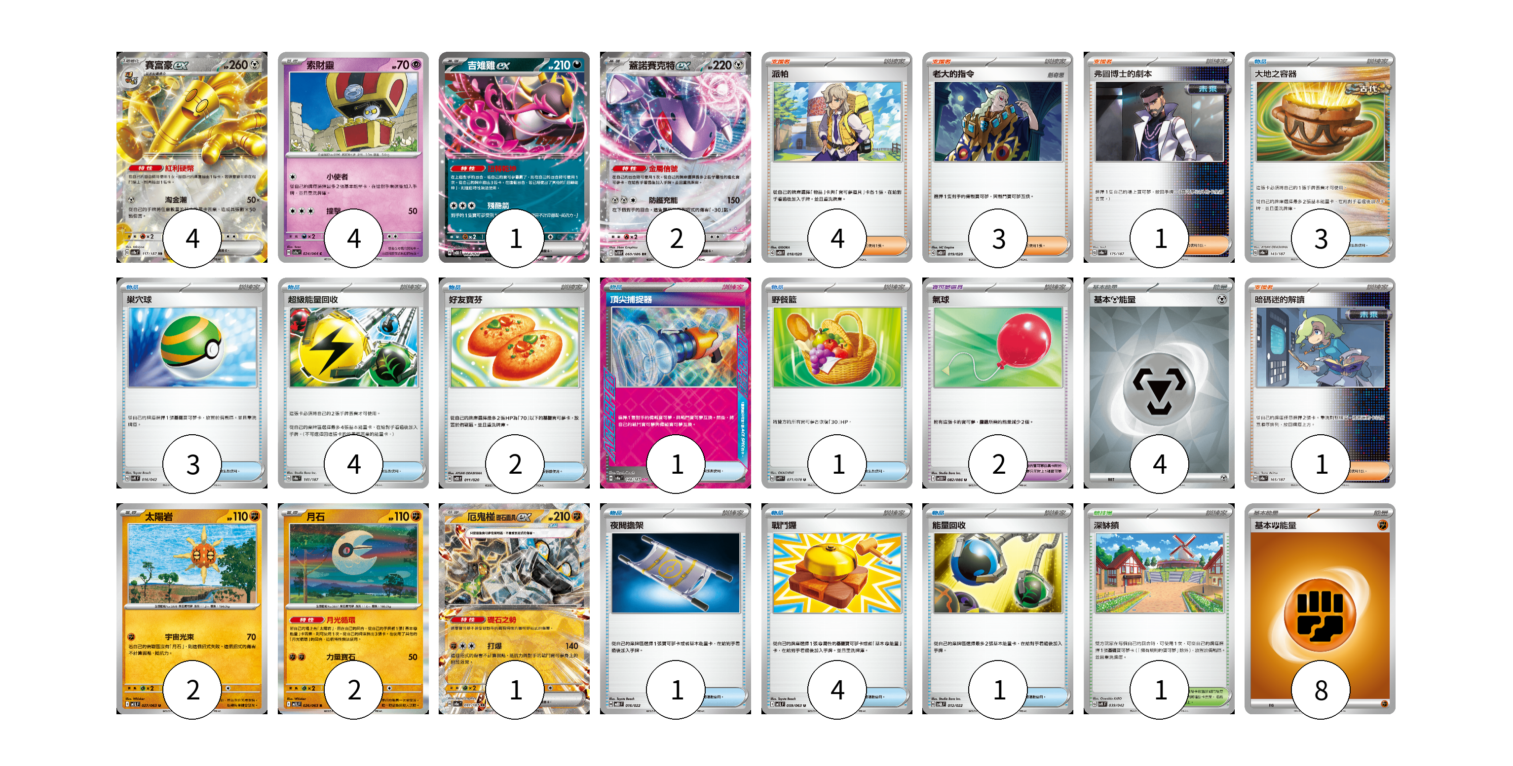 牌組構築方案 以此牌組為基礎新構築牌組 顯示卡面 顯示列表 寶可夢卡(16) 4 4 1 2 2 2 1 寶可夢道具(2) 2 物品卡(20) 3 3 4 2 1 1 1 4 1 支援者卡(9) 4 3 1 1 競技場卡(1) 1 能量卡(12) 4 8 寶可夢卡(16) 卡牌名稱 張數 卡牌名稱 張數 賽富豪ex SV8a 117/187 04 索財靈 SV7a 024/064 04 吉雉雞ex SVOD 004/020 01 蓋諾賽克特ex SV11B 069/086 02 太陽岩 M1L 027/063 02 月石 M1L 026/063 02 厄鬼椪 礎石面具ex SV8a 091/187 01 寶可夢道具(2) 卡牌名稱 張數 卡牌名稱 張數 氣球 SV11B 082/086 02 物品卡(20) 卡牌名稱 張數 卡牌名稱 張數 大地之容器 SV8a 143/187 03 巢穴球 SVK 016/042 03 超級能量回收 SV8a 141/187 04 好友寶芬 SVOD 011/020 02 頂尖捕捉器 SV8a 148/187 01 野餐籃 SV1V 071/078 01 夜間擔架 MBD 016/022 01 戰鬥鑼 M1L 059/063 04 能量回收 SVQL 012/022 01 支援者卡(9) 卡牌名稱 張數 卡牌名稱 張數 派帕 SVOD 018/020 04 老大的指令 SVOD 019/020 03 弗圖博士的劇本 SV8a 175/187 01 暗碼迷的解讀 SV8a 165/187 01 競技場卡(1) 卡牌名稱 張數 卡牌名稱 張數 深缽鎮 SVK 039/042 01 能量卡(12) 卡牌名稱 張數 卡牌名稱 張數 基本【鋼】能量 SVOD MET 04 基本鬥能量 sv-p FIG 08 以此牌組為基礎新構築牌組 牌組編碼 UPLrXW-NjvFsY-MnVrjG copy 列印牌組單 牌組編碼已複製 分享至SNS