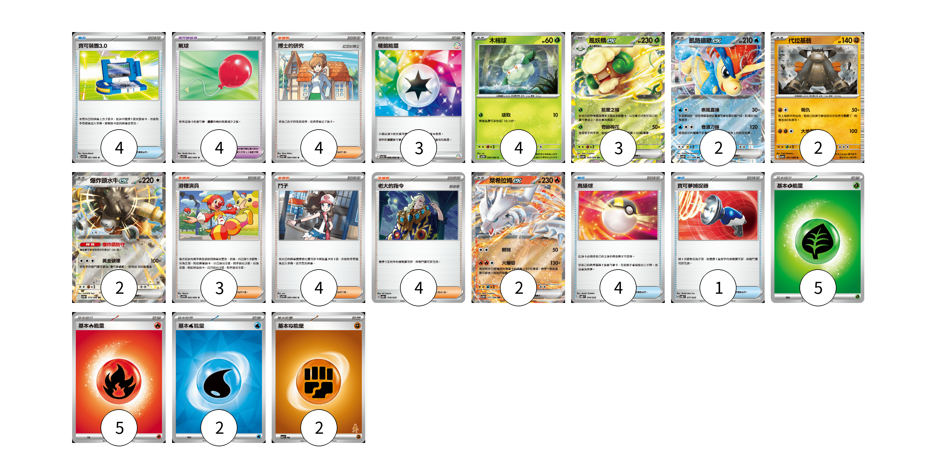 牌組構築方案 以此牌組為基礎新構築牌組 顯示卡面 顯示列表 寶可夢卡(15) 4 3 2 2 2 2 寶可夢道具(4) 4 物品卡(9) 4 4 1 支援者卡(15) 4 3 4 4 能量卡(17) 3 5 5 2 2 寶可夢卡(15) 卡牌名稱 張數 卡牌名稱 張數 木棉球 SV11W 004/086 04 風妖精ex SV11W 005/086 03 凱路迪歐ex SV11W 027/086 02 代拉基翁 SV11W 051/086 02 爆炸頭水牛ex SV11W 075/086 02 萊希拉姆ex SV11W 017/086 02 寶可夢道具(4) 卡牌名稱 張數 卡牌名稱 張數 氣球 SV11B 082/086 04 物品卡(9) 卡牌名稱 張數 卡牌名稱 張數 寶可裝置3.0 SV11B 081/086 04 高級球 MBD 014/022 04 寶可夢捕捉器 SVQL 017/022 01 支援者卡(15) 卡牌名稱 張數 卡牌名稱 張數 博士的研究 SV11B 084/086 04 滑稽演員 SV11W 083/086 03 鬥子 SV11W 085/086 04 老大的指令 SVOD 019/020 04 能量卡(17) 卡牌名稱 張數 卡牌名稱 張數 稜鏡能量 SV11B 086/086 03 基本【草】能量 M-P GRA 05 基本【火】能量 M-P FIR 05 基本【水】能量 SVK WAT 02 基本【鬥】能量 SVI FIG 02 以此牌組為基礎新構築牌組 牌組編碼 UPfDtd-dKrehS-wJUTZH copy 列印牌組單 牌組編碼已複製 分享至SNS