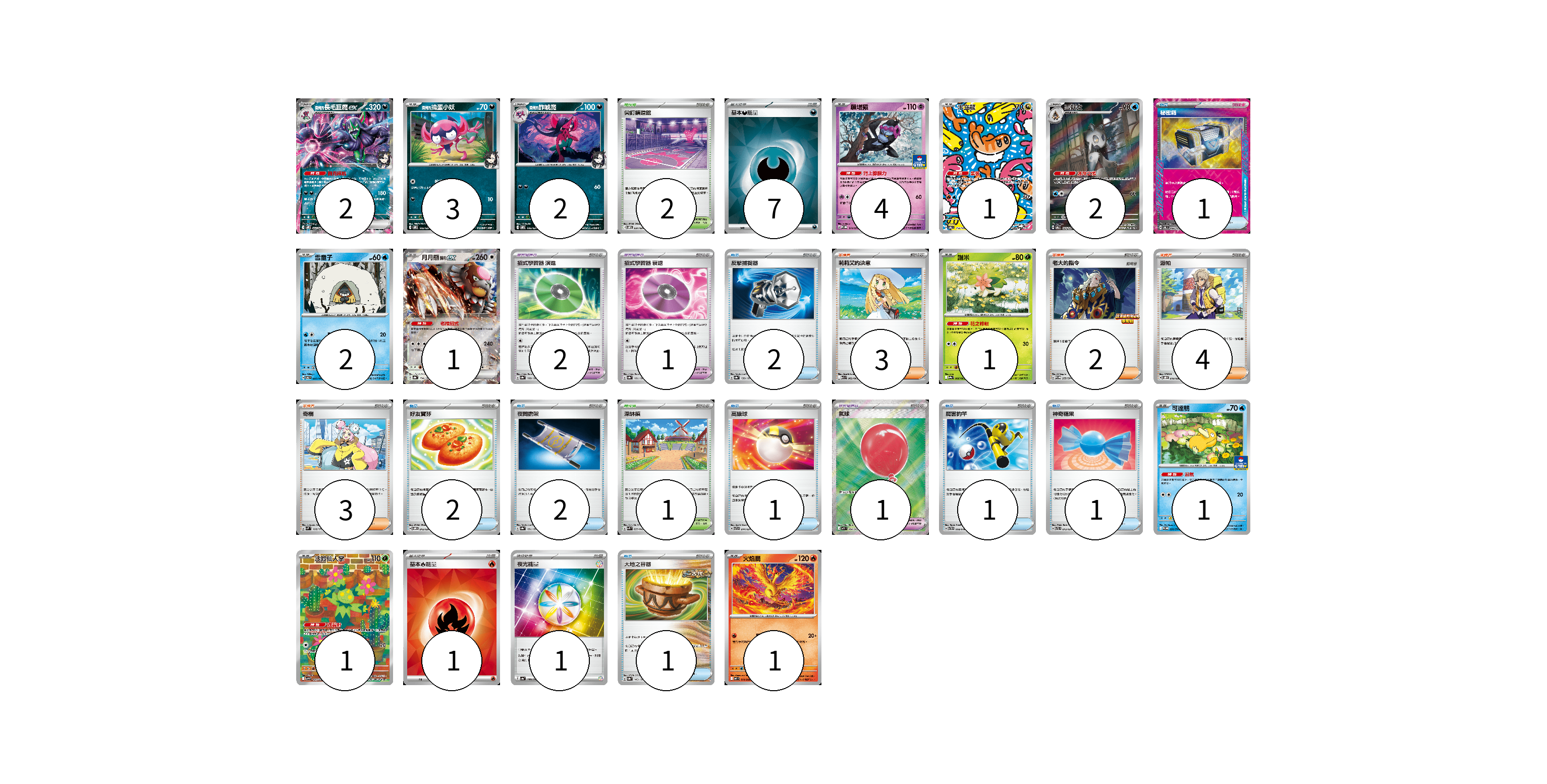 牌組構築方案 以此牌組為基礎新構築牌組 顯示卡面 顯示列表 寶可夢卡(21) 2 3 2 4 1 2 2 1 1 1 1 1 寶可夢道具(4) 2 1 1 物品卡(11) 1 2 2 2 1 1 1 1 支援者卡(12) 3 2 4 3 競技場卡(3) 2 1 能量卡(9) 7 1 1 寶可夢卡(21) 卡牌名稱 張數 卡牌名稱 張數 <瑪俐的>長毛巨魔ex SVOM 007/021 02 <瑪俐的>搗蛋小妖 SVOM 005/021 03 <瑪俐的>詐唬魔 SVOM 006/021 02 願增猿 M-P 014/M-P 04 米立龍 SV6 112/101 01 雪妖女 SV6 104/101 02 雪童子 SV6 031/101 02 月月熊 赫月ex SV8a 134/187 01 謝米 SV9a 006/063 01 可達鴨 SV-P 220/SV-P 01 沙鈴仙人掌 SV9 101/100 01 火焰鳥 M2 014/080 01 寶可夢道具(4) 卡牌名稱 張數 卡牌名稱 張數 招式學習器 演進 SV8a 160/187 02 招式學習器 衰退 SV8a 161/187 01 氣球 M1L 084/063 01 物品卡(11) 卡牌名稱 張數 卡牌名稱 張數 秘密箱 SV6 092/101 01 反擊捕捉器 SV8a 139/187 02 好友寶芬 SVOM 012/021 02 夜間擔架 SV8a 151/187 02 高級球 SVTR 014/021 01 厲害釣竿 SVTH 008/018 01 神奇糖果 SVTL 013/021 01 大地之容器 SV8a 143/187 01 支援者卡(12) 卡牌名稱 張數 卡牌名稱 張數 莉莉艾的決意 M1L 062/063 03 老大的指令 SV-P 255/SV-P 02 派帕 SVOD 018/020 04 奇樹 SVM 160/175 03 競技場卡(3) 卡牌名稱 張數 卡牌名稱 張數 尖釘鎮道館 SVOM 021/021 02 深缽鎮 SVK 039/042 01 能量卡(9) 卡牌名稱 張數 卡牌名稱 張數 基本【惡】能量 SVOM DAR 07 基本【火】能量 SVQL FIR 01 夜光能量 SV4a 190/190 01 以此牌組為基礎新構築牌組 牌組編碼 UUgZNT-RHtCKy-vzBhIX copy 列印牌組單 牌組編碼已複製 分享至SNS