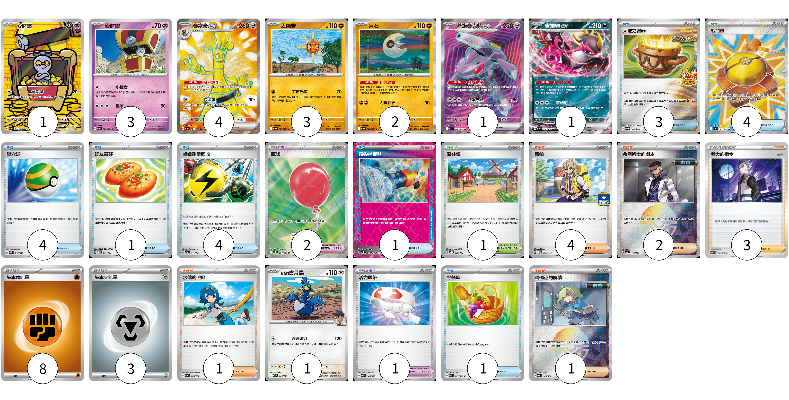 牌組構築方案 以此牌組為基礎新構築牌組 顯示卡面 顯示列表 寶可夢卡(16) 1 3 4 3 2 1 1 1 寶可夢道具(3) 2 1 物品卡(18) 3 4 4 1 4 1 1 支援者卡(11) 4 2 3 1 1 競技場卡(1) 1 能量卡(11) 8 3 寶可夢卡(16) 卡牌名稱 張數 卡牌名稱 張數 索財靈 SV3a 068/062 01 索財靈 SV7a 024/064 03 賽富豪ex SV3a 079/062 04 太陽岩 M1L 027/063 03 月石 M1L 026/063 02 蓋諾賽克特ex SV11B 164/086 01 吉雉雞ex SV6a 038/064 01 赫普的古月鳥 M2a 143/193 01 寶可夢道具(3) 卡牌名稱 張數 卡牌名稱 張數 氣球 M1L 084/063 02 活力頭帶 SVM 140/175 01 物品卡(18) 卡牌名稱 張數 卡牌名稱 張數 大地之容器 SV-P 084/SV-P 03 戰鬥鑼 M1L 082/063 04 巢穴球 SVTG 012/019 04 好友寶芬 MBG 011/022 01 超級能量回收 SV8a 141/187 04 頂尖捕捉器 SV5M 062/071 01 野餐籃 SV1V 071/078 01 支援者卡(11) 卡牌名稱 張數 卡牌名稱 張數 派帕 SV-P 213/SV-P 04 弗圖博士的劇本 SV8a 175/187 02 老大的指令(赤日) SK 025/030 03 水蓮的照顧 SV8a 168/187 01 暗碼迷的解讀 SV8a 165/187 01 競技場卡(1) 卡牌名稱 張數 卡牌名稱 張數 深缽鎮 SVK 039/042 01 能量卡(11) 卡牌名稱 張數 卡牌名稱 張數 基本【鬥】能量 SVD FIG 08 基本【鋼】能量 SVB MET 03 以此牌組為基礎新構築牌組 牌組編碼 UVuHFg-HIZgTd-LOFcag copy 列印牌組單 牌組編碼已複製 分享至SNS