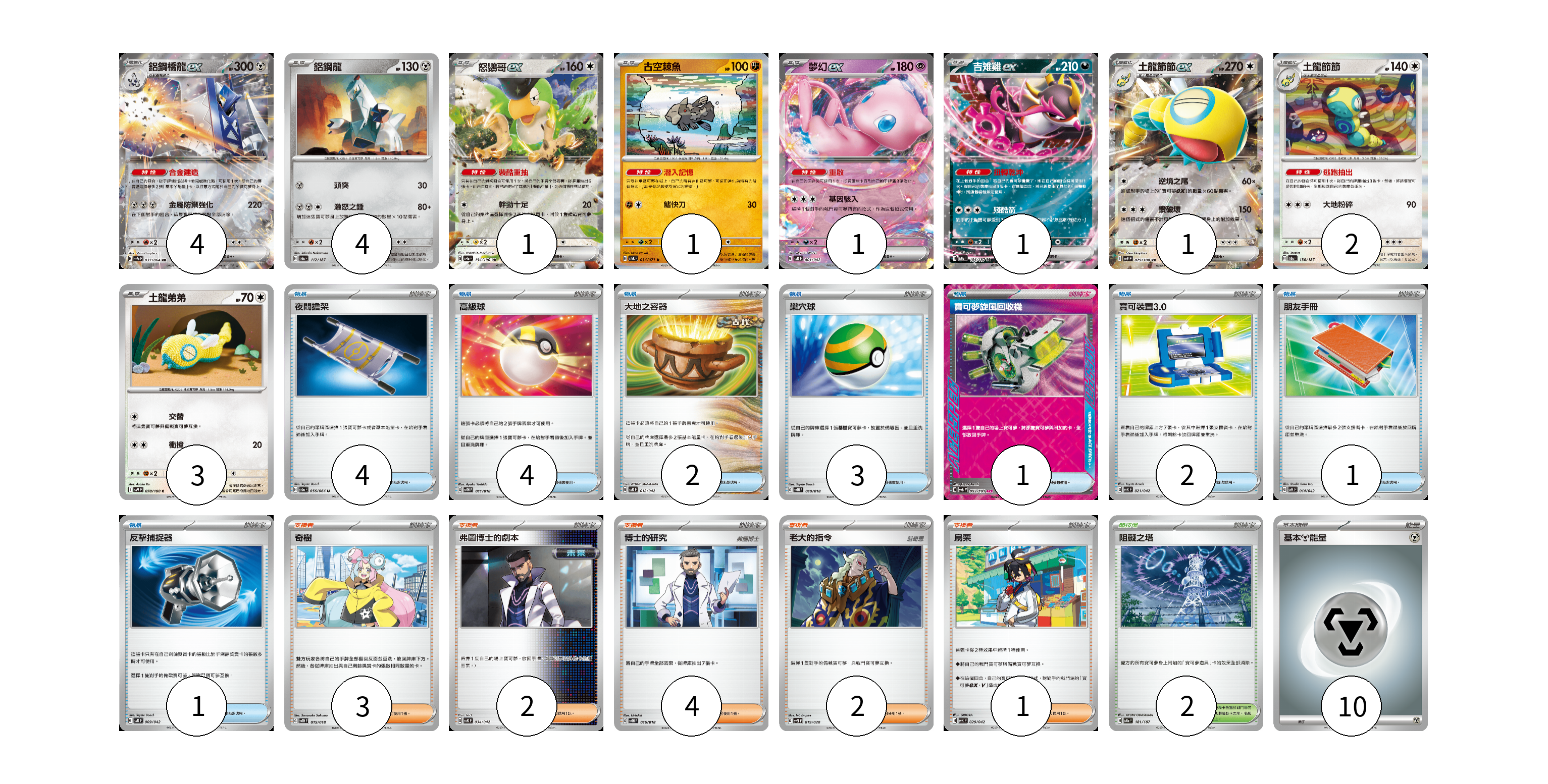 牌組構築方案 以此牌組為基礎新構築牌組 顯示卡面 顯示列表 寶可夢卡(18) 4 4 1 1 1 1 1 2 3 物品卡(18) 4 4 2 3 1 2 1 1 支援者卡(12) 3 2 4 2 1 競技場卡(2) 2 能量卡(10) 10 寶可夢卡(18) 卡牌名稱 張數 卡牌名稱 張數 鋁鋼橋龍ex SV7a 037/064 04 鋁鋼龍 SV8a 112/187 04 怒鸚哥ex SV4a 154/190 01 古空棘魚 SV5K 034/071 01 夢幻ex SVK 001/042 01 吉雉雞ex SV8a 104/187 01 土龍節節ex SV9 079/100 01 土龍節節 SV8a 130/187 02 土龍弟弟 SV9 078/100 03 物品卡(18) 卡牌名稱 張數 卡牌名稱 張數 夜間擔架 SV6a 056/064 04 高級球 SVTH 011/018 04 大地之容器 SVK 012/042 02 巢穴球 SVTH 010/018 03 寶可夢旋風回收機 SV6 093/101 01 寶可裝置3.0 SVK 021/042 02 朋友手冊 SVK 014/042 01 反擊捕捉器 SVK 009/042 01 支援者卡(12) 卡牌名稱 張數 卡牌名稱 張數 奇樹 SVTH 015/018 03 弗圖博士的劇本 SVK 034/042 02 博士的研究 SVTH 016/018 04 老大的指令 SVEL 019/020 02 烏栗 SVK 029/042 01 競技場卡(2) 卡牌名稱 張數 卡牌名稱 張數 阻礙之塔 SV8a 181/187 02 能量卡(10) 卡牌名稱 張數 卡牌名稱 張數 基本鋼能量 sv-p MET 10 以此牌組為基礎新構築牌組 牌組編碼 UXWGaH-EciRep-xclfoA copy 列印牌組單 牌組編碼已複製 分享至SNS