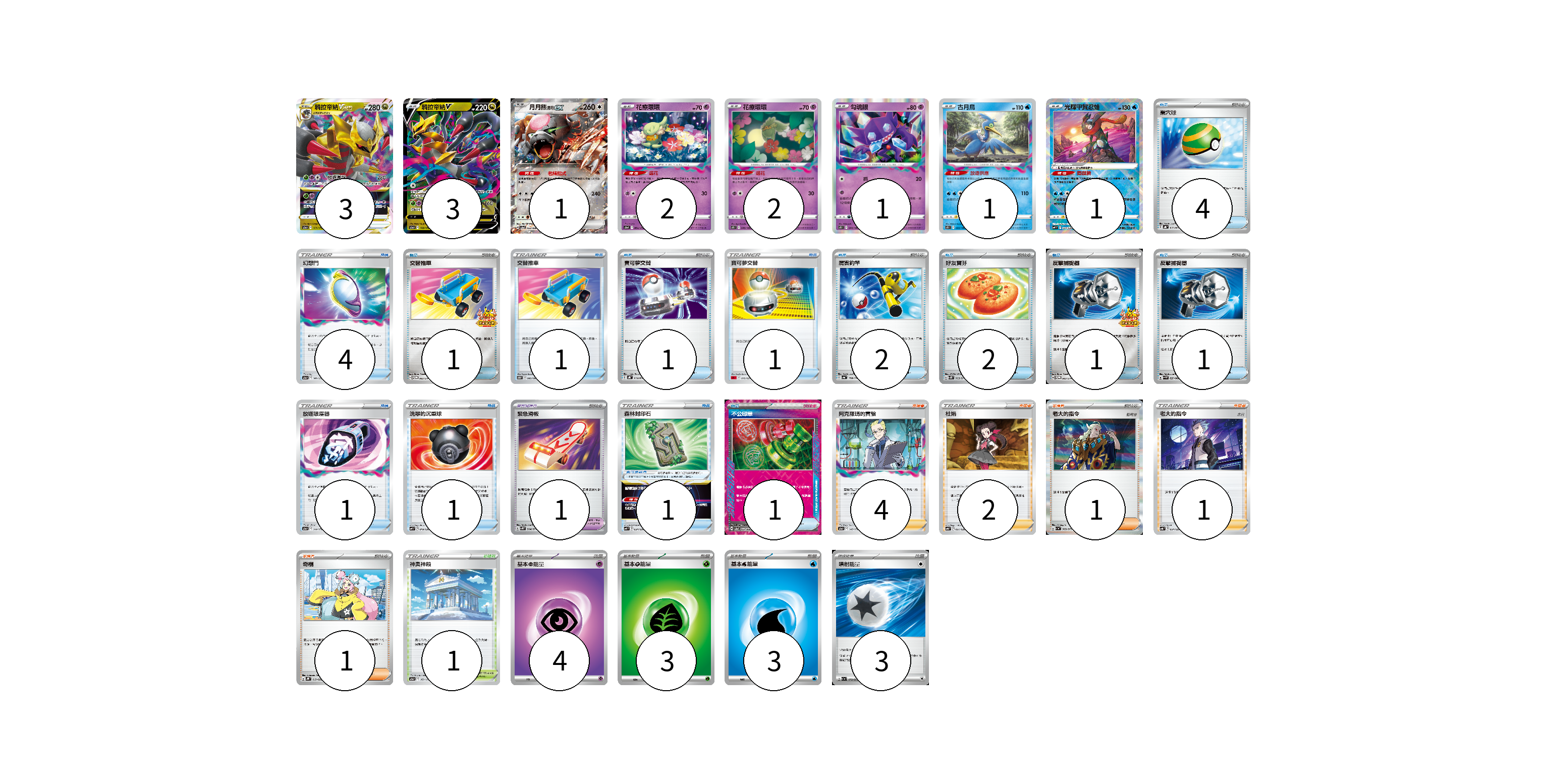 牌組構築方案 以此牌組為基礎新構築牌組 顯示卡面 顯示列表 寶可夢卡(14) 3 3 1 2 2 1 1 1 寶可夢道具(1) 1 物品卡(22) 4 4 1 1 1 1 2 2 1 1 1 1 1 1 支援者卡(9) 4 2 1 1 1 競技場卡(1) 1 能量卡(13) 4 3 3 3 寶可夢卡(14) 卡牌名稱 張數 卡牌名稱 張數 騎拉帝納VSTAR S12a 111/172 03 騎拉帝納V S12a 110/172 03 月月熊 赫月 ex SV5a 052/066 01 花療環環 S12a 064/172 02 花療環環 S11 049/100 02 勾魂眼 S11 044/100 01 古月鳥 S11 033/100 01 光輝甲賀忍蛙 SVF 004/038 01 寶可夢道具(1) 卡牌名稱 張數 卡牌名稱 張數 緊急滑板 SV5K 064/071 01 物品卡(22) 卡牌名稱 張數 卡牌名稱 張數 巢穴球 SVHK 012/022 04 幻想門 S12a 141/172 04 交替推車 SV-P 082/SV-P 01 交替推車 S10D 060/067 01 寶可夢交替 SVHK 014/022 01 寶可夢交替 SDL 015/021 01 厲害釣竿 SV4a 158/190 02 好友寶芬 SV5K 063/071 02 反擊捕捉器 SV-P 083/SV-P 01 反擊捕捉器 SV4M 059/066 01 放逐吸塵器 S12a 144/172 01 洗翠的沉重球 SVF 019/038 01 森林封印石 SVF 024/038 01 不公印章 SV5a 053/066 01 支援者卡(9) 卡牌名稱 張數 卡牌名稱 張數 阿克羅瑪的實驗 S12a 148/172 04 杜娟 SVB 021/028 02 老大的指令 SV1a 069/073 01 老大的指令(赤日) SVB 024/028 01 奇樹 SVHK 019/022 01 競技場卡(1) 卡牌名稱 張數 卡牌名稱 張數 神奧神殿 S12a 169/172 01 能量卡(13) 卡牌名稱 張數 卡牌名稱 張數 基本【超】能量 SVHM PSY 04 基本【草】能量 SVF GRA 03 基本【水】能量 SVAW WAT 03 噴射能量 SV1a 072/073 03 以此牌組為基礎新構築牌組 牌組編碼 UYpRRA-rMzCbM-zZOHDV copy 列印牌組單 牌組編碼已複製 分享至SNS
