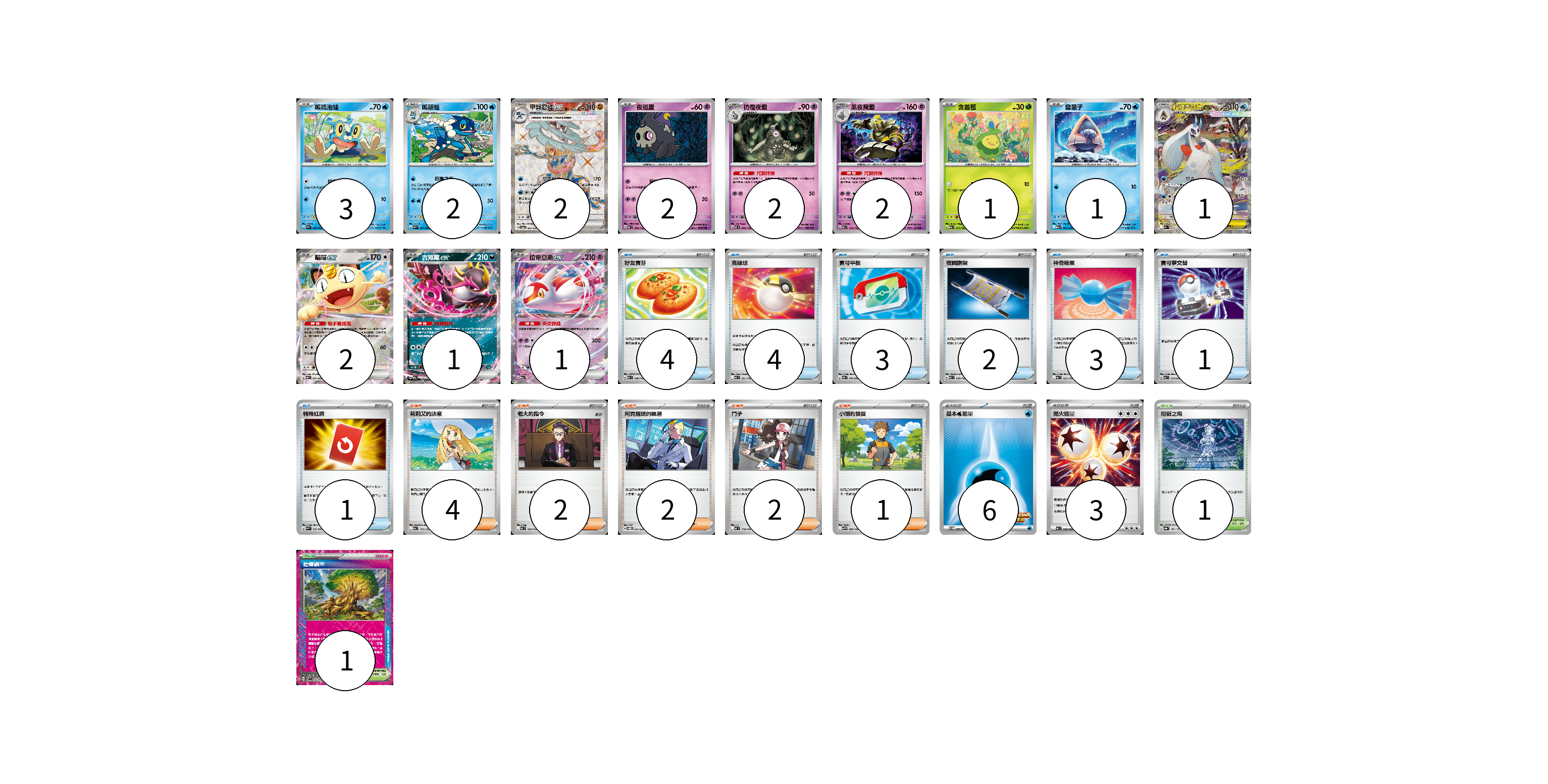 牌組構築方案 以此牌組為基礎新構築牌組 顯示卡面 顯示列表 寶可夢卡(20) 3 2 2 2 2 2 1 1 1 2 1 1 物品卡(18) 4 4 3 2 3 1 1 支援者卡(11) 4 2 2 2 1 競技場卡(2) 1 1 能量卡(9) 6 3 寶可夢卡(20) 卡牌名稱 張數 卡牌名稱 張數 呱呱泡蛙 M4 020/083 03 呱頭蛙 M4 021/083 02 甲賀忍蛙ex SV5a 083/066 02 夜巡靈 MC 308/742 02 彷徨夜靈 MC 309/742 02 黑夜魔靈 MC 310/742 02 含羞苞 M2a 011/193 01 雪童子 M2a 035/193 01 超級雪妖女ex M2a 233/193 01 喵喵ex M3 061/080 02 吉雉雞ex M2a 114/193 01 拉帝亞斯ex M2a 075/193 01 物品卡(18) 卡牌名稱 張數 卡牌名稱 張數 好友寶芬 MC 648/742 04 高級球 MC 651/742 04 寶可平板 M3 070/080 03 夜間擔架 MC 670/742 02 神奇糖果 MC 655/742 03 寶可夢交替 MJ 019/022 01 特殊紅牌 M4 072/083 01 支援者卡(11) 卡牌名稱 張數 卡牌名稱 張數 莉莉艾的決意 M2a 175/193 04 老大的指令 MC 724/742 02 阿克羅瑪的執著 SVOM 017/021 02 鬥子 MC 718/742 02 小剛的發掘 SV9 096/100 01 競技場卡(2) 卡牌名稱 張數 卡牌名稱 張數 阻礙之塔 SV8a 181/187 01 壯偉碩木 SV7 101/102 01 能量卡(9) 卡牌名稱 張數 卡牌名稱 張數 基本【水】能量 SV-P 259/SV-P 06 燃火能量 MC 736/742 03 以此牌組為基礎新構築牌組 牌組編碼 UaRGOm-HliDcn-xiaCHJ copy 列印牌組單 牌組編碼已複製 分享至SNS