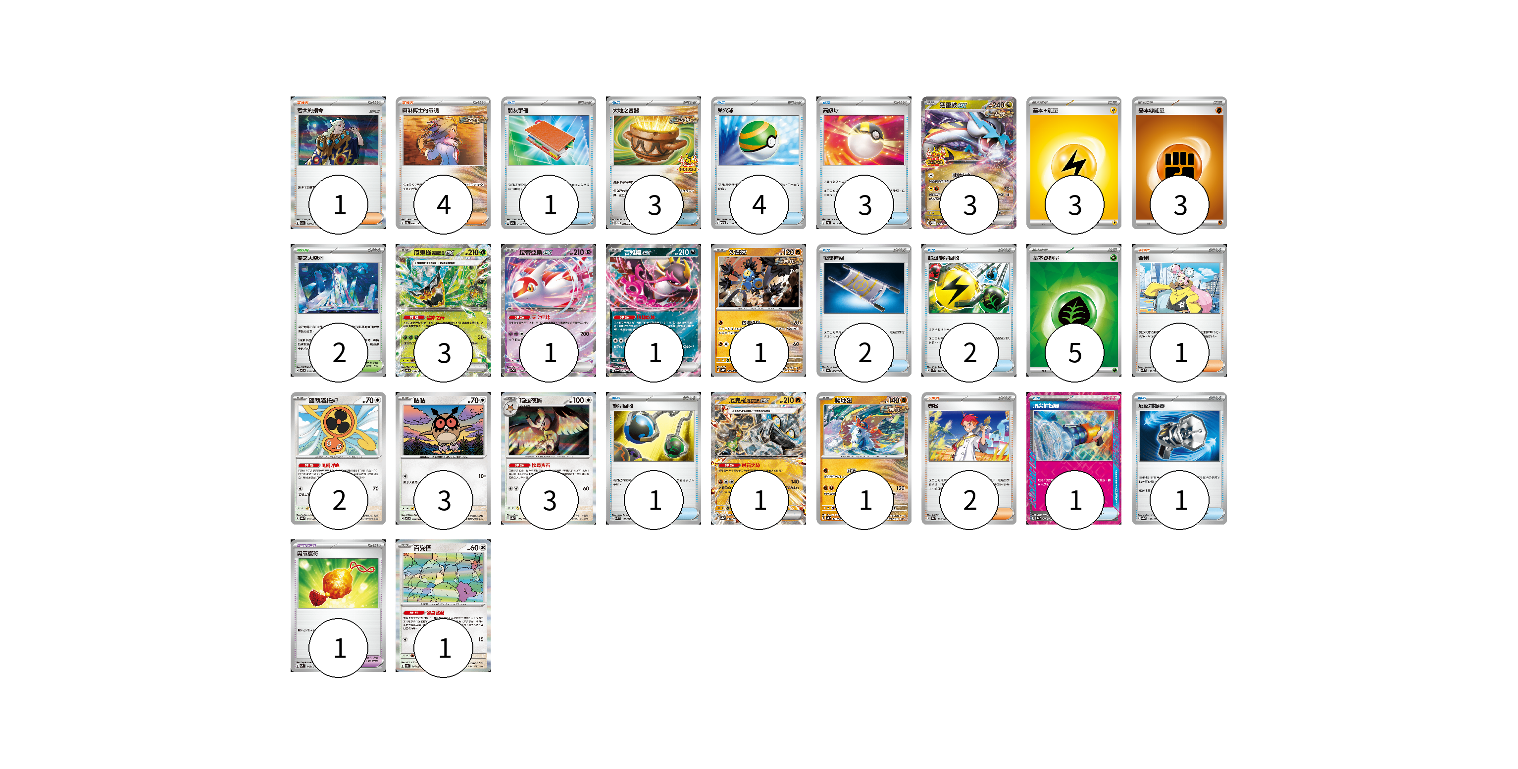 牌組構築方案 以此牌組為基礎新構築牌組 顯示卡面 顯示列表 寶可夢卡(20) 3 3 1 1 1 2 3 3 1 1 1 寶可夢道具(1) 1 物品卡(18) 1 3 4 3 2 2 1 1 1 支援者卡(8) 1 4 1 2 競技場卡(2) 2 能量卡(11) 3 3 5 寶可夢卡(20) 卡牌名稱 張數 卡牌名稱 張數 猛雷鼓ex SV-P 081/SV-P 03 厄鬼椪 碧草面具ex SV6 016/101 03 拉帝亞斯ex SV7a 019/064 01 吉雉雞ex SV6a 038/064 01 沙鐵皮 SVHK 009/022 01 旋轉洛托姆 SV8a 131/187 02 咕咕 SV7 076/102 03 貓頭夜鷹 SV8a 128/187 03 厄鬼椪 礎石面具ex SV8a 091/187 01 爬地翅 SV4K 041/066 01 百變怪 SV4a 144/190 01 寶可夢道具(1) 卡牌名稱 張數 卡牌名稱 張數 勇氣護符 SVM 142/175 01 物品卡(18) 卡牌名稱 張數 卡牌名稱 張數 朋友手冊 SV1S 069/078 01 大地之容器 SV-P 084/SV-P 03 巢穴球 SVHM 012/022 04 高級球 SV4a 161/190 03 夜間擔架 SV6a 056/064 02 超級能量回收 SVK 010/042 02 能量回收 SVM 125/175 01 頂尖捕捉器 SV8a 148/187 01 反擊捕捉器 SV8a 139/187 01 支援者卡(8) 卡牌名稱 張數 卡牌名稱 張數 老大的指令 SV1a 069/073 01 奧琳博士的氣魄 SV4K 064/066 04 奇樹 SVM 160/175 01 赤松 SV8a 163/187 02 競技場卡(2) 卡牌名稱 張數 卡牌名稱 張數 零之大空洞 SV7 102/102 02 能量卡(11) 卡牌名稱 張數 卡牌名稱 張數 基本【雷】能量 SVHM LIG 03 基本【鬥】能量 SVHK FIG 03 基本【草】能量 SVK GRA 05 以此牌組為基礎新構築牌組 牌組編碼 UdpaSQ-ErKYaX-BWyBmf copy 列印牌組單 牌組編碼已複製 分享至SNS