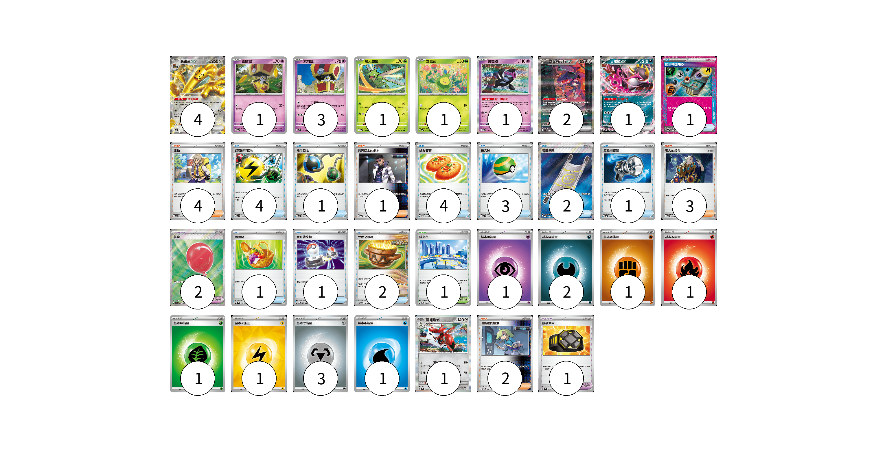 牌組構築方案 以此牌組為基礎新構築牌組 顯示卡面 顯示列表 寶可夢卡(15) 4 1 3 1 1 1 2 1 1 寶可夢道具(3) 2 1 物品卡(20) 1 4 1 4 3 2 1 1 1 2 支援者卡(10) 4 1 3 2 競技場卡(1) 1 能量卡(11) 1 2 1 1 1 1 3 1 寶可夢卡(15) 卡牌名稱 張數 卡牌名稱 張數 賽富豪ex SV8a 117/187 04 索財靈 SV8a 073/187 01 索財靈 SV7a 024/064 03 飛天螳螂 SV2a 123/165 01 含羞苞 SV8a 001/187 01 願增猿 SV8a 075/187 01 蓋諾賽克特ex SV11B 172/086 02 吉雉雞ex SV8a 104/187 01 巨鉗螳螂 SV4a 129/190 01 寶可夢道具(3) 卡牌名稱 張數 卡牌名稱 張數 氣球 M1L 084/063 02 硬硬束帶 SVM 139/175 01 物品卡(20) 卡牌名稱 張數 卡牌名稱 張數 能量輸送PRO SV7a 052/064 01 超級能量回收 SVK 010/042 04 能量回收 SVM 125/175 01 好友寶芬 SVOM 012/021 04 巢穴球 SVM 133/175 03 夜間擔架 M1L 083/063 02 反擊捕捉器 SV8a 139/187 01 野餐籃 SV1V 071/078 01 寶可夢交替 SV9a 058/063 01 大地之容器 SVTS 011/022 02 支援者卡(10) 卡牌名稱 張數 卡牌名稱 張數 派帕 SVK 035/042 04 弗圖博士的劇本 SV8a 175/187 01 老大的指令 MBG 021/022 03 暗碼迷的解讀 SV5M 067/071 02 競技場卡(1) 卡牌名稱 張數 卡牌名稱 張數 釀光市 SV9 098/100 01 能量卡(11) 卡牌名稱 張數 卡牌名稱 張數 基本【超】能量 MBD PSY 01 基本【惡】能量 MBG DAR 02 基本【鬥】能量 M-P FIG 01 基本【火】能量 M-P FIR 01 基本【草】能量 M-P GRA 01 基本【雷】能量 SVQP LIG 01 基本【鋼】能量 M-P MET 03 基本【水】能量 SVF WAT 01 以此牌組為基礎新構築牌組 牌組編碼 Ueddfm-veoeAN-PTfhgS copy 列印牌組單 牌組編碼已複製 分享至SNS