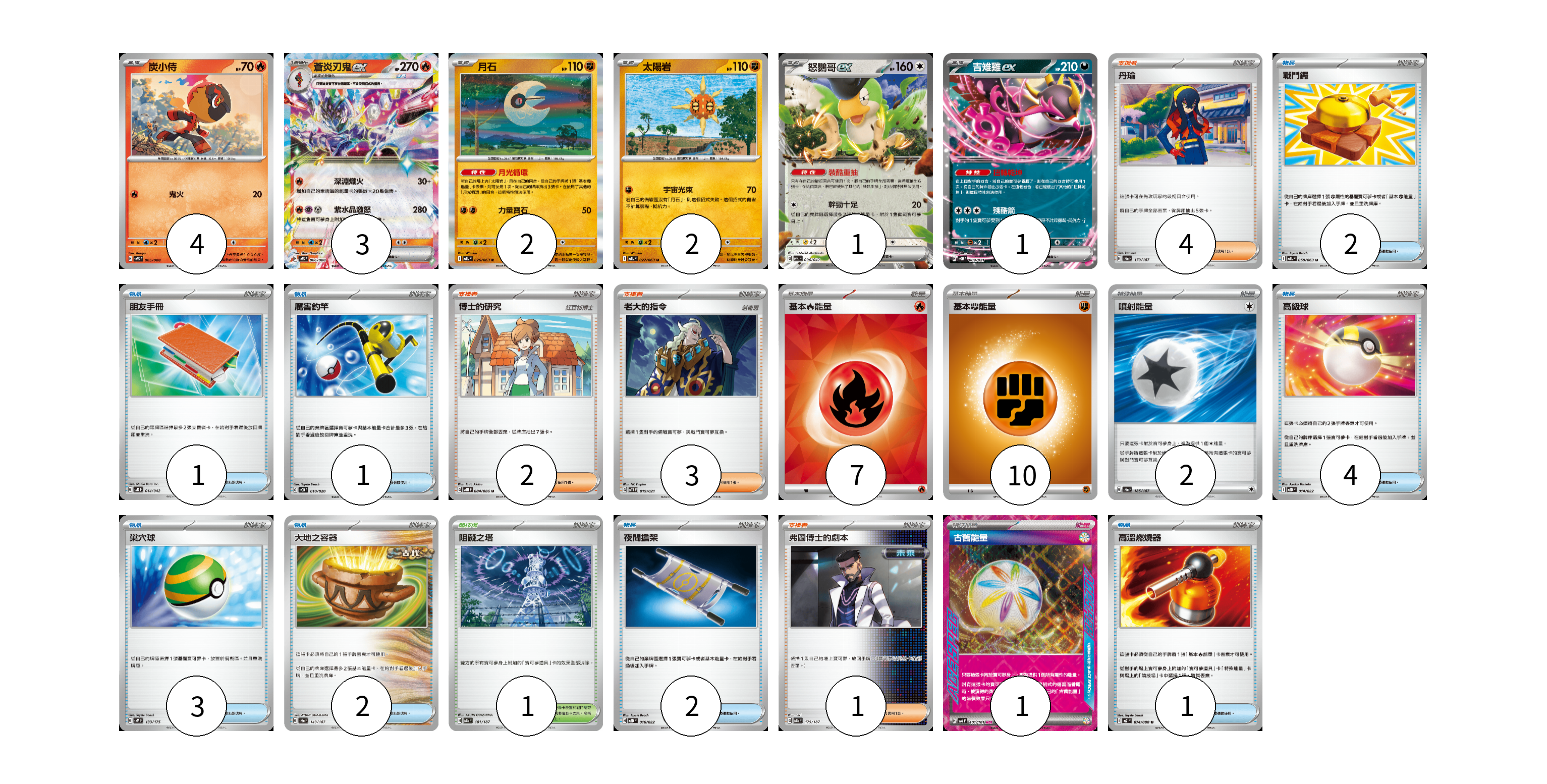 牌組構築方案 以此牌組為基礎新構築牌組 顯示卡面 顯示列表 寶可夢卡(13) 4 3 2 2 1 1 物品卡(16) 2 1 1 4 3 2 2 1 支援者卡(10) 4 2 3 1 競技場卡(1) 1 能量卡(20) 7 10 2 1 寶可夢卡(13) 卡牌名稱 張數 卡牌名稱 張數 炭小侍 SVPS 005/008 04 蒼炎刃鬼ex SVPS 006/008 03 月石 M1L 026/063 02 太陽岩 M1L 027/063 02 怒鸚哥ex SVK 006/042 01 吉雉雞ex SVOM 009/021 01 物品卡(16) 卡牌名稱 張數 卡牌名稱 張數 戰鬥鑼 M1L 059/063 02 朋友手冊 SVK 014/042 01 厲害釣竿 SVOD 010/020 01 高級球 MBD 014/022 04 巢穴球 SVM 133/175 03 大地之容器 SV8a 143/187 02 夜間擔架 MBD 016/022 02 高溫燃燒器 M2 074/080 01 支援者卡(10) 卡牌名稱 張數 卡牌名稱 張數 丹瑜 SV8a 170/187 04 博士的研究 SV11B 084/086 02 老大的指令 SVTR 019/021 03 弗圖博士的劇本 SV8a 175/187 01 競技場卡(1) 卡牌名稱 張數 卡牌名稱 張數 阻礙之塔 SV8a 181/187 01 能量卡(20) 卡牌名稱 張數 卡牌名稱 張數 基本【火】能量 SVQL FIR 07 基本【鬥】能量 M-P FIG 10 噴射能量 SV8a 185/187 02 古舊能量 SV6 101/101 01 以此牌組為基礎新構築牌組 牌組編碼 UfNaVW-OhYqkJ-DdyOEq copy 列印牌組單 牌組編碼已複製 分享至SNS