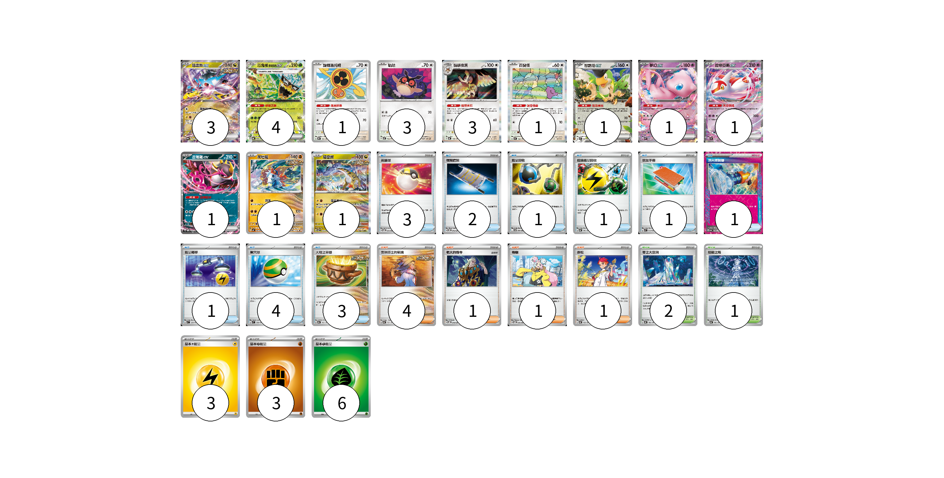 牌組構築方案 以此牌組為基礎新構築牌組 顯示卡面 顯示列表 寶可夢卡(21) 3 4 1 3 3 1 1 1 1 1 1 1 物品卡(17) 3 2 1 1 1 1 1 4 3 支援者卡(7) 4 1 1 1 競技場卡(3) 2 1 能量卡(12) 3 3 6 寶可夢卡(21) 卡牌名稱 張數 卡牌名稱 張數 猛雷鼓ex SV8a 124/187 03 厄鬼椪 碧草面具ex SV8a 020/187 04 旋轉洛托姆 SV8a 131/187 01 咕咕 SV5K 054/071 03 貓頭夜鷹 SV8a 128/187 03 百變怪 SV4a 144/190 01 怒鸚哥ex SVK 006/042 01 夢幻ex SVK 001/042 01 拉帝亞斯ex SV7a 019/064 01 吉雉雞ex SVOD 004/020 01 爬地翅 SV4K 041/066 01 猛雷鼓 SV7 075/102 01 物品卡(17) 卡牌名稱 張數 卡牌名稱 張數 高級球 SVOD 012/020 03 夜間擔架 SVOM 016/021 02 能量回收 SV11W 079/086 01 超級能量回收 SV8a 141/187 01 朋友手冊 SVK 014/042 01 頂尖捕捉器 SV8a 148/187 01 能量轉移 SVM 127/175 01 巢穴球 SVM 133/175 04 大地之容器 SV8a 143/187 03 支援者卡(7) 卡牌名稱 張數 卡牌名稱 張數 奧琳博士的氣魄 SV8a 167/187 04 老大的指令 SVOD 019/020 01 奇樹 SVOD 016/020 01 赤松 SV8a 163/187 01 競技場卡(3) 卡牌名稱 張數 卡牌名稱 張數 零之大空洞 SV8a 182/187 02 阻礙之塔 SV8a 181/187 01 能量卡(12) 卡牌名稱 張數 卡牌名稱 張數 基本雷能量 sv-p LIG 03 基本鬥能量 sv-p FIG 03 基本草能量 sv-p GRA 06 以此牌組為基礎新構築牌組 牌組編碼 UgIwxb-aZHDaJ-DluIqz copy 列印牌組單 牌組編碼已複製 分享至SNS