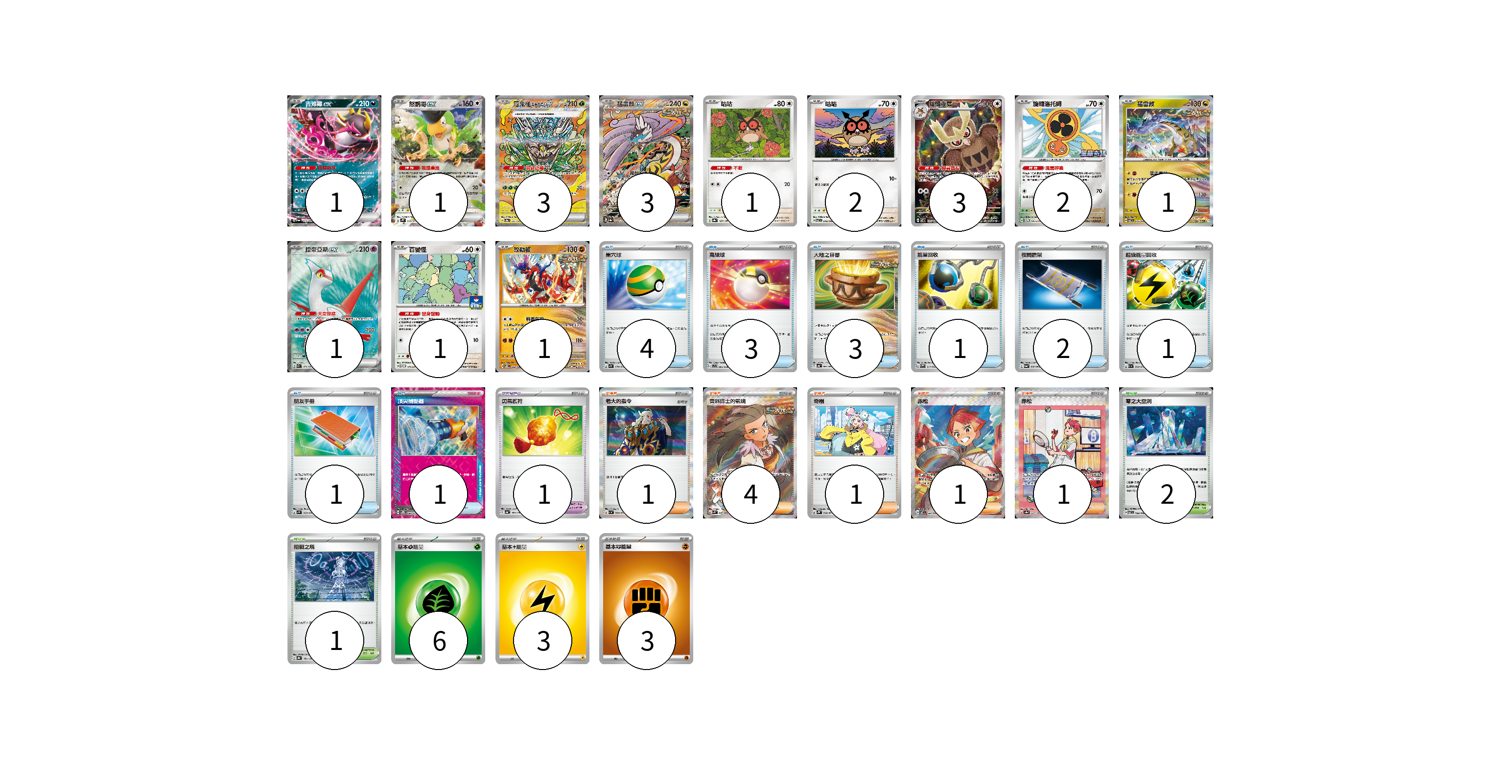 牌組構築方案 以此牌組為基礎新構築牌組 顯示卡面 顯示列表 寶可夢卡(20) 1 1 3 3 1 2 3 2 1 1 1 1 寶可夢道具(1) 1 物品卡(16) 4 3 3 1 2 1 1 1 支援者卡(8) 1 4 1 1 1 競技場卡(3) 2 1 能量卡(12) 6 3 3 寶可夢卡(20) 卡牌名稱 張數 卡牌名稱 張數 吉雉雞ex SV6a 038/064 01 怒鸚哥ex SV2P 065/071 01 厄鬼椪 碧草面具ex SV8a 201/187 03 猛雷鼓ex SV8a 222/187 03 咕咕 SV8a 127/187 01 咕咕 SV7 076/102 02 貓頭夜鷹 SV7 114/102 03 旋轉洛托姆 SV-P 146/SV-P 02 猛雷鼓 SV7 075/102 01 拉帝亞斯ex SV7a 078/064 01 百變怪 SV-P 111/SV-P 01 故勒頓 SV8 069/106 01 寶可夢道具(1) 卡牌名稱 張數 卡牌名稱 張數 勇氣護符 SV4a 169/190 01 物品卡(16) 卡牌名稱 張數 卡牌名稱 張數 巢穴球 SV1S 070/078 04 高級球 SVB 002/028 03 大地之容器 SV4K 060/066 03 能量回收 SVAW 011/023 01 夜間擔架 SV6a 056/064 02 超級能量回收 SV1a 064/073 01 朋友手冊 SV1S 069/078 01 頂尖捕捉器 SV5M 062/071 01 支援者卡(8) 卡牌名稱 張數 卡牌名稱 張數 老大的指令 SV1a 069/073 01 奧琳博士的氣魄 SV4K 085/066 04 奇樹 SV2D 069/071 01 赤松 SV7 123/102 01 赤松 SV8a 227/187 01 競技場卡(3) 卡牌名稱 張數 卡牌名稱 張數 零之大空洞 SV7 102/102 02 阻礙之塔 SV8a 181/187 01 能量卡(12) 卡牌名稱 張數 卡牌名稱 張數 基本草能量 sv-p GRA 06 基本雷能量 sv-p LIG 03 基本【鬥】能量 SVAM FIG 03 以此牌組為基礎新構築牌組 牌組編碼 UjLcWm-HWLyZJ-OEBddQ copy 列印牌組單 牌組編碼已複製 分享至SNS