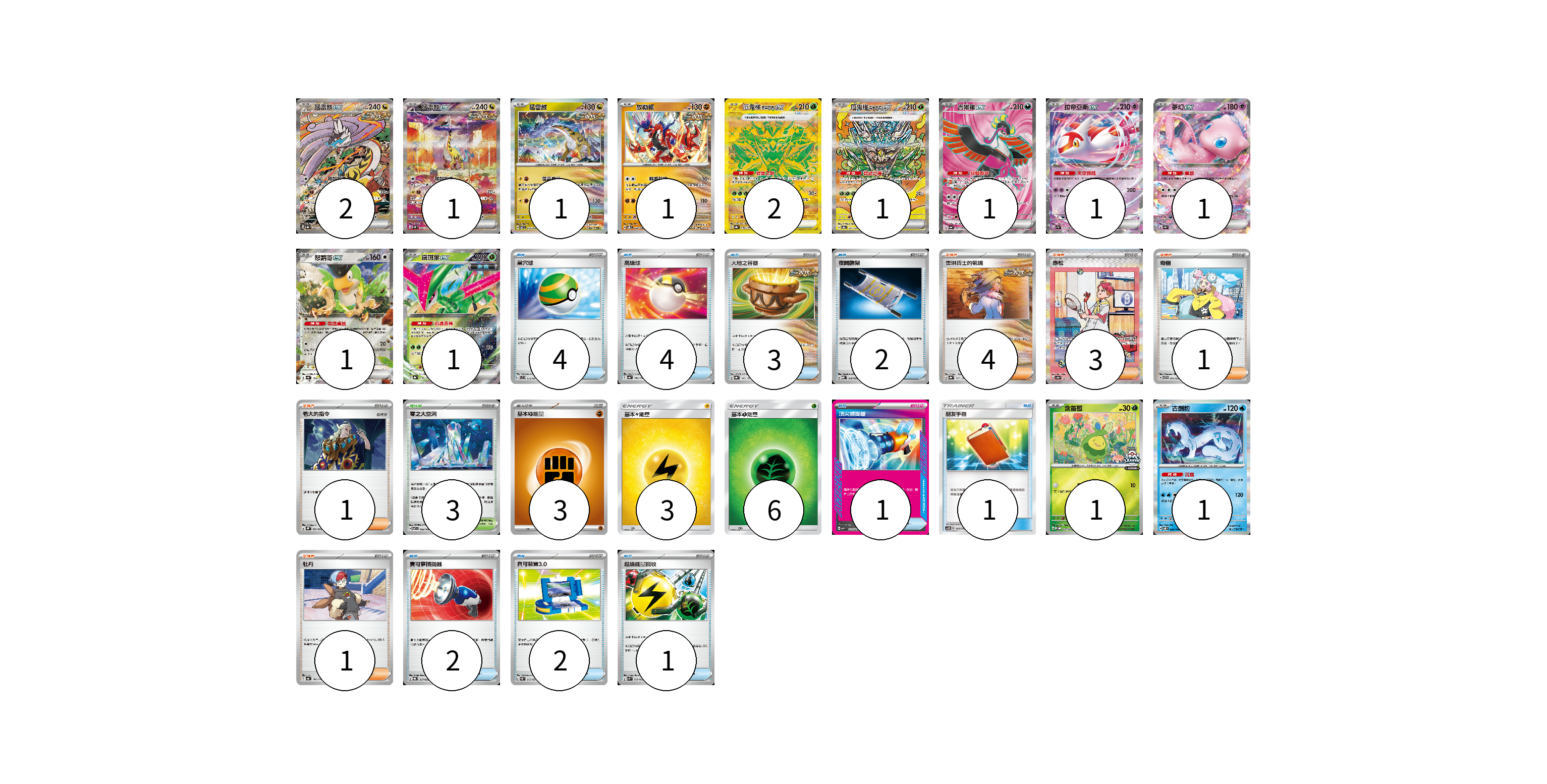 牌組構築方案 以此牌組為基礎新構築牌組 顯示卡面 顯示列表 寶可夢卡(15) 2 1 1 1 2 1 1 1 1 1 1 1 1 物品卡(20) 4 4 3 2 1 1 2 2 1 支援者卡(10) 4 3 1 1 1 競技場卡(3) 3 能量卡(12) 3 3 6 寶可夢卡(15) 卡牌名稱 張數 卡牌名稱 張數 猛雷鼓ex SV8a 222/187 02 猛雷鼓ex SV5K 095/071 01 猛雷鼓 SV7 075/102 01 故勒頓 SV8 069/106 01 厄鬼椪 碧草面具ex SV8a 234/187 02 厄鬼椪 碧草面具ex SV8a 201/187 01 吉雉雞ex SV6a 081/064 01 拉帝亞斯ex SV7a 019/064 01 夢幻ex SV2a 151/165 01 怒鸚哥ex SV4a 154/190 01 鐵斑葉ex SV8a 016/187 01 含羞苞 M-P 037/M-P 01 古劍豹 SV8 032/106 01 物品卡(20) 卡牌名稱 張數 卡牌名稱 張數 巢穴球 SVC 013/021 04 高級球 SV4a 161/190 04 大地之容器 SV8a 143/187 03 夜間擔架 MBD 016/022 02 頂尖捕捉器 MBG 014/022 01 朋友手冊 AC2D 145/176 01 寶可夢捕捉器 SVQL 017/022 02 寶可裝置3.0 SVAL 015/021 02 超級能量回收 SVK 010/042 01 支援者卡(10) 卡牌名稱 張數 卡牌名稱 張數 奧琳博士的氣魄 SV8a 167/187 04 赤松 SV8a 227/187 03 奇樹 SVTG 017/019 01 老大的指令 SVHK 022/022 01 牡丹 SV4a 182/190 01 競技場卡(3) 卡牌名稱 張數 卡牌名稱 張數 零之大空洞 SV7 102/102 03 能量卡(12) 卡牌名稱 張數 卡牌名稱 張數 基本鬥能量 sv-p FIG 03 基本雷能量 AS6D LIG 03 基本草能量 AS6D GRA 06 以此牌組為基礎新構築牌組 牌組編碼 UkjlxW-UKhPnN-PVPNEc copy 列印牌組單 牌組編碼已複製 分享至SNS