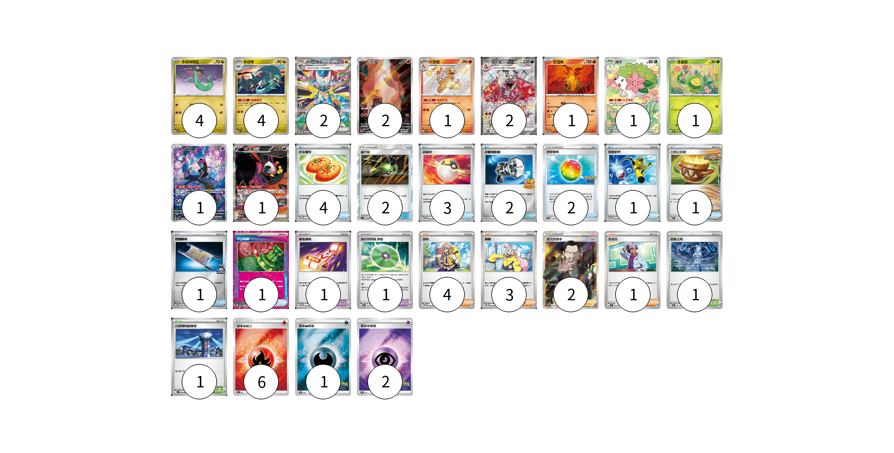 牌組構築方案 以此牌組為基礎新構築牌組 顯示卡面 顯示列表 寶可夢卡(20) 4 4 2 2 1 2 1 1 1 1 1 寶可夢道具(2) 1 1 物品卡(17) 4 2 3 2 2 1 1 1 1 支援者卡(10) 4 3 2 1 競技場卡(2) 1 1 能量卡(9) 6 1 2 寶可夢卡(20) 卡牌名稱 張數 卡牌名稱 張數 多龍梅西亞 SV8a 118/187 04 多龍奇 SV8a 119/187 04 多龍巴魯托ex SV8a 221/187 02 小火龍 SV2a 168/165 02 火恐龍 SV4a 211/190 01 噴火龍ex SV4a 331/190 02 古玉魚 SV5a 018/066 01 謝米 SV9a 066/063 01 含羞苞 SV8a 001/187 01 願增猿 SV6 107/101 01 吉雉雞ex SV6a 089/064 01 寶可夢道具(2) 卡牌名稱 張數 卡牌名稱 張數 緊急滑板 SVOD 015/020 01 招式學習器 演進 SV8a 160/187 01 物品卡(17) 卡牌名稱 張數 卡牌名稱 張數 好友寶芬 SVOD 011/020 04 巢穴球 AS5a 178/184 02 高級球 SVOM 013/021 03 反擊捕捉器 SV-P 083/SV-P 02 神奇糖果 S10b 066/071 02 厲害釣竿 SVOD 010/020 01 大地之容器 SV8a 143/187 01 夜間擔架 SV-P 204/SV-P 01 不公印章 SV5a 053/066 01 支援者卡(10) 卡牌名稱 張數 卡牌名稱 張數 派帕 SVOD 018/020 04 奇樹 SVOM 018/021 03 老大的指令(坂木) SC1b 170/153 02 吉尼亞 SV1S 074/078 01 競技場卡(2) 卡牌名稱 張數 卡牌名稱 張數 阻礙之塔 SV8a 181/187 01 火箭隊的監視塔 SV10 096/098 01 能量卡(9) 卡牌名稱 張數 卡牌名稱 張數 基本【火】能量 SO FIR 06 基本惡能量 S10b DAR 01 基本超能量 S10b PSY 02 以此牌組為基礎新構築牌組 牌組編碼 UmLjWE-lQDqve-hmTLgv copy 列印牌組單 牌組編碼已複製 分享至SNS