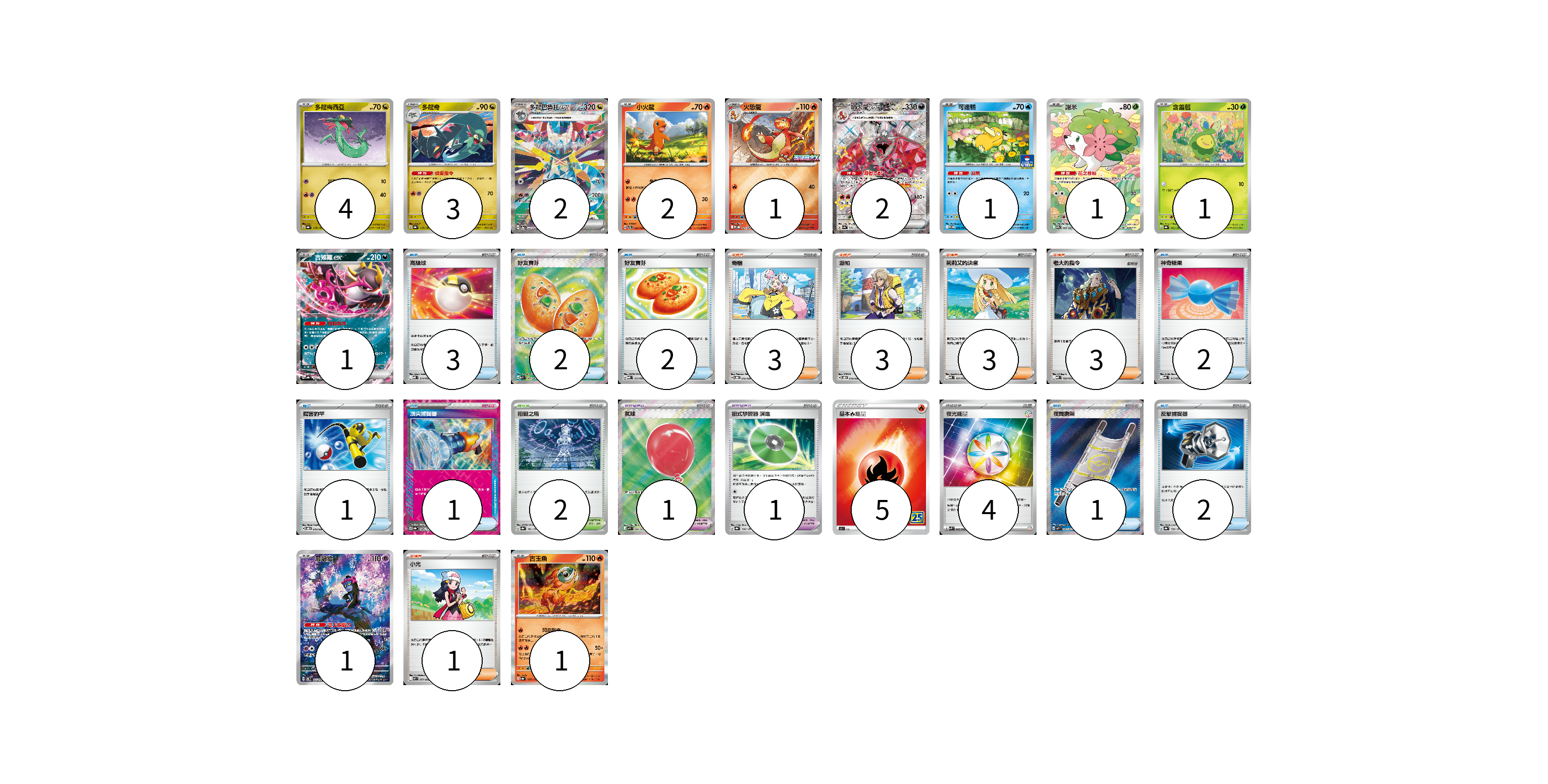 牌組構築方案 以此牌組為基礎新構築牌組 顯示卡面 顯示列表 寶可夢卡(20) 4 3 2 2 1 2 1 1 1 1 1 1 寶可夢道具(2) 1 1 物品卡(14) 3 2 2 2 1 1 1 2 支援者卡(13) 3 3 3 3 1 競技場卡(2) 2 能量卡(9) 5 4 寶可夢卡(20) 卡牌名稱 張數 卡牌名稱 張數 多龍梅西亞 SV8a 118/187 04 多龍奇 SV8a 119/187 03 多龍巴魯托ex SV8a 221/187 02 小火龍 SVTL 001/021 02 火恐龍 M-P 021/M-P 01 噴火龍ex SV4a 331/190 02 可達鴨 SV-P 220/SV-P 01 謝米 SV9a 066/063 01 含羞苞 SV8a 001/187 01 吉雉雞ex SV8a 104/187 01 願增猿 SV6 107/101 01 古玉魚 SV8a 025/187 01 寶可夢道具(2) 卡牌名稱 張數 卡牌名稱 張數 氣球 M1L 084/063 01 招式學習器 演進 SV8a 160/187 01 物品卡(14) 卡牌名稱 張數 卡牌名稱 張數 高級球 MBD 014/022 03 好友寶芬 M1S 081/063 02 好友寶芬 MBD 013/022 02 神奇糖果 MBG 013/022 02 厲害釣竿 SVOD 010/020 01 頂尖捕捉器 SV8a 148/187 01 夜間擔架 M1L 083/063 01 反擊捕捉器 SV8a 139/187 02 支援者卡(13) 卡牌名稱 張數 卡牌名稱 張數 奇樹 SVOD 016/020 03 派帕 SVOD 018/020 03 莉莉艾的決意 MBD 021/022 03 老大的指令 MBD 020/022 03 小光 M2 077/080 01 競技場卡(2) 卡牌名稱 張數 卡牌名稱 張數 阻礙之塔 SV8a 181/187 02 能量卡(9) 卡牌名稱 張數 卡牌名稱 張數 基本火能量 S8a FIR 05 夜光能量 SVK 042/042 04 以此牌組為基礎新構築牌組 牌組編碼 UmRqlb-ERCyMG-AJYAeA copy 列印牌組單 牌組編碼已複製 分享至SNS