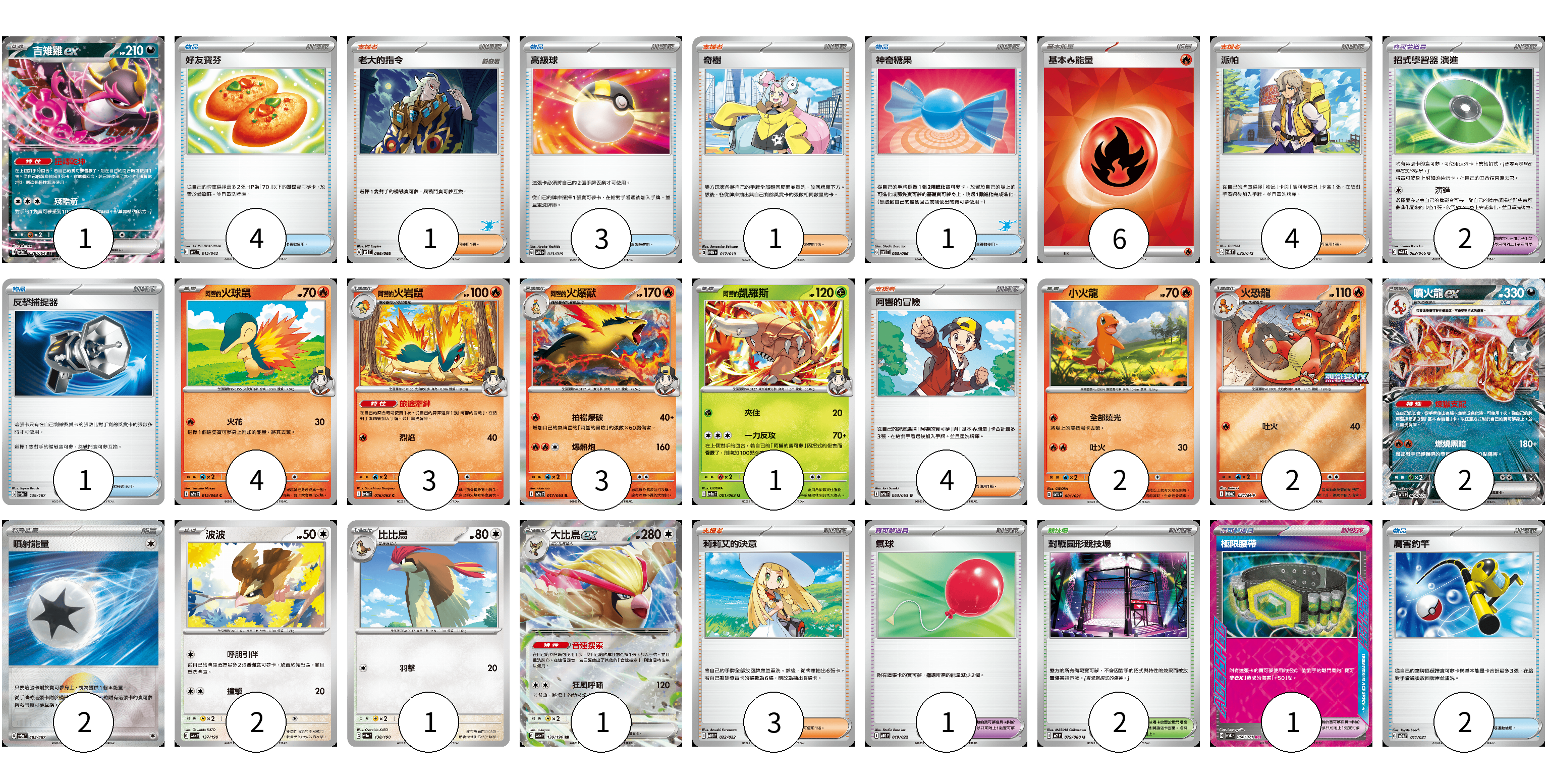 牌組構築方案 以此牌組為基礎新構築牌組 顯示卡面 顯示列表 寶可夢卡(22) 1 4 3 3 1 2 2 2 2 1 1 寶可夢道具(4) 2 1 1 物品卡(11) 4 3 1 1 2 支援者卡(13) 1 1 4 4 3 競技場卡(2) 2 能量卡(8) 6 2 寶可夢卡(22) 卡牌名稱 張數 卡牌名稱 張數 吉雉雞ex SV6a 038/064 01 <阿響的>火球鼠 SV9a 015/063 04 <阿響的>火岩鼠 SV9a 016/063 03 <阿響的>火爆獸 SV9a 017/063 03 <阿響的>凱羅斯 SV9a 001/063 01 小火龍 SVTL 001/021 02 火恐龍 M-P 021/M-P 02 噴火龍ex SVTL 006/021 02 波波 SV4a 137/190 02 比比鳥 SV4a 138/190 01 大比鳥ex SV4a 139/190 01 寶可夢道具(4) 卡牌名稱 張數 卡牌名稱 張數 招式學習器 演進 SV4M 063/066 02 氣球 MBG 019/022 01 極限腰帶 SV5K 066/071 01 物品卡(11) 卡牌名稱 張數 卡牌名稱 張數 好友寶芬 SVK 015/042 04 高級球 SVTG 013/019 03 神奇糖果 SVI 053/066 01 反擊捕捉器 SV8a 139/187 01 厲害釣竿 SVOM 011/021 02 支援者卡(13) 卡牌名稱 張數 卡牌名稱 張數 老大的指令 SVI 066/066 01 奇樹 SVTG 017/019 01 派帕 SVK 035/042 04 阿響的冒險 SV9a 063/063 04 莉莉艾的決意 MBG 022/022 03 競技場卡(2) 卡牌名稱 張數 卡牌名稱 張數 對戰圓形競技場 M2 079/080 02 能量卡(8) 卡牌名稱 張數 卡牌名稱 張數 基本【火】能量 SVK FIR 06 噴射能量 SV8a 185/187 02 以此牌組為基礎新構築牌組 牌組編碼 UmckJU-UpMkAl-TBrpyy copy 列印牌組單 牌組編碼已複製 分享至SNS