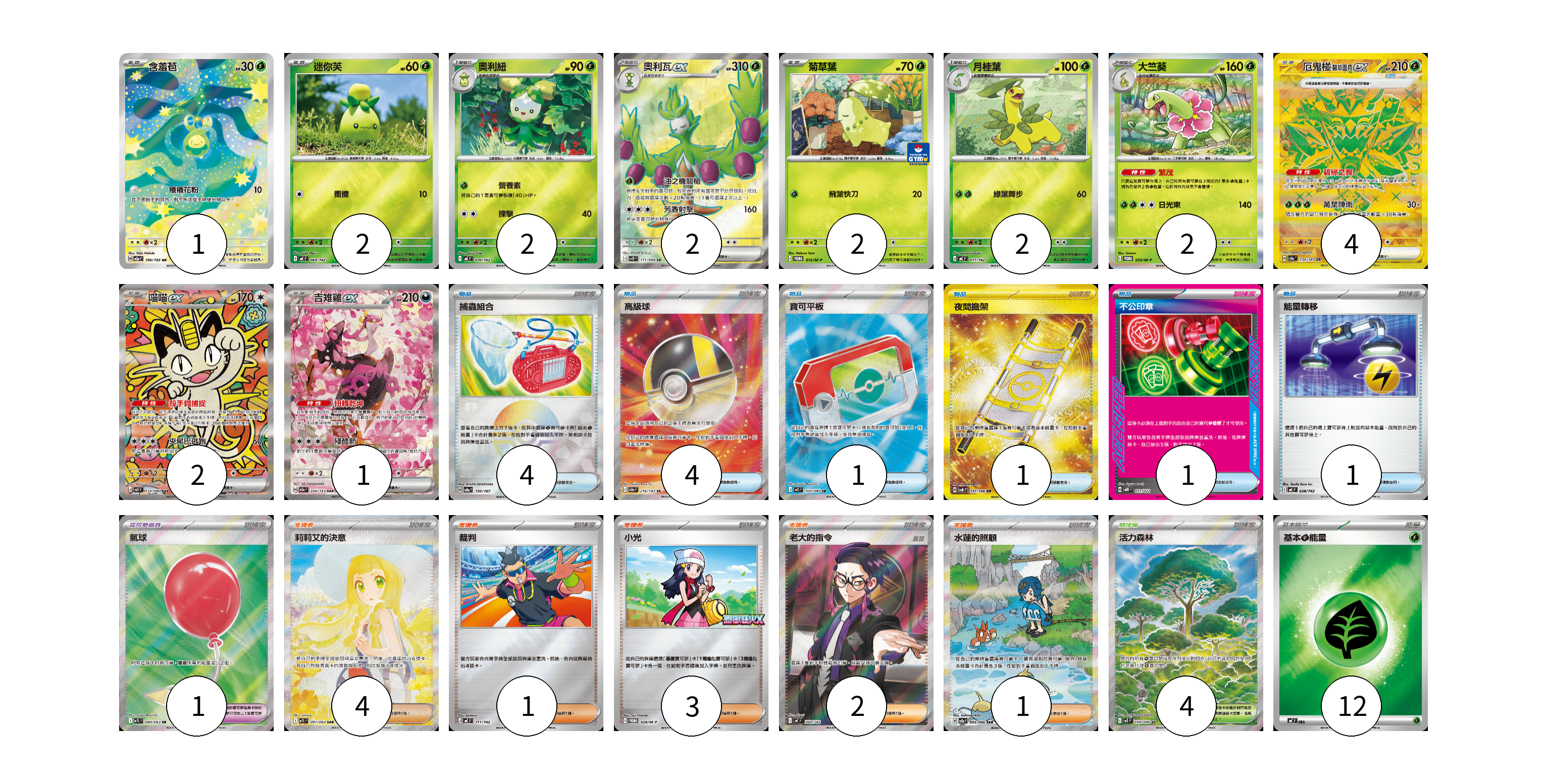 牌組構築方案 以此牌組為基礎新構築牌組 顯示卡面 顯示列表 寶可夢卡(20) 1 2 2 2 2 2 2 4 2 1 寶可夢道具(1) 1 物品卡(12) 4 4 1 1 1 1 支援者卡(11) 4 1 3 2 1 競技場卡(4) 4 能量卡(12) 12 寶可夢卡(20) 卡牌名稱 張數 卡牌名稱 張數 含羞苞 M2a 196/193 01 迷你芙 MC 069/742 02 奧利紐 MC 070/742 02 奧利瓦ex SV10 111/098 02 菊草葉 M-P 012/M-P 02 月桂葉 MC 017/742 02 大竺葵 M-P 055/M-P 02 厄鬼椪 碧草面具ex SV8a 234/187 04 喵喵ex M3 114/080 02 吉雉雞ex M2a 244/193 01 寶可夢道具(1) 卡牌名稱 張數 卡牌名稱 張數 氣球 M1L 084/063 01 物品卡(12) 卡牌名稱 張數 卡牌名稱 張數 捕蟲組合 SV8a 150/187 04 高級球 M2a 216/193 04 寶可平板 M3 103/080 01 夜間擔架 SV8 137/106 01 不公印章 MBD 011/022 01 能量轉移 MC 638/742 01 支援者卡(11) 卡牌名稱 張數 卡牌名稱 張數 莉莉艾的決意 M1L 091/063 04 裁判 MC 711/742 01 小光 M-P 028/M-P 03 老大的指令(烏羽) MC 760/742 02 水蓮的照顧 SV5a 093/066 01 競技場卡(4) 卡牌名稱 張數 卡牌名稱 張數 活力森林 M3 109/080 04 能量卡(12) 卡牌名稱 張數 卡牌名稱 張數 基本【草】能量 MC GRA 12 以此牌組為基礎新構築牌組 牌組編碼 UoxHpj-QHZsAQ-wInPJk copy 列印牌組單 牌組編碼已複製 分享至SNS