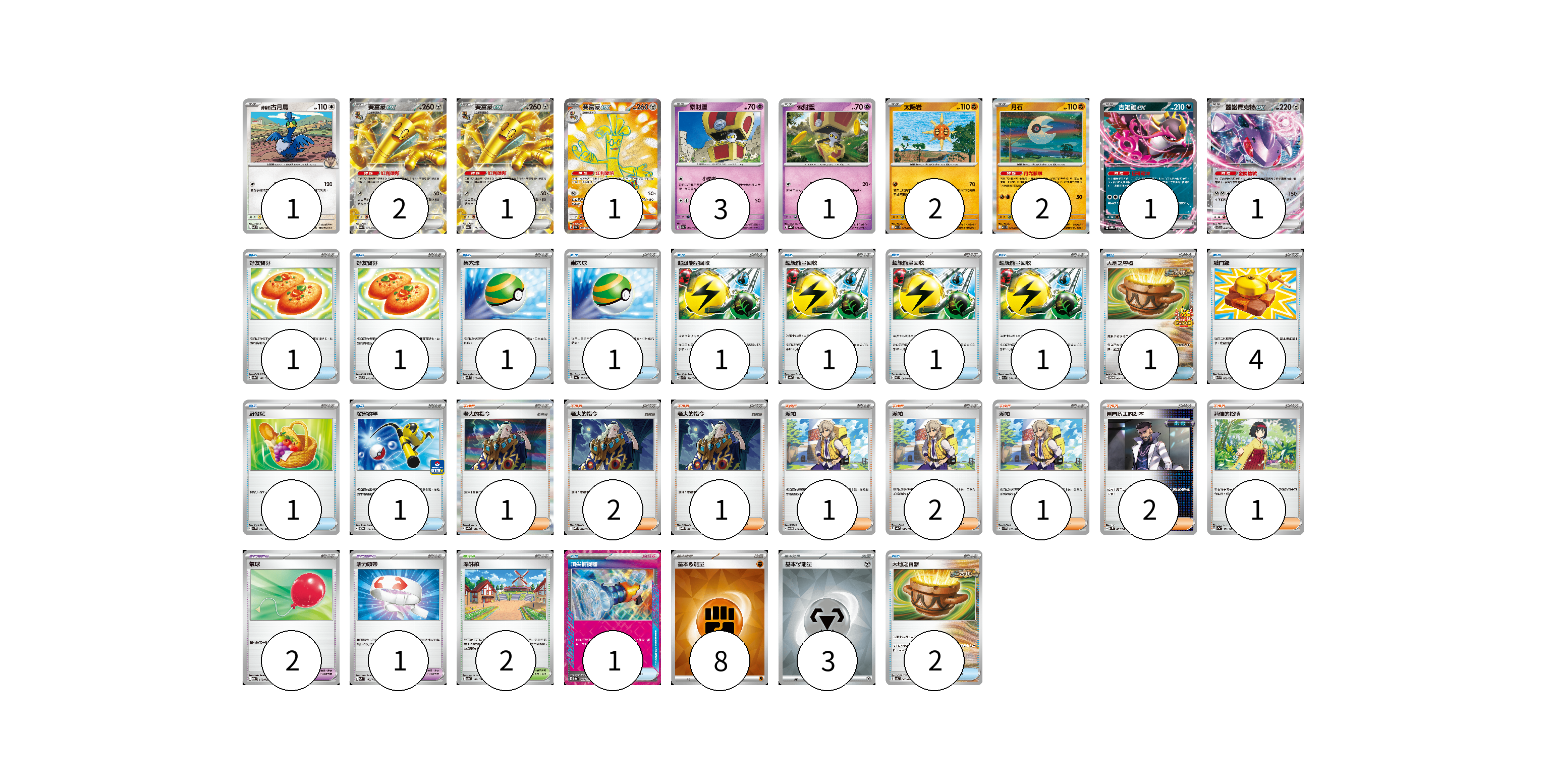 牌組構築方案 以此牌組為基礎新構築牌組 顯示卡面 顯示列表 寶可夢卡(15) 1 2 1 1 3 1 2 2 1 1 寶可夢道具(3) 2 1 物品卡(18) 1 1 1 1 1 1 1 1 1 4 1 1 1 2 支援者卡(11) 1 2 1 1 2 1 2 1 競技場卡(2) 2 能量卡(11) 8 3 寶可夢卡(15) 卡牌名稱 張數 卡牌名稱 張數 赫普的古月鳥 SV9 087/100 01 賽富豪ex SV3a 050/062 02 賽富豪ex SV8a 117/187 01 賽富豪ex SV3a 079/062 01 索財靈 SV7a 024/064 03 索財靈 SV3a 021/062 01 太陽岩 M1L 027/063 02 月石 M1L 026/063 02 吉雉雞ex SVOD 004/020 01 蓋諾賽克特ex SV11B 069/086 01 寶可夢道具(3) 卡牌名稱 張數 卡牌名稱 張數 氣球 MBG 019/022 02 活力頭帶 SVM 140/175 01 物品卡(18) 卡牌名稱 張數 卡牌名稱 張數 好友寶芬 SV8a 147/187 01 好友寶芬 SVTL 010/021 01 巢穴球 SVK 016/042 01 巢穴球 SV4a 159/190 01 超級能量回收 SVK 010/042 01 超級能量回收 SV4a 157/190 01 超級能量回收 SVEL 009/020 01 超級能量回收 SV1a 064/073 01 大地之容器 SV-P 084/SV-P 01 戰鬥鑼 M1L 059/063 04 野餐籃 SV1V 071/078 01 厲害釣竿 SV-P 112/SV-P 01 頂尖捕捉器 SV8a 148/187 01 大地之容器 SV4K 060/066 02 支援者卡(11) 卡牌名稱 張數 卡牌名稱 張數 老大的指令 SV4a 181/190 01 老大的指令 MBD 020/022 02 老大的指令 MBG 021/022 01 派帕 SVTM 019/022 01 派帕 SV4a 180/190 02 派帕 SV1V 076/078 01 弗圖博士的劇本 SV4M 065/066 02 莉佳的招待 SV2a 161/165 01 競技場卡(2) 卡牌名稱 張數 卡牌名稱 張數 深缽鎮 SV4a 185/190 02 能量卡(11) 卡牌名稱 張數 卡牌名稱 張數 基本【鬥】能量 SVM FIG 08 基本【鋼】能量 SVOD MET 03 以此牌組為基礎新構築牌組 牌組編碼 UthqSf-WwEWGB-XxAXDo copy 列印牌組單 牌組編碼已複製 分享至SNS