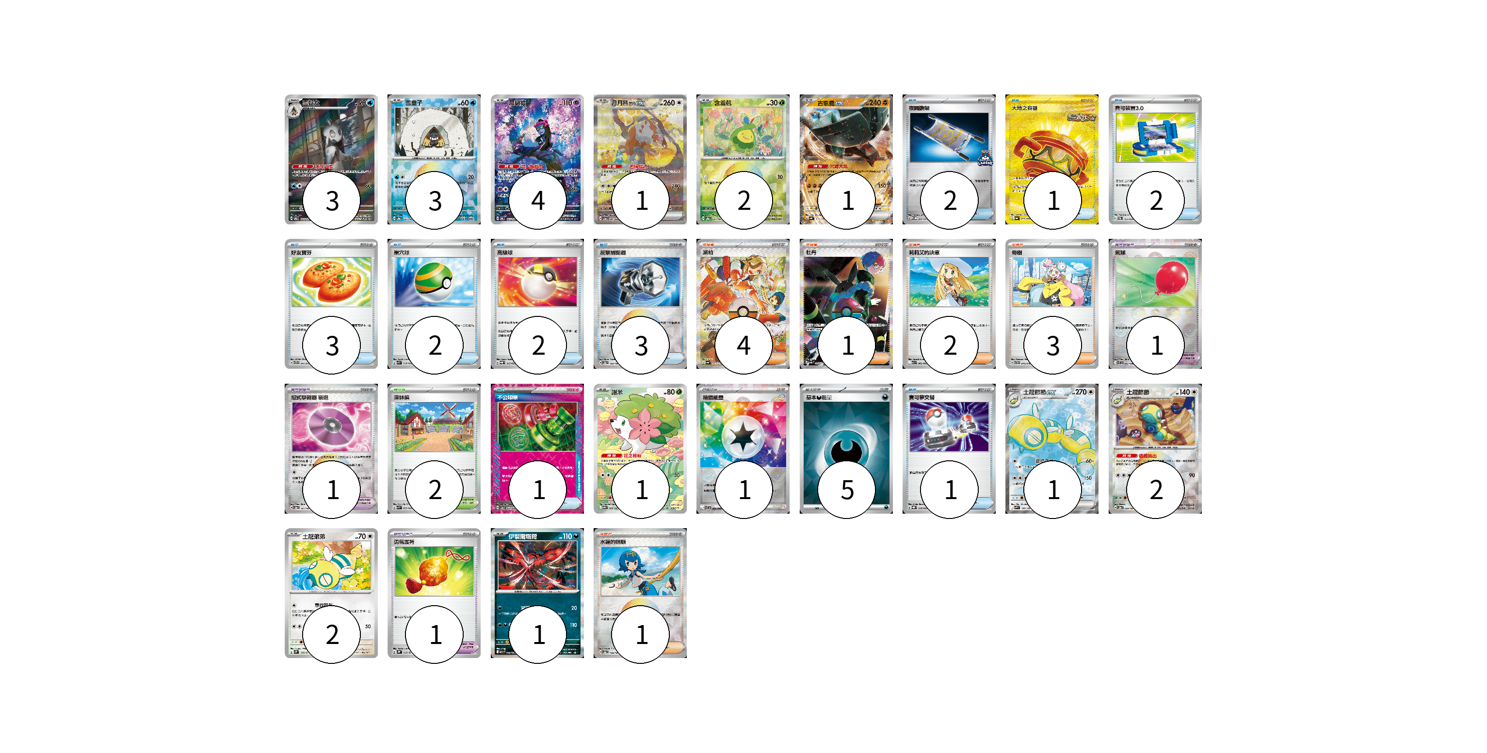 牌組構築方案 以此牌組為基礎新構築牌組 顯示卡面 顯示列表 寶可夢卡(21) 3 3 4 1 2 1 1 1 2 2 1 寶可夢道具(3) 1 1 1 物品卡(17) 2 1 2 3 2 2 3 1 1 支援者卡(11) 4 1 2 3 1 競技場卡(2) 2 能量卡(6) 1 5 寶可夢卡(21) 卡牌名稱 張數 卡牌名稱 張數 雪妖女 SV6 104/101 03 雪童子 SV8a 037/187 03 願增猿 SV6 107/101 04 月月熊 赫月 ex SV5a 091/066 01 含羞苞 SV8a 001/187 02 古鼎鹿ex SV4a 113/190 01 謝米 SV9a 066/063 01 土龍節節ex SV9 120/100 01 土龍節節 SV8a 130/187 02 土龍弟弟 SV2P 056/071 02 伊裴爾塔爾 M1L 040/063 01 寶可夢道具(3) 卡牌名稱 張數 卡牌名稱 張數 氣球 SV11B 082/086 01 招式學習器 衰退 SV8a 161/187 01 勇氣護符 SV2D 067/071 01 物品卡(17) 卡牌名稱 張數 卡牌名稱 張數 夜間擔架 SV-P 204/SV-P 02 大地之容器 SV6a 093/064 01 寶可裝置3.0 SVEM 014/020 02 好友寶芬 SVTG 011/019 03 巢穴球 SVK 016/042 02 高級球 SVQP 015/023 02 反擊捕捉器 SV8a 139/187 03 不公印章 SV5a 053/066 01 寶可夢交替 SVQP 016/023 01 支援者卡(11) 卡牌名稱 張數 卡牌名稱 張數 派帕 SV4a 353/190 04 牡丹 SV4a 354/190 01 莉莉艾的決意 M1L 062/063 02 奇樹 SVTH 015/018 03 水蓮的照顧 SV8a 168/187 01 競技場卡(2) 卡牌名稱 張數 卡牌名稱 張數 深缽鎮 SVK 039/042 02 能量卡(6) 卡牌名稱 張數 卡牌名稱 張數 稜鏡能量 SV11B 086/086 01 基本【惡】能量 SVOM DAR 05 以此牌組為基礎新構築牌組 牌組編碼 UuRlWW-kqdwrT-KcOdBb copy 列印牌組單 牌組編碼已複製 分享至SNS