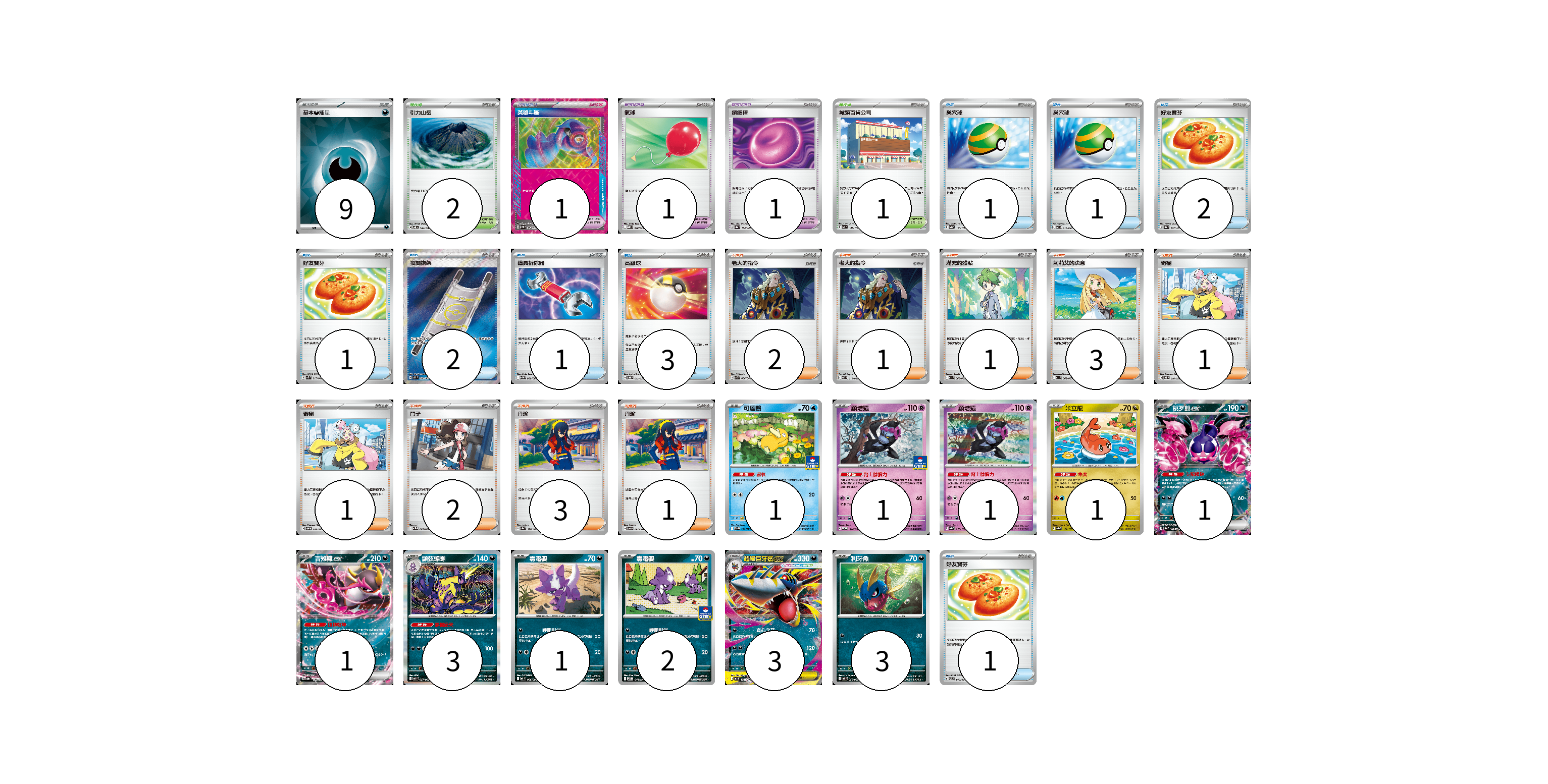 牌組構築方案 以此牌組為基礎新構築牌組 顯示卡面 顯示列表 寶可夢卡(18) 1 1 1 1 1 1 3 1 2 3 3 寶可夢道具(3) 1 1 1 物品卡(12) 1 1 2 1 2 1 3 1 支援者卡(15) 2 1 1 3 1 1 2 3 1 競技場卡(3) 2 1 能量卡(9) 9 寶可夢卡(18) 卡牌名稱 張數 卡牌名稱 張數 可達鴨 SV-P 220/SV-P 01 願增猿 M-P 014/M-P 01 願增猿 SV8a 075/187 01 米立龍 SV8a 121/187 01 桃歹郎ex SV8a 105/187 01 吉雉雞ex SV8a 104/187 01 顫弦蠑螈 M2 057/080 03 毒電嬰 M2 056/080 01 毒電嬰 M-P 044/M-P 02 超級巨牙鯊ex M2 051/080 03 利牙魚 M2 050/080 03 寶可夢道具(3) 卡牌名稱 張數 卡牌名稱 張數 英雄斗篷 SV5M 064/071 01 氣球 MBD 018/022 01 鎖鏈糬 SV8a 154/187 01 物品卡(12) 卡牌名稱 張數 卡牌名稱 張數 巢穴球 SV4a 159/190 01 巢穴球 SVEL 011/020 01 好友寶芬 SV8a 147/187 02 好友寶芬 SVK 015/042 01 夜間擔架 M1L 083/063 02 道具拆除器 SV11W 080/086 01 高級球 SVOD 012/020 03 好友寶芬 SVTL 010/021 01 支援者卡(15) 卡牌名稱 張數 卡牌名稱 張數 老大的指令 SVK 036/042 02 老大的指令 SVEL 019/020 01 滿充的體貼 M1S 060/063 01 莉莉艾的決意 M1L 062/063 03 奇樹 SVOD 016/020 01 奇樹 SVOM 018/021 01 鬥子 SV11W 085/086 02 丹瑜 SV8a 170/187 03 丹瑜 SV6 097/101 01 競技場卡(3) 卡牌名稱 張數 卡牌名稱 張數 引力山岳 SV8 106/106 02 城鎮百貨公司 SV3 107/108 01 能量卡(9) 卡牌名稱 張數 卡牌名稱 張數 基本【惡】能量 SVOM DAR 09 以此牌組為基礎新構築牌組 牌組編碼 UvJrBi-JPRgRH-FlLCRa copy 列印牌組單 牌組編碼已複製 分享至SNS