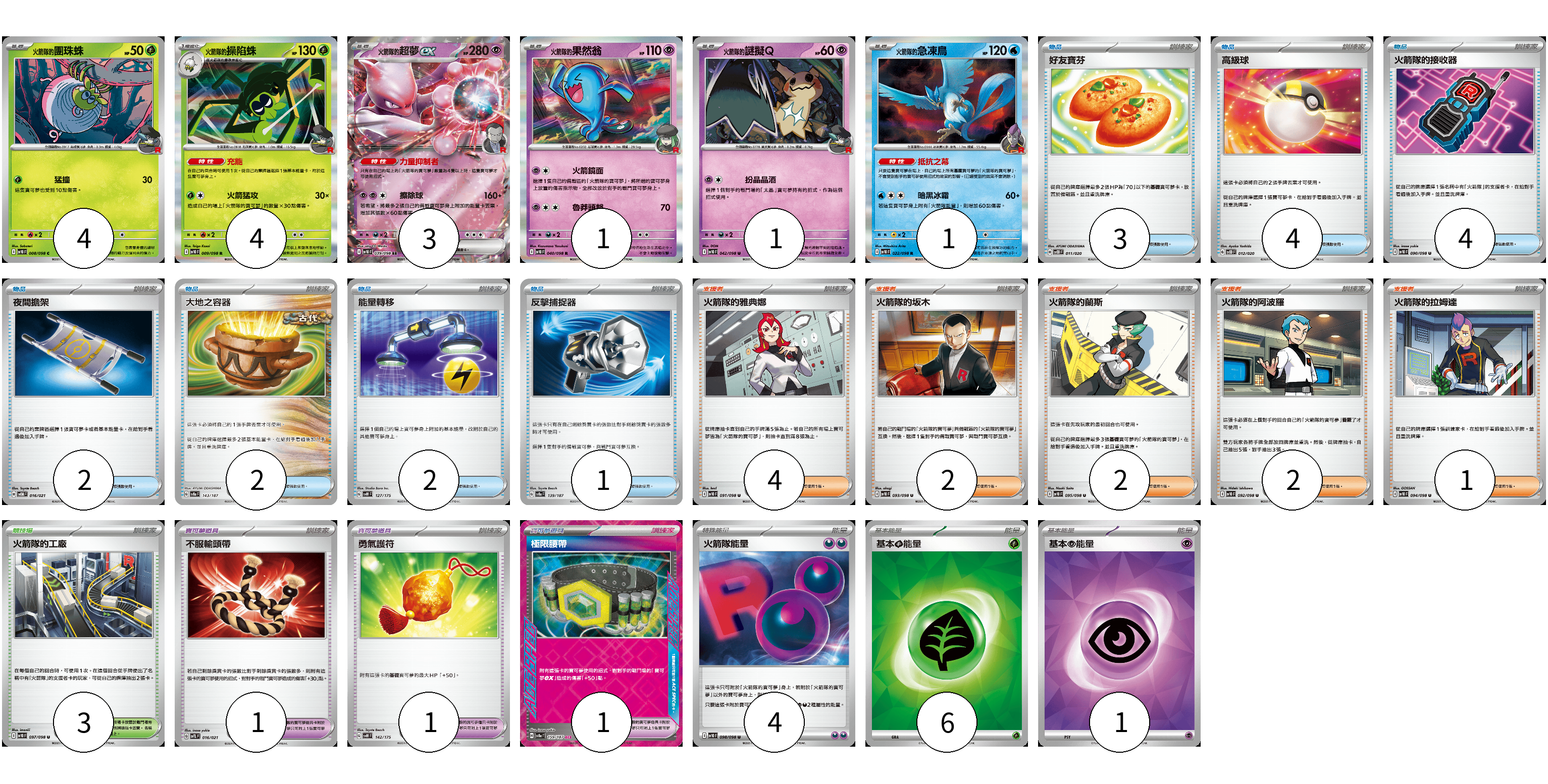 牌組構築方案 以此牌組為基礎新構築牌組 顯示卡面 顯示列表 寶可夢卡(14) 4 4 3 1 1 1 寶可夢道具(3) 1 1 1 物品卡(18) 3 4 4 2 2 2 1 支援者卡(11) 4 2 2 2 1 競技場卡(3) 3 能量卡(11) 4 6 1 寶可夢卡(14) 卡牌名稱 張數 卡牌名稱 張數 <火箭隊的>團珠蛛 SV10 008/098 04 <火箭隊的>操陷蛛 SV10 009/098 04 <火箭隊的>超夢ex SV10 039/098 03 <火箭隊的>果然翁 SV10 040/098 01 <火箭隊的>謎擬Q SV10 042/098 01 <火箭隊的>急凍鳥 SV10 022/098 01 寶可夢道具(3) 卡牌名稱 張數 卡牌名稱 張數 不服輸頭帶 SVTL 016/021 01 勇氣護符 SVM 142/175 01 極限腰帶 SV8a 159/187 01 物品卡(18) 卡牌名稱 張數 卡牌名稱 張數 好友寶芬 SVOD 011/020 03 高級球 SVOD 012/020 04 火箭隊的接收器 SV10 090/098 04 夜間擔架 SVOM 016/021 02 大地之容器 SV8a 143/187 02 能量轉移 SVM 127/175 02 反擊捕捉器 SV8a 139/187 01 支援者卡(11) 卡牌名稱 張數 卡牌名稱 張數 火箭隊的雅典娜 SV10 091/098 04 火箭隊的坂木 SV10 093/098 02 火箭隊的蘭斯 SV10 095/098 02 火箭隊的阿波羅 SV10 092/098 02 火箭隊的拉姆達 SV10 094/098 01 競技場卡(3) 卡牌名稱 張數 卡牌名稱 張數 火箭隊的工廠 SV10 097/098 03 能量卡(11) 卡牌名稱 張數 卡牌名稱 張數 火箭隊能量 SV10 098/098 04 基本【草】能量 SVK GRA 06 基本【超】能量 SVOD PSY 01 以此牌組為基礎新構築牌組 牌組編碼 UvhXkr-KDOOpg-MgjQTf copy 列印牌組單 牌組編碼已複製 分享至SNS
