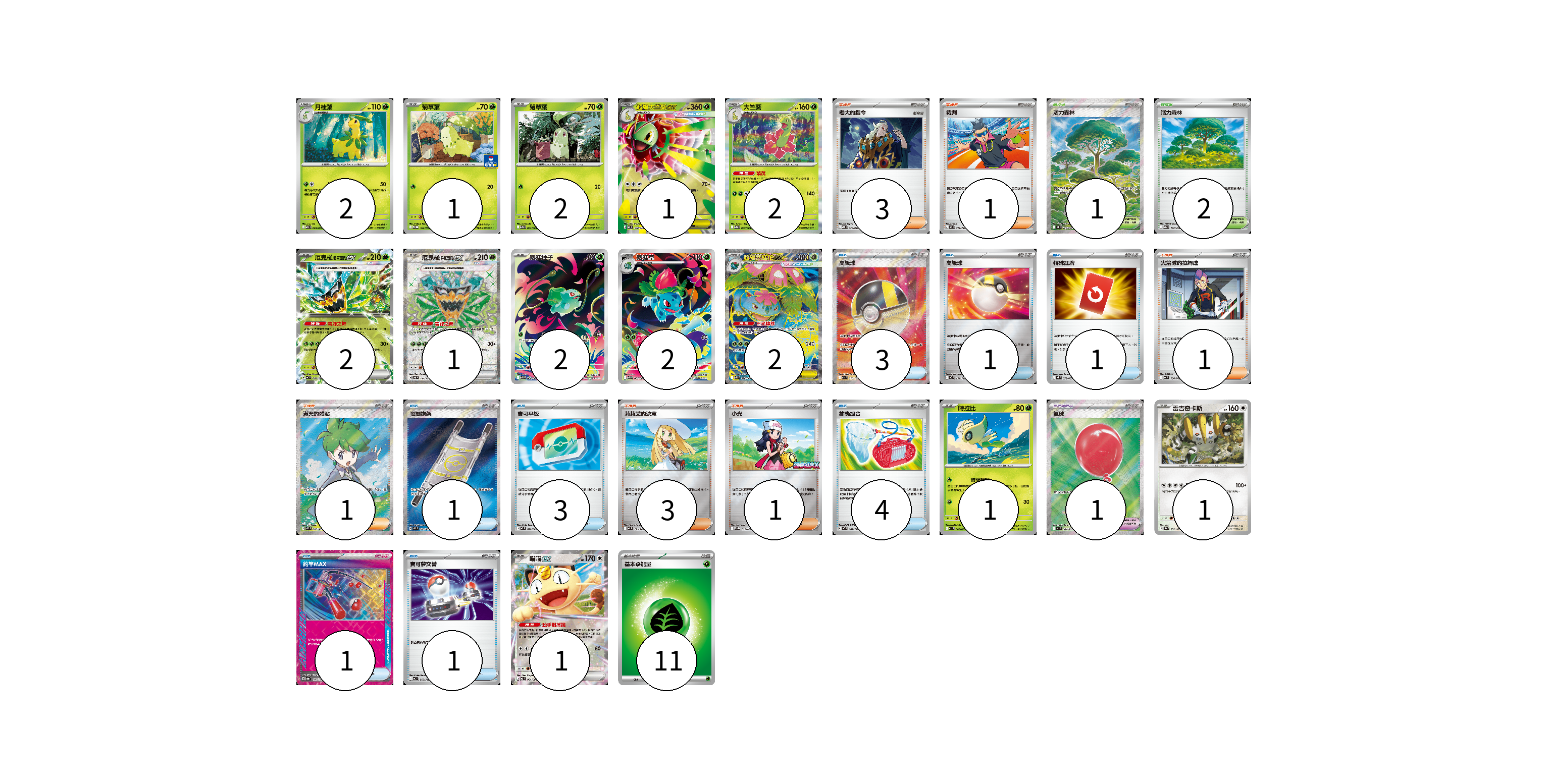 牌組構築方案 以此牌組為基礎新構築牌組 顯示卡面 顯示列表 寶可夢卡(20) 2 1 2 1 2 2 1 2 2 2 1 1 1 寶可夢道具(1) 1 物品卡(15) 3 1 1 1 3 4 1 1 支援者卡(10) 3 1 1 1 3 1 競技場卡(3) 1 2 能量卡(11) 11 寶可夢卡(20) 卡牌名稱 張數 卡牌名稱 張數 月桂葉 M1S 004/063 02 菊草葉 M-P 012/M-P 01 菊草葉 M1S 003/063 02 超級大竺葵ex MC 018/742 01 大竺葵 M1S 005/063 02 厄鬼椪 碧草面具ex MC 082/742 02 厄鬼椪 碧草面具ex SV6 114/101 01 妙蛙種子 M1L 064/063 02 妙蛙草 M1L 065/063 02 超級妙蛙花ex M1L 076/063 02 時拉比 M1L 006/063 01 雷吉奇卡斯 SV8a 132/187 01 喵喵ex M3 061/080 01 寶可夢道具(1) 卡牌名稱 張數 卡牌名稱 張數 氣球 M1L 084/063 01 物品卡(15) 卡牌名稱 張數 卡牌名稱 張數 高級球 M2a 216/193 03 高級球 MC 651/742 01 特殊紅牌 M4 072/083 01 夜間擔架 M1L 083/063 01 寶可平板 M3 070/080 03 捕蟲組合 MC 667/742 04 釣竿MAX SV8a 142/187 01 寶可夢交替 MC 663/742 01 支援者卡(10) 卡牌名稱 張數 卡牌名稱 張數 老大的指令 MBD 020/022 03 裁判 MC 711/742 01 火箭隊的拉姆達 MC 734/742 01 滿充的體貼 M1S 085/063 01 莉莉艾的決意 MC 729/742 03 小光 M-P 028/M-P 01 競技場卡(3) 卡牌名稱 張數 卡牌名稱 張數 活力森林 M3 109/080 01 活力森林 M2a 182/193 02 能量卡(11) 卡牌名稱 張數 卡牌名稱 張數 基本【草】能量 MJ GRA 11 以此牌組為基礎新構築牌組 牌組編碼 UwOlxC-uxwyPL-nrHRle copy 列印牌組單 牌組編碼已複製 分享至SNS