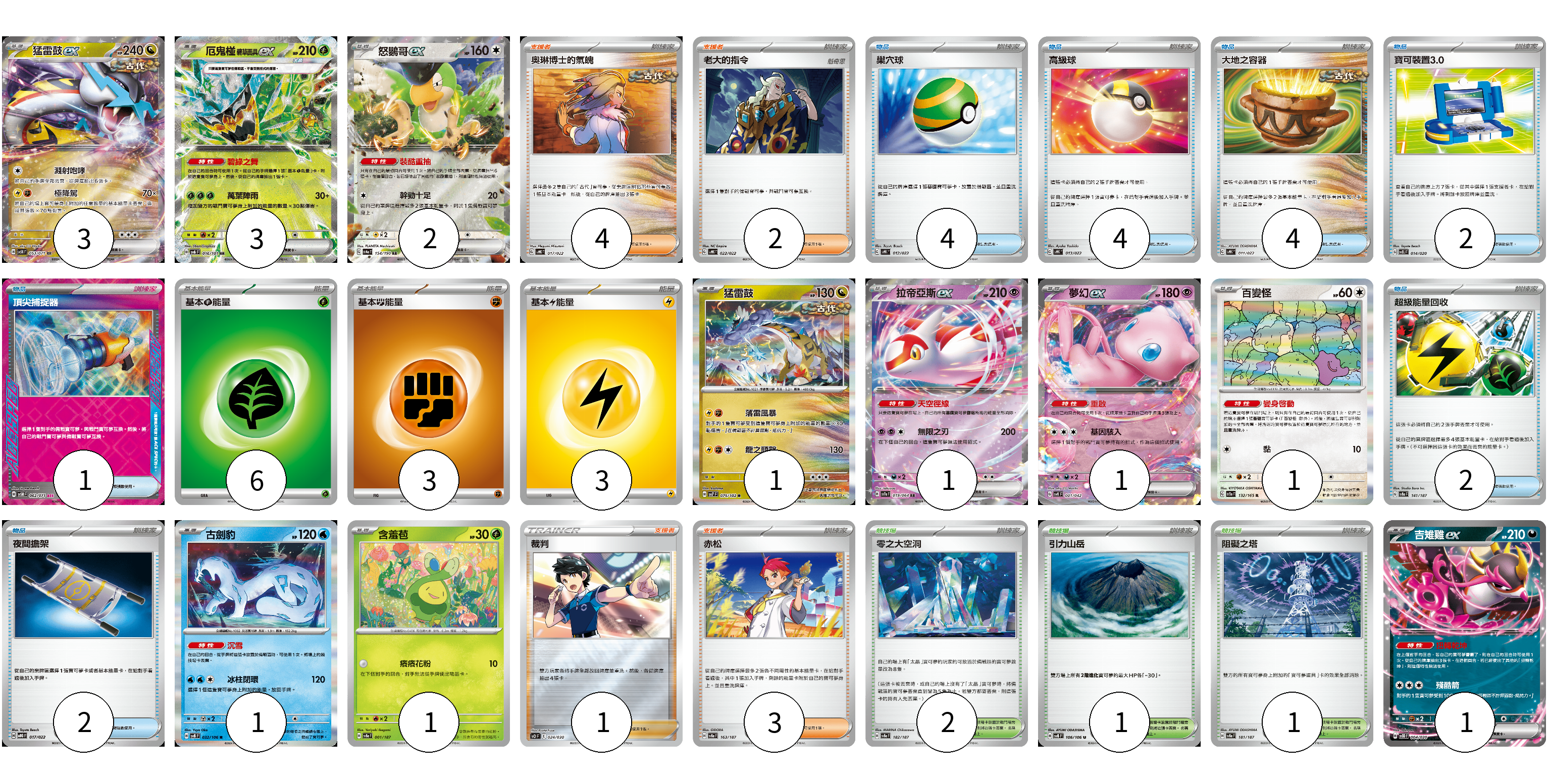 牌組構築方案 以此牌組為基礎新構築牌組 顯示卡面 顯示列表 寶可夢卡(15) 3 3 2 1 1 1 1 1 1 1 物品卡(19) 4 4 4 2 1 2 2 支援者卡(10) 4 2 1 3 競技場卡(4) 2 1 1 能量卡(12) 6 3 3 寶可夢卡(15) 卡牌名稱 張數 卡牌名稱 張數 猛雷鼓ex SV5K 053/071 03 厄鬼椪 碧草面具ex SV6 016/101 03 怒鸚哥ex SV4a 154/190 02 猛雷鼓 SV7 075/102 01 拉帝亞斯ex SV7a 019/064 01 夢幻ex SVK 001/042 01 百變怪 SV2a 132/165 01 古劍豹 SV8 032/106 01 含羞苞 SV8a 001/187 01 吉雉雞ex SVOD 004/020 01 物品卡(19) 卡牌名稱 張數 卡牌名稱 張數 巢穴球 SVHK 012/022 04 高級球 SVHK 013/022 04 大地之容器 SVHK 011/022 04 寶可裝置3.0 SVEL 014/020 02 頂尖捕捉器 SV5M 062/071 01 超級能量回收 SV8a 141/187 02 夜間擔架 MBG 017/022 02 支援者卡(10) 卡牌名稱 張數 卡牌名稱 張數 奧琳博士的氣魄 SVHK 017/022 04 老大的指令 SVHK 022/022 02 裁判 SO 024/030 01 赤松 SV8a 163/187 03 競技場卡(4) 卡牌名稱 張數 卡牌名稱 張數 零之大空洞 SV8a 182/187 02 引力山岳 SV8 106/106 01 阻礙之塔 SV8a 181/187 01 能量卡(12) 卡牌名稱 張數 卡牌名稱 張數 基本【草】能量 SVF GRA 06 基本【鬥】能量 SVF FIG 03 基本【雷】能量 SVHM LIG 03 以此牌組為基礎新構築牌組 牌組編碼 UwZJRr-ekhHbW-Xhhhet copy 列印牌組單 牌組編碼已複製 分享至SNS