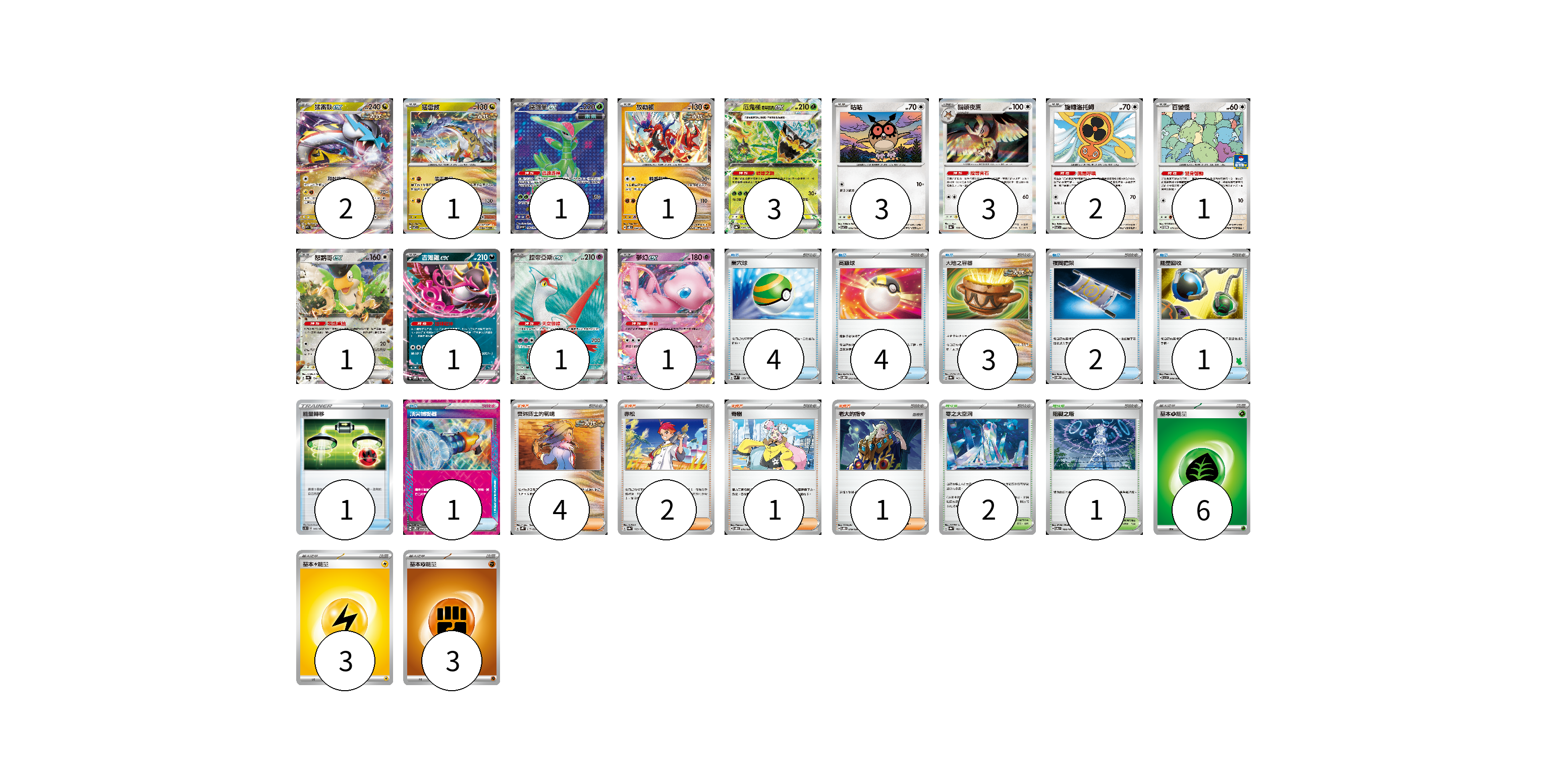 牌組構築方案 以此牌組為基礎新構築牌組 顯示卡面 顯示列表 寶可夢卡(21) 2 1 1 1 3 3 3 2 1 1 1 1 1 物品卡(16) 4 4 3 2 1 1 1 支援者卡(8) 4 2 1 1 競技場卡(3) 2 1 能量卡(12) 6 3 3 寶可夢卡(21) 卡牌名稱 張數 卡牌名稱 張數 猛雷鼓ex SV5K 053/071 02 猛雷鼓 SV7 075/102 01 鐵斑葉ex SV5M 084/071 01 故勒頓 SV8 069/106 01 厄鬼椪 碧草面具ex SV8a 020/187 03 咕咕 SV7 076/102 03 貓頭夜鷹 SV8a 128/187 03 旋轉洛托姆 SV7 080/102 02 百變怪 SV-P 111/SV-P 01 怒鸚哥ex SV4a 154/190 01 吉雉雞ex SVOM 009/021 01 拉帝亞斯ex SV7a 078/064 01 夢幻ex SVK 001/042 01 物品卡(16) 卡牌名稱 張數 卡牌名稱 張數 巢穴球 SVM 133/175 04 高級球 SVOD 012/020 04 大地之容器 SV8a 143/187 03 夜間擔架 SVOM 016/021 02 能量回收 SVI 049/066 01 能量轉移 SC1D 146/164 01 頂尖捕捉器 SV5M 062/071 01 支援者卡(8) 卡牌名稱 張數 卡牌名稱 張數 奧琳博士的氣魄 SVHK 017/022 04 赤松 SV8a 163/187 02 奇樹 SVOD 016/020 01 老大的指令 SVOD 019/020 01 競技場卡(3) 卡牌名稱 張數 卡牌名稱 張數 零之大空洞 SV8a 182/187 02 阻礙之塔 SV6 100/101 01 能量卡(12) 卡牌名稱 張數 卡牌名稱 張數 基本草能量 sv-p GRA 06 基本雷能量 sv-p LIG 03 基本鬥能量 sv-p FIG 03 以此牌組為基礎新構築牌組 牌組編碼 UxOBkQ-oMIqXN-ncQtMR copy 列印牌組單 牌組編碼已複製 分享至SNS