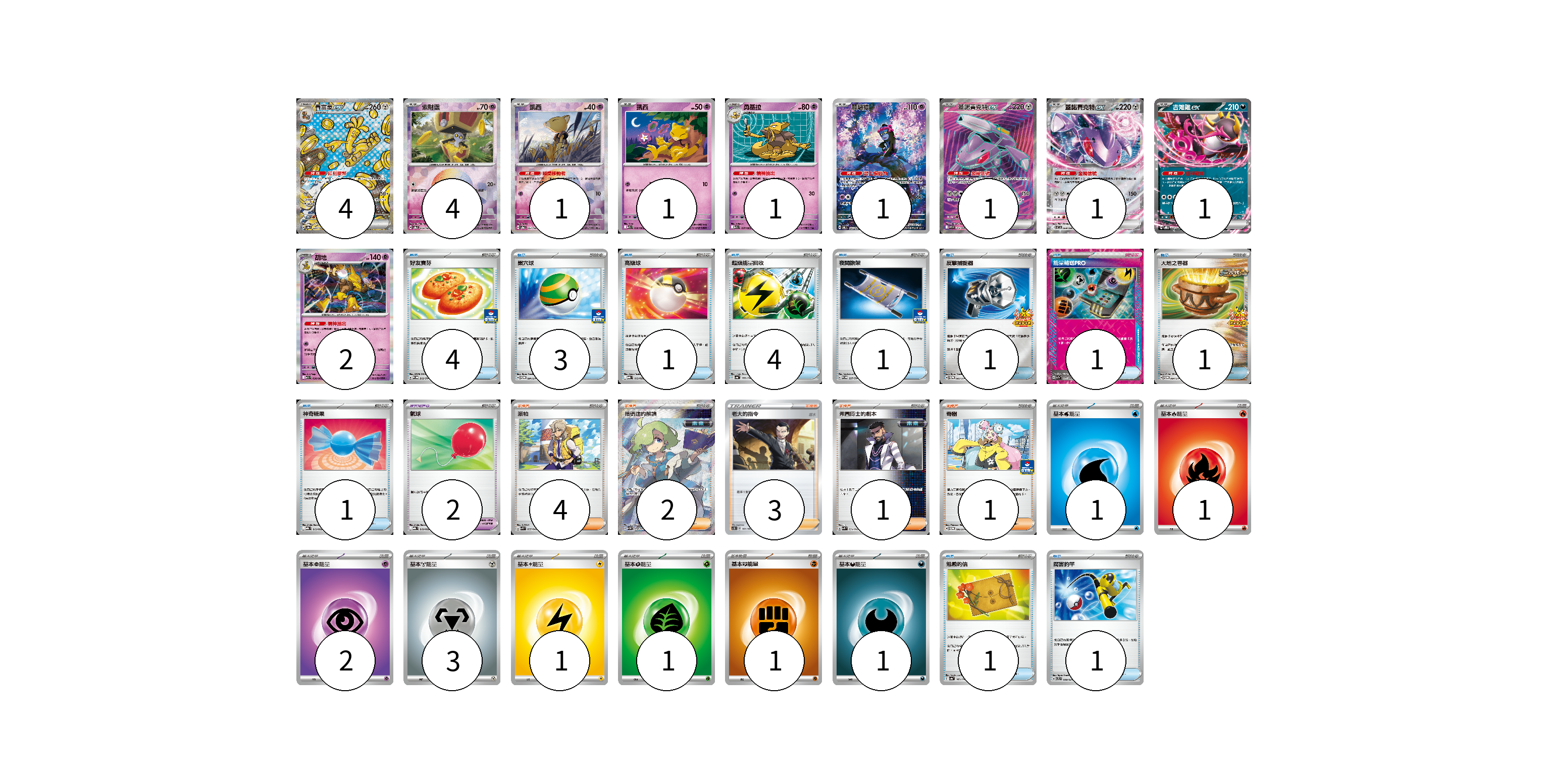 牌組構築方案 以此牌組為基礎新構築牌組 顯示卡面 顯示列表 寶可夢卡(17) 4 4 1 1 1 1 1 1 1 2 寶可夢道具(2) 2 物品卡(19) 4 3 1 4 1 1 1 1 1 1 1 支援者卡(11) 4 2 3 1 1 能量卡(11) 1 1 2 3 1 1 1 1 寶可夢卡(17) 卡牌名稱 張數 卡牌名稱 張數 賽富豪ex SV8a 220/187 04 索財靈 SV8a 073/187 04 凱西 SV8a 057/187 01 凱西 M1S 036/063 01 勇基拉 M1S 037/063 01 願增猿 SV6 107/101 01 蓋諾賽克特ex SV11B 164/086 01 蓋諾賽克特ex SV11B 069/086 01 吉雉雞ex SVOD 004/020 01 胡地 M1S 038/063 02 寶可夢道具(2) 卡牌名稱 張數 卡牌名稱 張數 氣球 MBG 019/022 02 物品卡(19) 卡牌名稱 張數 卡牌名稱 張數 好友寶芬 SV-P 212/SV-P 04 巢穴球 SV-P 091/SV-P 03 高級球 MBG 012/022 01 超級能量回收 SV4a 157/190 04 夜間擔架 SV-P 227/SV-P 01 反擊捕捉器 SV-P 083/SV-P 01 能量輸送PRO SV7a 052/064 01 大地之容器 SV-P 084/SV-P 01 神奇糖果 MBG 013/022 01 勉勵的信 SV4a 162/190 01 厲害釣竿 SVTL 009/021 01 支援者卡(11) 卡牌名稱 張數 卡牌名稱 張數 派帕 SVK 035/042 04 暗碼迷的解讀 SV5M 090/071 02 老大的指令(坂木) SC1D 161/164 03 弗圖博士的劇本 SVK 034/042 01 奇樹 SV-P 106/SV-P 01 能量卡(11) 卡牌名稱 張數 卡牌名稱 張數 基本水能量 sv-p WAT 01 基本火能量 sv-p FIR 01 基本超能量 sv-p PSY 02 基本鋼能量 sv-p MET 03 基本雷能量 sv-p LIG 01 基本草能量 sv-p GRA 01 基本【鬥】能量 SVAM FIG 01 基本惡能量 sv-p DAR 01 以此牌組為基礎新構築牌組 牌組編碼 UysWAW-amFCHF-qQkXkW copy 列印牌組單 牌組編碼已複製 分享至SNS