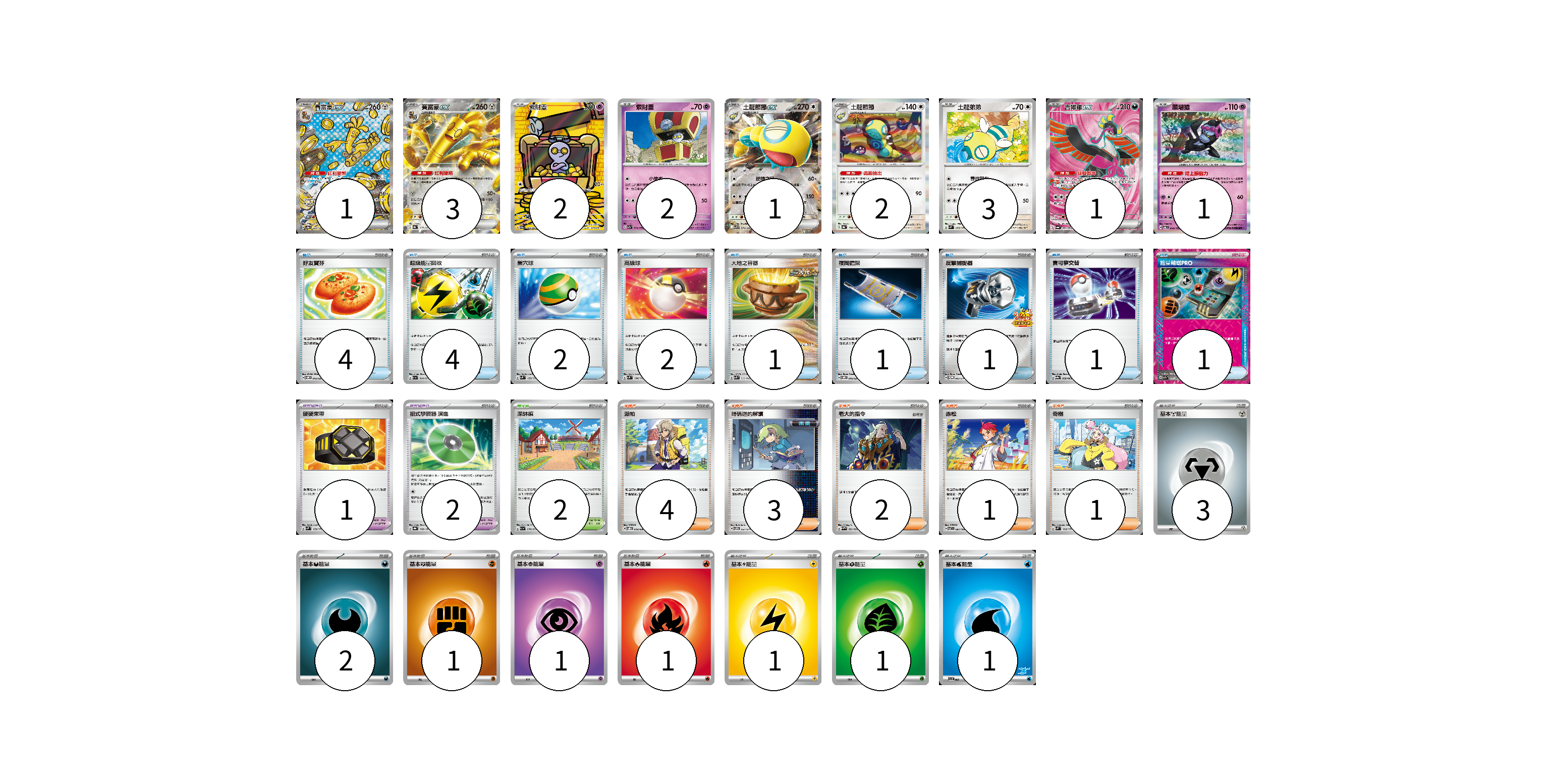 牌組構築方案 以此牌組為基礎新構築牌組 顯示卡面 顯示列表 寶可夢卡(16) 1 3 2 2 1 2 3 1 1 寶可夢道具(3) 1 2 物品卡(17) 4 4 2 2 1 1 1 1 1 支援者卡(11) 4 3 2 1 1 競技場卡(2) 2 能量卡(11) 3 2 1 1 1 1 1 1 寶可夢卡(16) 卡牌名稱 張數 卡牌名稱 張數 賽富豪ex SV8a 220/187 01 賽富豪ex SV8a 117/187 03 索財靈 SV3a 068/062 02 索財靈 SV7a 024/064 02 土龍節節ex SV9 079/100 01 土龍節節 SV8a 130/187 02 土龍弟弟 SVM 095/175 03 吉雉雞ex SV6a 081/064 01 願增猿 SV6 055/101 01 寶可夢道具(3) 卡牌名稱 張數 卡牌名稱 張數 硬硬束帶 SVM 139/175 01 招式學習器 演進 SV8a 160/187 02 物品卡(17) 卡牌名稱 張數 卡牌名稱 張數 好友寶芬 SVOM 012/021 04 超級能量回收 SV1a 064/073 04 巢穴球 SVM 133/175 02 高級球 SVM 134/175 02 大地之容器 SVK 012/042 01 夜間擔架 SVOM 016/021 01 反擊捕捉器 SV-P 083/SV-P 01 寶可夢交替 SV9a 058/063 01 能量輸送PRO SV7a 052/064 01 支援者卡(11) 卡牌名稱 張數 卡牌名稱 張數 派帕 SVOD 018/020 04 暗碼迷的解讀 SV5M 067/071 03 老大的指令 SVHM 022/022 02 赤松 SV7 097/102 01 奇樹 SVM 160/175 01 競技場卡(2) 卡牌名稱 張數 卡牌名稱 張數 深缽鎮 SV1a 070/073 02 能量卡(11) 卡牌名稱 張數 卡牌名稱 張數 基本【鋼】能量 SVTH MET 03 基本【惡】能量 SVF DAR 02 基本【鬥】能量 SVF FIG 01 基本【超】能量 SVEM PSY 01 基本【火】能量 SVEL FIR 01 基本【雷】能量 SVHM LIG 01 基本【草】能量 SVTM GRA 01 基本【水】能量 SVI WAT 01 以此牌組為基礎新構築牌組 牌組編碼 UyxQvW-mlXSMb-yhIHwu copy 列印牌組單 牌組編碼已複製 分享至SNS