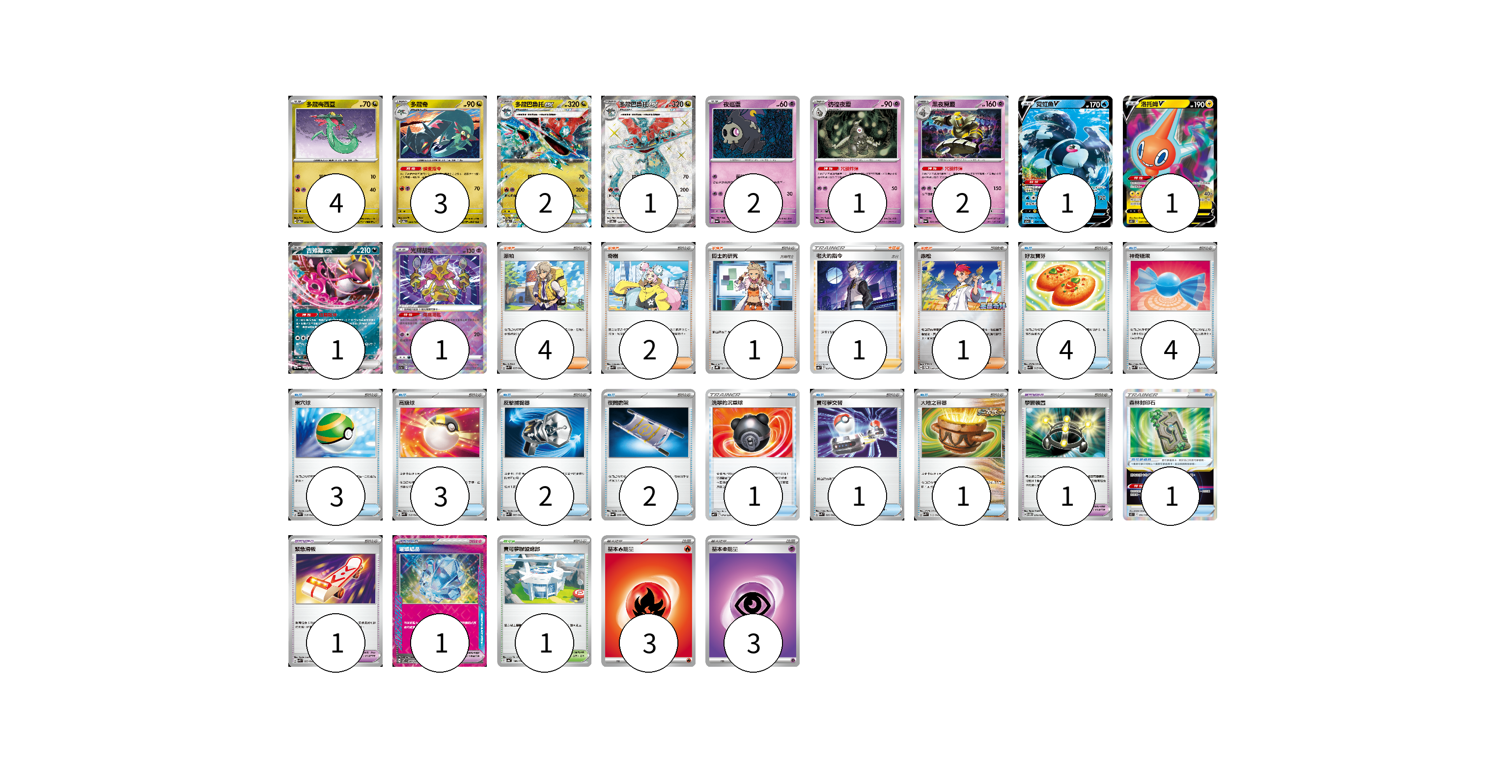 牌組構築方案 以此牌組為基礎新構築牌組 顯示卡面 顯示列表 寶可夢卡(19) 4 3 2 1 2 1 2 1 1 1 1 寶可夢道具(4) 1 1 1 1 物品卡(21) 4 4 3 3 2 2 1 1 1 支援者卡(9) 4 2 1 1 1 競技場卡(1) 1 能量卡(6) 3 3 寶可夢卡(19) 卡牌名稱 張數 卡牌名稱 張數 多龍梅西亞 SV6 079/101 04 多龍奇 SV6 080/101 03 多龍巴魯托ex SV6 081/101 02 多龍巴魯托ex SV6 120/101 01 夜巡靈 SV6a 018/064 02 彷徨夜靈 SV6a 019/064 01 黑夜魔靈 SV6a 020/064 02 霓虹魚V S12a 026/172 01 洛托姆V S11 037/100 01 吉雉雞ex SV6a 038/064 01 光輝胡地 S11a 031/068 01 寶可夢道具(4) 卡牌名稱 張數 卡牌名稱 張數 學習裝置 SVTM 016/022 01 森林封印石 S12 092/098 01 緊急滑板 SVK 023/042 01 璀璨結晶 SV7 094/102 01 物品卡(21) 卡牌名稱 張數 卡牌名稱 張數 好友寶芬 SVK 015/042 04 神奇糖果 SVK 019/042 04 巢穴球 SVK 016/042 03 高級球 SVK 018/042 03 反擊捕捉器 SVK 009/042 02 夜間擔架 SV6a 056/064 02 洗翠的沉重球 SVF 019/038 01 寶可夢交替 SVK 022/042 01 大地之容器 SVK 012/042 01 支援者卡(9) 卡牌名稱 張數 卡牌名稱 張數 派帕 SVK 035/042 04 奇樹 SVK 031/042 02 博士的研究 SVHK 021/022 01 老大的指令(赤日) SVB 024/028 01 赤松 SV-P 150/SV-P 01 競技場卡(1) 卡牌名稱 張數 卡牌名稱 張數 寶可夢聯盟總部 SV4a 186/190 01 能量卡(6) 卡牌名稱 張數 卡牌名稱 張數 基本火能量 sv-p FIR 03 基本超能量 sv-p PSY 03 以此牌組為基礎新構築牌組 牌組編碼 VBvhon-AXxbOF-YDcnbK copy 列印牌組單 牌組編碼已複製 分享至SNS
