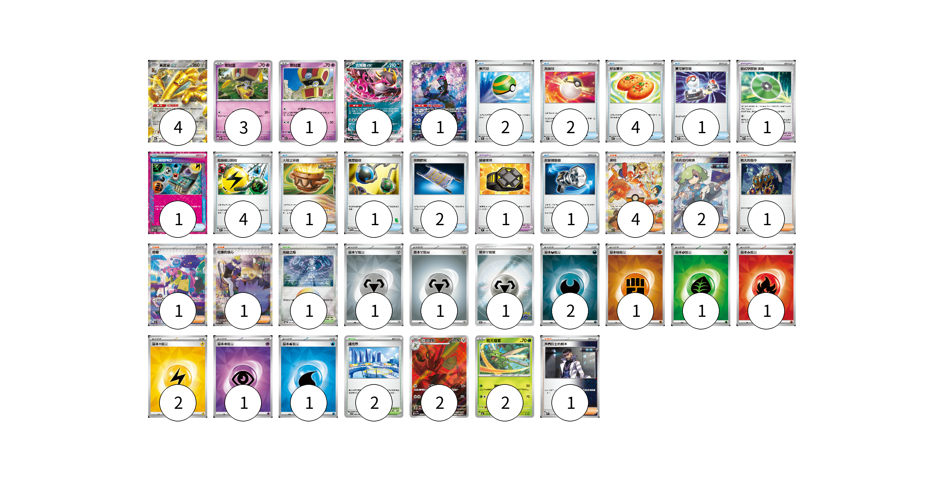 牌組構築方案 以此牌組為基礎新構築牌組 顯示卡面 顯示列表 寶可夢卡(14) 4 3 1 1 1 2 2 寶可夢道具(2) 1 1 物品卡(19) 2 2 4 1 1 4 1 1 2 1 支援者卡(10) 4 2 1 1 1 1 競技場卡(3) 1 2 能量卡(12) 1 1 1 2 1 1 1 2 1 1 寶可夢卡(14) 卡牌名稱 張數 卡牌名稱 張數 賽富豪ex SV8a 117/187 04 索財靈 SV8a 073/187 03 索財靈 SV7a 024/064 01 吉雉雞ex SV6a 038/064 01 願增猿 SV6 107/101 01 巨鉗螳螂 SV3 116/108 02 飛天螳螂 SV2a 123/165 02 寶可夢道具(2) 卡牌名稱 張數 卡牌名稱 張數 招式學習器 演進 SVK 025/042 01 硬硬束帶 SVM 139/175 01 物品卡(19) 卡牌名稱 張數 卡牌名稱 張數 巢穴球 SVM 133/175 02 高級球 SVM 134/175 02 好友寶芬 SVK 015/042 04 寶可夢交替 SVK 022/042 01 能量輸送PRO SV7a 052/064 01 超級能量回收 SVK 010/042 04 大地之容器 SVK 012/042 01 能量回收 SVI 049/066 01 夜間擔架 SV6a 056/064 02 反擊捕捉器 SV8a 139/187 01 支援者卡(10) 卡牌名稱 張數 卡牌名稱 張數 派帕 SV4a 353/190 04 暗碼迷的解讀 SV5M 090/071 02 老大的指令 SVM 172/175 01 奇樹 SV4a 350/190 01 松葉的信心 SV5K 097/071 01 弗圖博士的劇本 SVK 034/042 01 競技場卡(3) 卡牌名稱 張數 卡牌名稱 張數 阻礙之塔 SV8a 181/187 01 釀光市 SV9 098/100 02 能量卡(12) 卡牌名稱 張數 卡牌名稱 張數 基本【鋼】能量 SVK MET 01 基本【鋼】能量 SVF MET 01 基本鋼能量 S10b MET 01 基本【惡】能量 SVK DAR 02 基本【鬥】能量 SVK FIG 01 基本【草】能量 SVK GRA 01 基本【火】能量 SVK FIR 01 基本【雷】能量 SVK LIG 02 基本【超】能量 SVK PSY 01 基本【水】能量 SVK WAT 01 以此牌組為基礎新構築牌組 牌組編碼 VDJFTI-pqjcaQ-rOpZOk copy 列印牌組單 牌組編碼已複製 分享至SNS