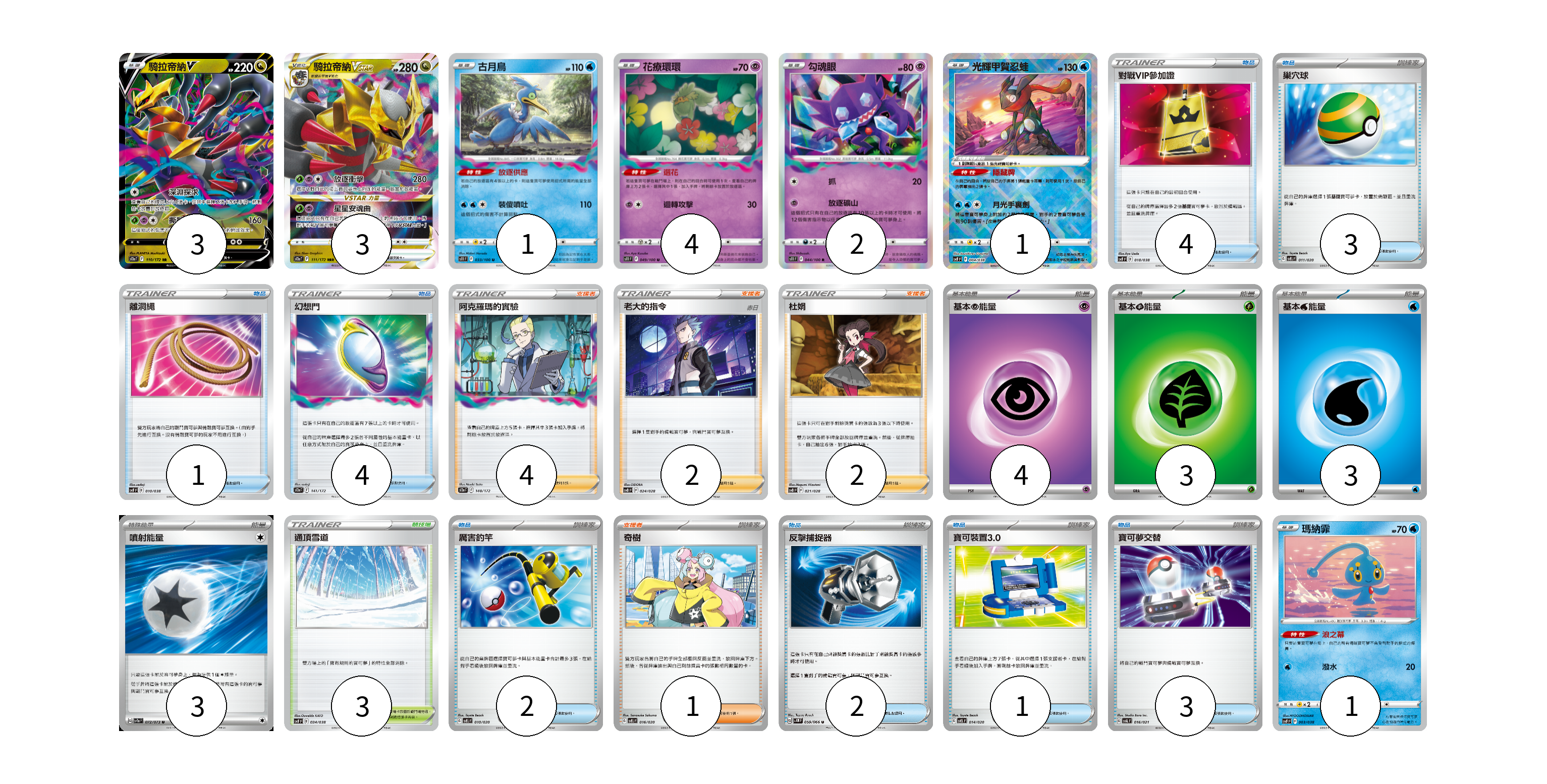 牌組構築方案 以此牌組為基礎新構築牌組 顯示卡面 顯示列表 寶可夢卡(17) 3 3 1 4 2 1 2 1 物品卡(18) 4 3 1 4 2 1 3 支援者卡(9) 4 2 2 1 競技場卡(3) 3 能量卡(13) 4 3 3 3 寶可夢卡(17) 卡牌名稱 張數 卡牌名稱 張數 騎拉帝納V S12a 110/172 03 騎拉帝納VSTAR S12a 111/172 03 古月鳥 S11 033/100 01 花療環環 S11 049/100 04 勾魂眼 S11 044/100 02 光輝甲賀忍蛙 SVF 004/038 01 厲害釣竿 SVEL 010/020 02 瑪納霏 SVF 003/038 01 物品卡(18) 卡牌名稱 張數 卡牌名稱 張數 對戰VIP參加證 SVF 018/038 04 巢穴球 SVEL 011/020 03 離洞繩 SVF 010/038 01 幻想門 S12a 141/172 04 反擊捕捉器 SV4M 059/066 02 寶可裝置3.0 SVEL 014/020 01 寶可夢交替 SVAL 016/021 03 支援者卡(9) 卡牌名稱 張數 卡牌名稱 張數 阿克羅瑪的實驗 S12a 148/172 04 老大的指令(赤日) SVB 024/028 02 杜娟 SVB 021/028 02 奇樹 SVEL 016/020 01 競技場卡(3) 卡牌名稱 張數 卡牌名稱 張數 通頂雪道 SVF 034/038 03 能量卡(13) 卡牌名稱 張數 卡牌名稱 張數 基本超能量 sv-p PSY 04 基本草能量 sv-p GRA 03 基本水能量 sv-p WAT 03 噴射能量 SV1a 072/073 03 以此牌組為基礎新構築牌組 牌組編碼 VElzlT-pZLtdc-zXYYrV copy 列印牌組單 牌組編碼已複製 分享至SNS