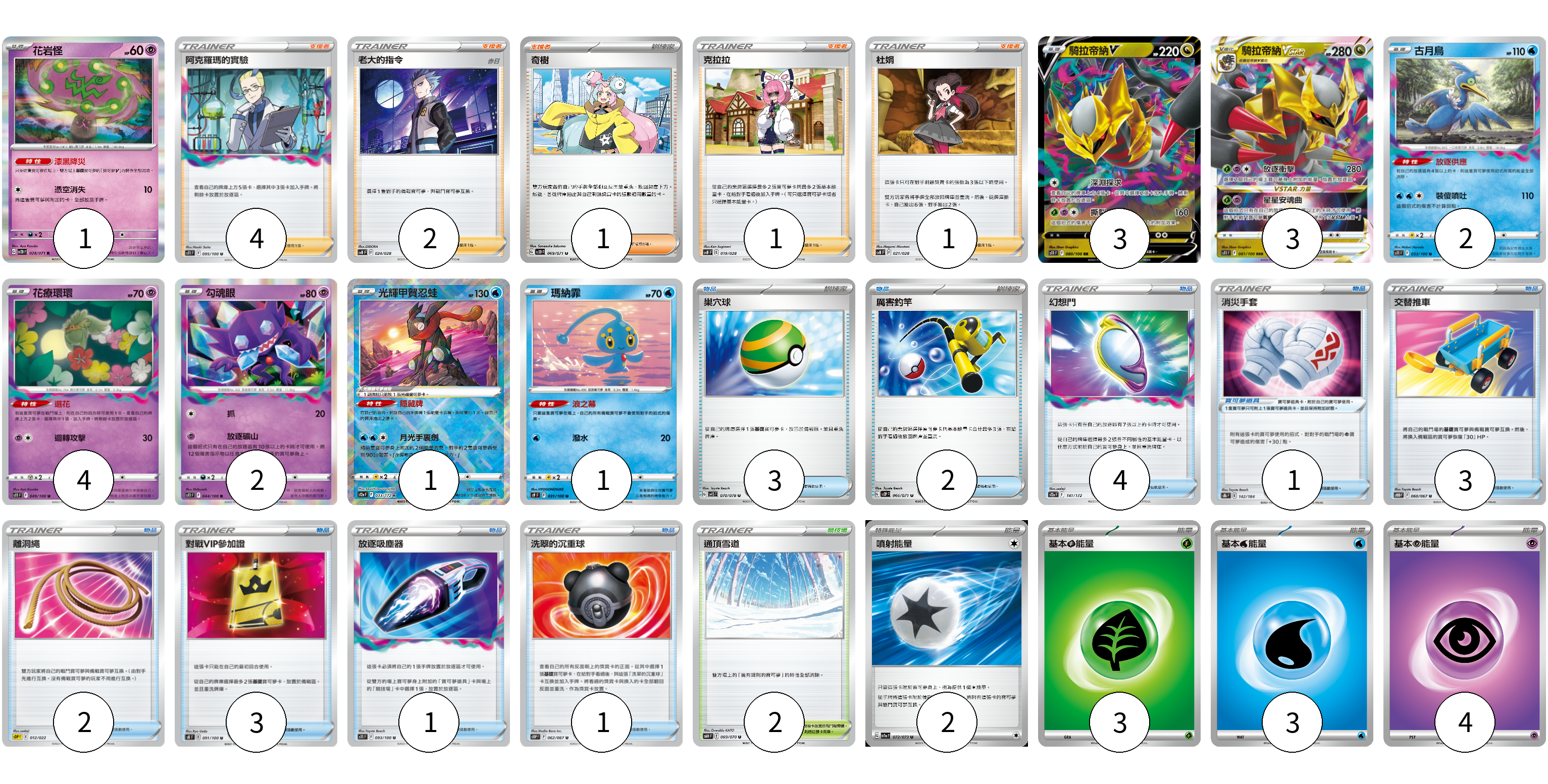 牌組構築方案 以此牌組為基礎新構築牌組 顯示卡面 顯示列表 寶可夢卡(17) 1 3 3 2 4 2 1 1 寶可夢道具(1) 1 物品卡(19) 3 2 4 3 2 3 1 1 支援者卡(9) 4 2 1 1 1 競技場卡(2) 2 能量卡(12) 2 3 3 4 寶可夢卡(17) 卡牌名稱 張數 卡牌名稱 張數 花岩怪 SV2D 028/071 01 騎拉帝納V S11 080/100 03 騎拉帝納VSTAR S11 081/100 03 古月鳥 S11 033/100 02 花療環環 S11 049/100 04 勾魂眼 S11 044/100 02 光輝甲賀忍蛙 S12a 033/172 01 瑪納霏 S9 031/100 01 寶可夢道具(1) 卡牌名稱 張數 卡牌名稱 張數 消災手套 S8b 142/184 01 物品卡(19) 卡牌名稱 張數 卡牌名稱 張數 巢穴球 SV1S 070/078 03 厲害釣竿 SV2P 066/071 02 幻想門 S12a 141/172 04 交替推車 S10D 060/067 03 離洞繩 SDP 012/022 02 對戰VIP參加證 S8 091/100 03 放逐吸塵器 S11 093/100 01 洗翠的沉重球 S10P 062/067 01 支援者卡(9) 卡牌名稱 張數 卡牌名稱 張數 阿克羅瑪的實驗 S11 095/100 04 老大的指令(赤日) SVB 024/028 02 奇樹 SV2D 069/071 01 克拉拉 SVB 019/028 01 杜娟 SVB 021/028 01 競技場卡(2) 卡牌名稱 張數 卡牌名稱 張數 通頂雪道 S6H 069/070 02 能量卡(12) 卡牌名稱 張數 卡牌名稱 張數 噴射能量 SV1a 072/073 02 基本【草】能量 SVB GRA 03 基本【水】能量 SVB WAT 03 基本【超】能量 SVB PSY 04 以此牌組為基礎新構築牌組 牌組編碼 VFBeVW-kMrzVz-iBTkwK copy 列印牌組單 牌組編碼已複製 分享至SNS