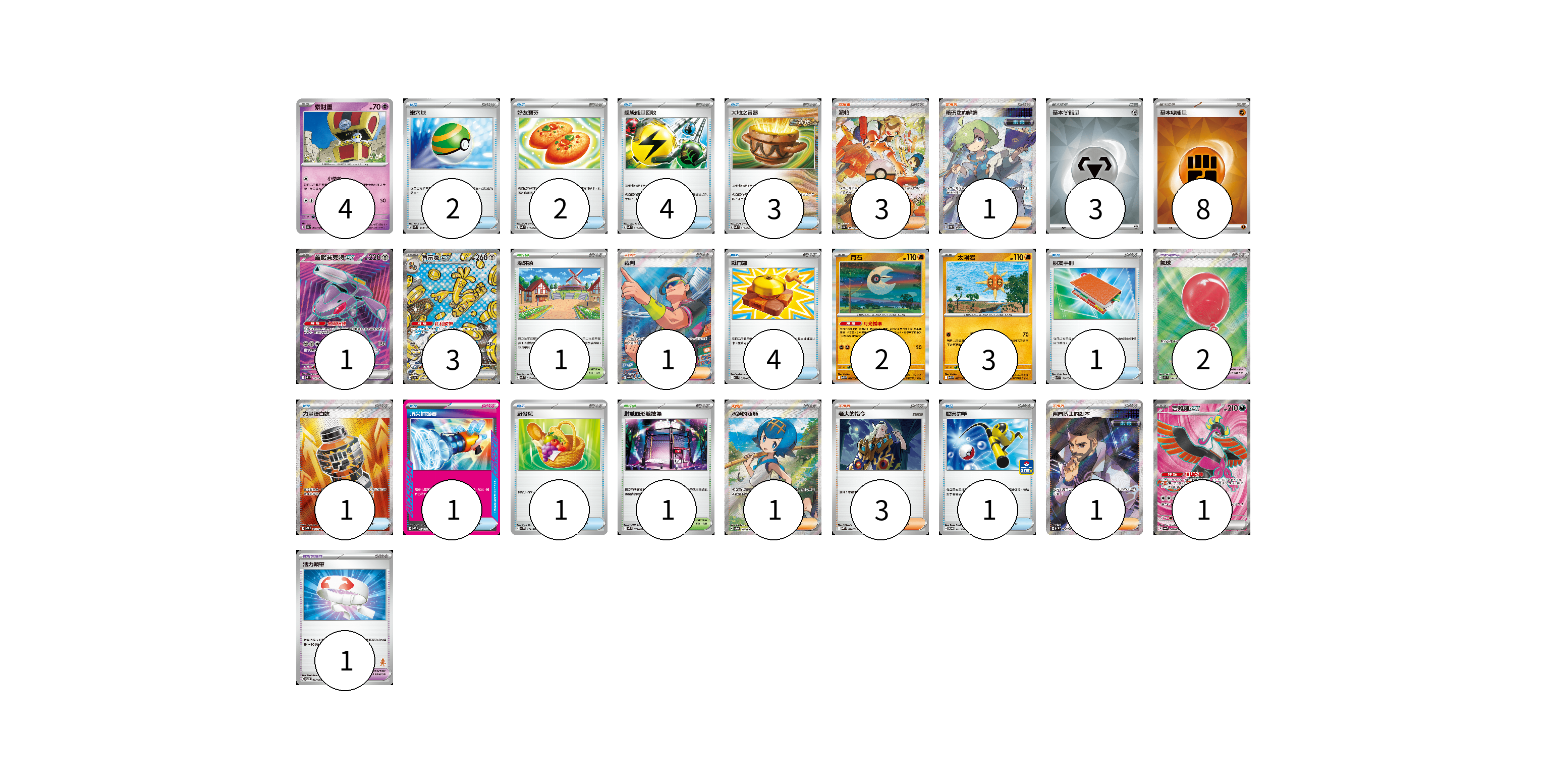 牌組構築方案 以此牌組為基礎新構築牌組 顯示卡面 顯示列表 寶可夢卡(14) 4 1 3 2 3 1 寶可夢道具(3) 2 1 物品卡(20) 2 2 4 3 4 1 1 1 1 1 支援者卡(10) 3 1 1 1 3 1 競技場卡(2) 1 1 能量卡(11) 3 8 寶可夢卡(14) 卡牌名稱 張數 卡牌名稱 張數 索財靈 SV7a 024/064 04 蓋諾賽克特ex SV11B 164/086 01 賽富豪ex SV8a 220/187 03 月石 M1L 026/063 02 太陽岩 M1L 027/063 03 吉雉雞ex SV6a 081/064 01 寶可夢道具(3) 卡牌名稱 張數 卡牌名稱 張數 氣球 M1L 084/063 02 活力頭帶 SVI 057/066 01 物品卡(20) 卡牌名稱 張數 卡牌名稱 張數 巢穴球 SVM 133/175 02 好友寶芬 SVK 015/042 02 超級能量回收 SVK 010/042 04 大地之容器 SVK 012/042 03 戰鬥鑼 M1L 059/063 04 朋友手冊 SVK 014/042 01 力量蛋白飲 M1L 081/063 01 頂尖捕捉器 MBG 014/022 01 野餐籃 SV1V 071/078 01 厲害釣竿 SV-P 112/SV-P 01 支援者卡(10) 卡牌名稱 張數 卡牌名稱 張數 派帕 SV4a 353/190 03 暗碼迷的解讀 SV5M 090/071 01 裁判 SV9a 083/063 01 水蓮的照顧 SV5a 088/066 01 老大的指令 MBD 020/022 03 弗圖博士的劇本 SV4M 086/066 01 競技場卡(2) 卡牌名稱 張數 卡牌名稱 張數 深缽鎮 SVK 039/042 01 對戰圓形競技場 M2 079/080 01 能量卡(11) 卡牌名稱 張數 卡牌名稱 張數 基本【鋼】能量 SVK MET 03 基本【鬥】能量 SVK FIG 08 以此牌組為基礎新構築牌組 牌組編碼 VFNTiP-VflVBt-FZiuua copy 列印牌組單 牌組編碼已複製 分享至SNS