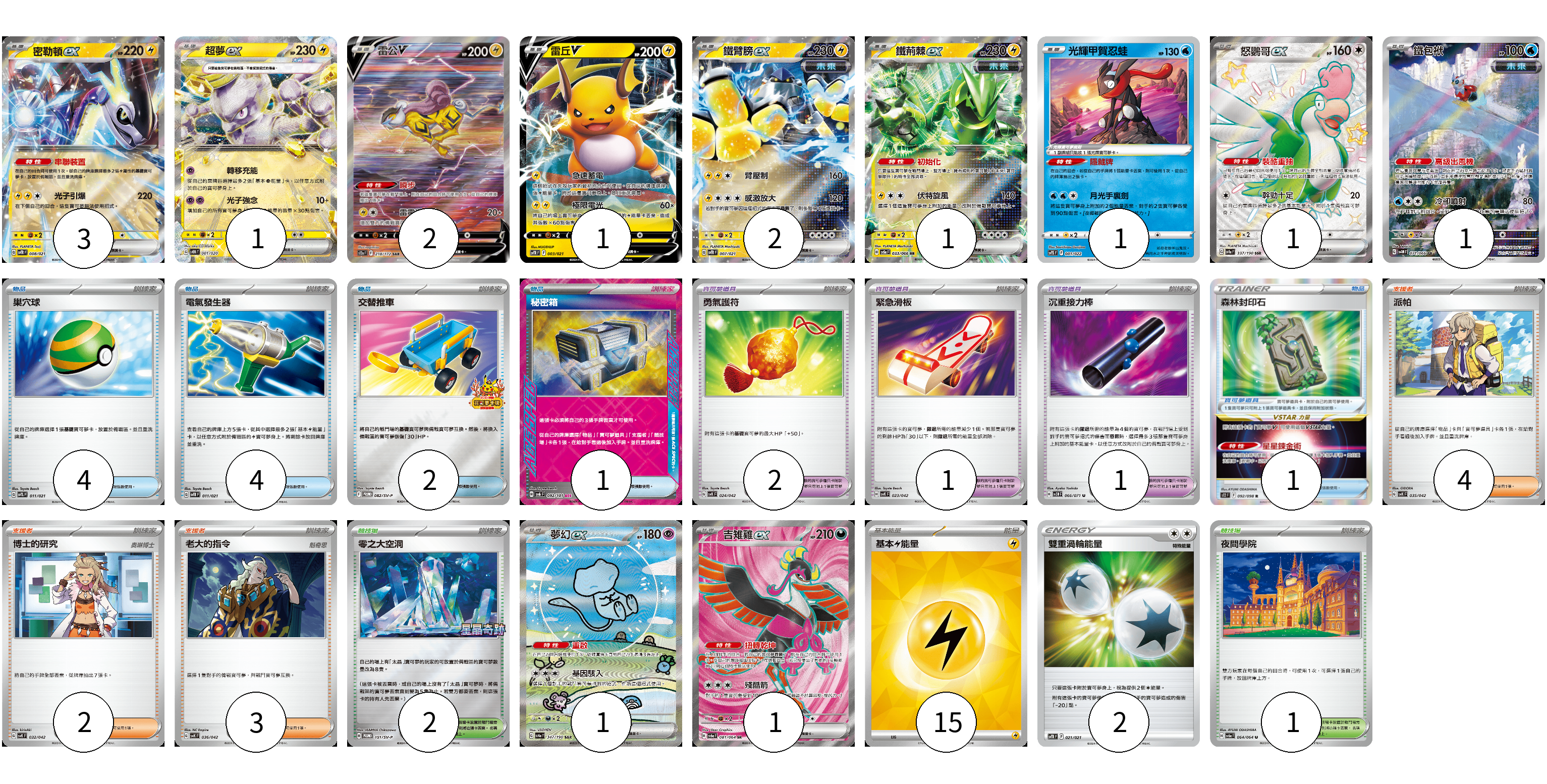 牌組構築方案 以此牌組為基礎新構築牌組 顯示卡面 顯示列表 寶可夢卡(15) 3 1 2 1 2 1 1 1 1 1 1 寶可夢道具(5) 2 1 1 1 物品卡(11) 4 4 2 1 支援者卡(9) 4 2 3 競技場卡(3) 2 1 能量卡(17) 15 2 寶可夢卡(15) 卡牌名稱 張數 卡牌名稱 張數 密勒頓ex SVTR 008/021 03 超夢ex SVEM 001/020 01 雷公V S12a 218/172 02 雷丘V SVTR 003/021 01 鐵臂膀ex SVTR 007/021 02 鐵荊棘ex SV5a 033/066 01 光輝甲賀忍蛙 SVTS 001/022 01 怒鸚哥ex SV4a 337/190 01 鐵包袱 SV4M 071/066 01 夢幻ex SV4a 347/190 01 吉雉雞ex SV6a 081/064 01 寶可夢道具(5) 卡牌名稱 張數 卡牌名稱 張數 勇氣護符 SVK 024/042 02 緊急滑板 SVK 023/042 01 沉重接力棒 SV5M 066/071 01 森林封印石 S12 092/098 01 物品卡(11) 卡牌名稱 張數 卡牌名稱 張數 巢穴球 SVTL 011/021 04 電氣發生器 SVTR 011/021 04 交替推車 SV-P 082/SV-P 02 秘密箱 SV6 092/101 01 支援者卡(9) 卡牌名稱 張數 卡牌名稱 張數 派帕 SVK 035/042 04 博士的研究 SVK 032/042 02 老大的指令 SVK 036/042 03 競技場卡(3) 卡牌名稱 張數 卡牌名稱 張數 零之大空洞 SV-P 151/SV-P 02 夜間學院 SV6a 064/064 01 能量卡(17) 卡牌名稱 張數 卡牌名稱 張數 基本【雷】能量 SVK LIG 15 雙重渦輪能量 SVTR 021/021 02 以此牌組為基礎新構築牌組 牌組編碼 VHDgdU-qNZRLv-EPKDVT copy 列印牌組單 牌組編碼已複製 分享至SNS