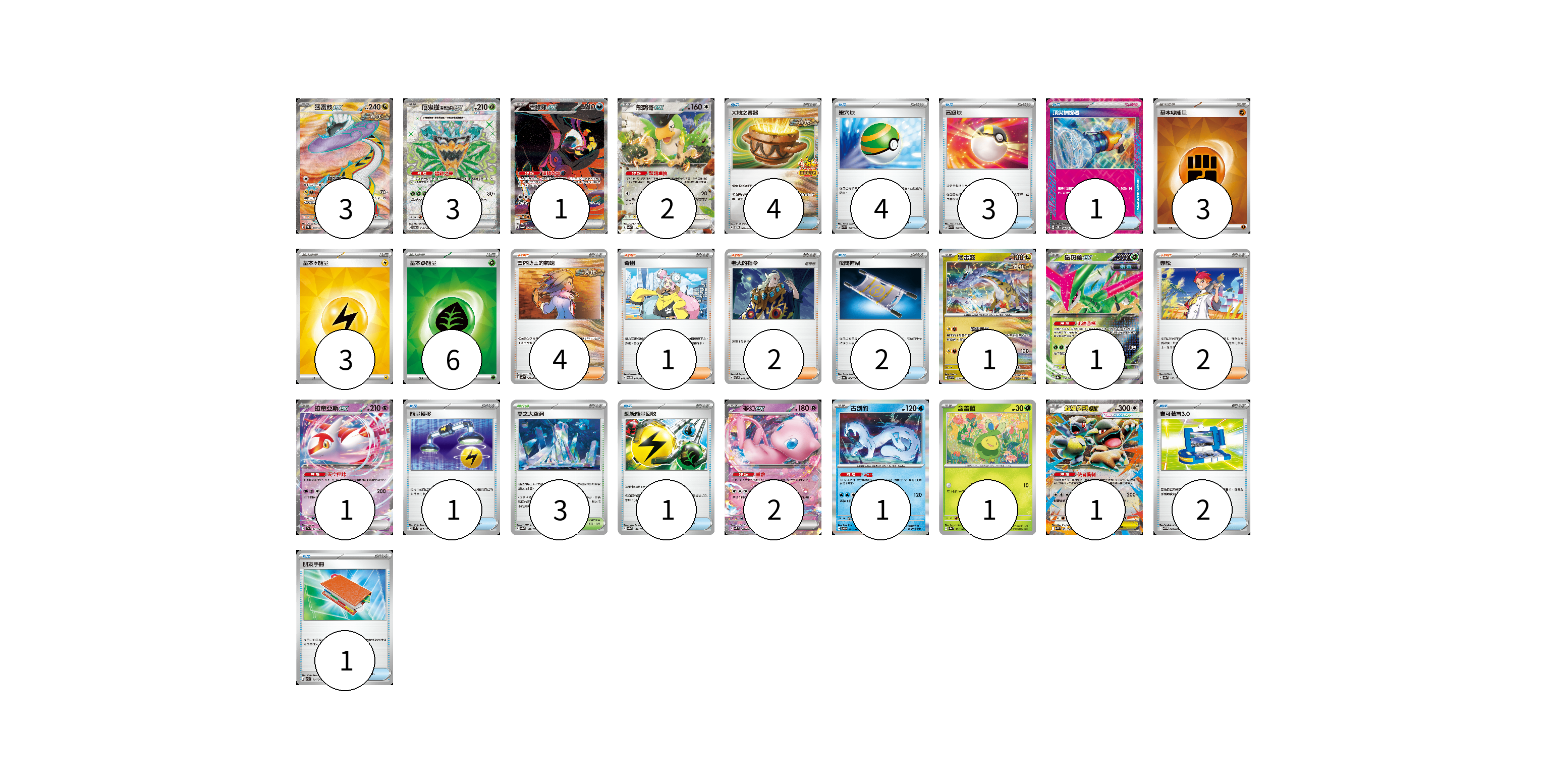 牌組構築方案 以此牌組為基礎新構築牌組 顯示卡面 顯示列表 寶可夢卡(17) 3 3 1 2 1 1 1 2 1 1 1 物品卡(19) 4 4 3 1 2 1 1 2 1 支援者卡(9) 4 1 2 2 競技場卡(3) 3 能量卡(12) 3 3 6 寶可夢卡(17) 卡牌名稱 張數 卡牌名稱 張數 猛雷鼓ex SV5K 089/071 03 厄鬼椪 碧草面具ex SV6 114/101 03 吉雉雞ex SV6a 089/064 01 怒鸚哥ex SV4a 154/190 02 猛雷鼓 SV7 075/102 01 鐵斑葉ex SV8a 016/187 01 拉帝亞斯ex SV7a 019/064 01 夢幻ex SVK 001/042 02 古劍豹 SV8 032/106 01 含羞苞 SV8a 001/187 01 超級袋獸ex M1S 051/063 01 物品卡(19) 卡牌名稱 張數 卡牌名稱 張數 大地之容器 SV-P 084/SV-P 04 巢穴球 SVK 016/042 04 高級球 SVK 018/042 03 頂尖捕捉器 SV5M 062/071 01 夜間擔架 SV6a 056/064 02 能量轉移 SVM 127/175 01 超級能量回收 SV8a 141/187 01 寶可裝置3.0 SV11B 081/086 02 朋友手冊 SVK 014/042 01 支援者卡(9) 卡牌名稱 張數 卡牌名稱 張數 奧琳博士的氣魄 SV4K 064/066 04 奇樹 SVTM 017/022 01 老大的指令 SVTR 019/021 02 赤松 SV8a 163/187 02 競技場卡(3) 卡牌名稱 張數 卡牌名稱 張數 零之大空洞 SV8a 182/187 03 能量卡(12) 卡牌名稱 張數 卡牌名稱 張數 基本【鬥】能量 SVK FIG 03 基本【雷】能量 SVK LIG 03 基本【草】能量 SVK GRA 06 以此牌組為基礎新構築牌組 牌組編碼 VIVdxL-IJjIDY-UudriR copy 列印牌組單 牌組編碼已複製 分享至SNS