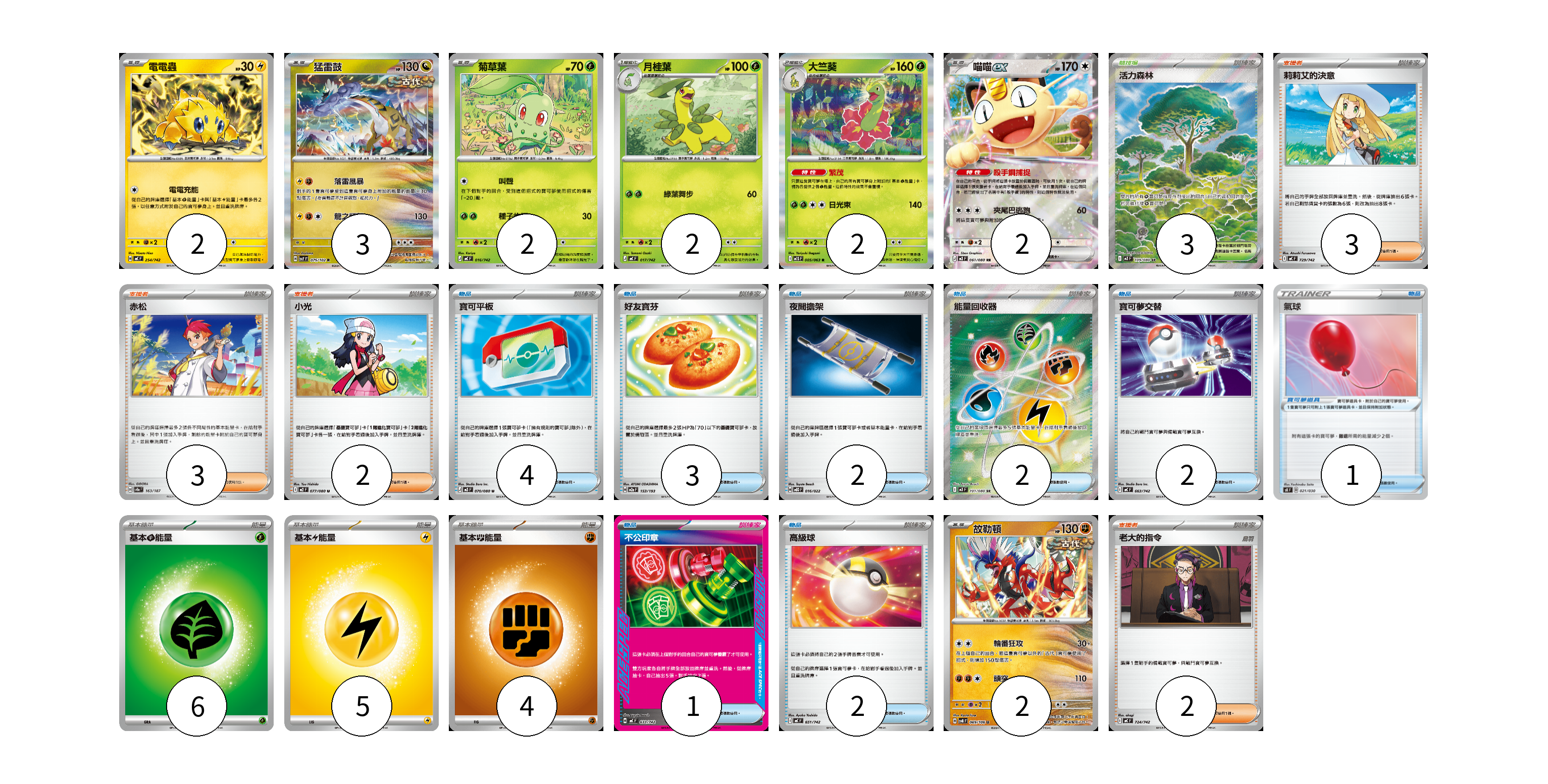 牌組構築方案 以此牌組為基礎新構築牌組 顯示卡面 顯示列表 寶可夢卡(15) 2 3 2 2 2 2 2 寶可夢道具(1) 1 物品卡(16) 4 3 2 2 2 1 2 支援者卡(10) 3 3 2 2 競技場卡(3) 3 能量卡(15) 6 5 4 寶可夢卡(15) 卡牌名稱 張數 卡牌名稱 張數 電電蟲 MC 254/742 02 猛雷鼓 SV7 075/102 03 菊草葉 MC 016/742 02 月桂葉 MC 017/742 02 大竺葵 M1S 005/063 02 喵喵ex M3 061/080 02 故勒頓 SV8 069/106 02 寶可夢道具(1) 卡牌名稱 張數 卡牌名稱 張數 氣球 SK 021/030 01 物品卡(16) 卡牌名稱 張數 卡牌名稱 張數 寶可平板 M3 070/080 04 好友寶芬 M2a 153/193 03 夜間擔架 MBD 016/022 02 能量回收器 M3 101/080 02 寶可夢交替 MC 663/742 02 不公印章 MC 633/742 01 高級球 MC 651/742 02 支援者卡(10) 卡牌名稱 張數 卡牌名稱 張數 莉莉艾的決意 MC 729/742 03 赤松 SV8a 163/187 03 小光 M2 077/080 02 老大的指令 MC 724/742 02 競技場卡(3) 卡牌名稱 張數 卡牌名稱 張數 活力森林 M3 109/080 03 能量卡(15) 卡牌名稱 張數 卡牌名稱 張數 基本【草】能量 MJ GRA 06 基本【雷】能量 MJ LIG 05 基本【鬥】能量 MC FIG 04 以此牌組為基礎新構築牌組 牌組編碼 VLNkCG-ESeiGI-VHYufb copy 列印牌組單 牌組編碼已複製 分享至SNS