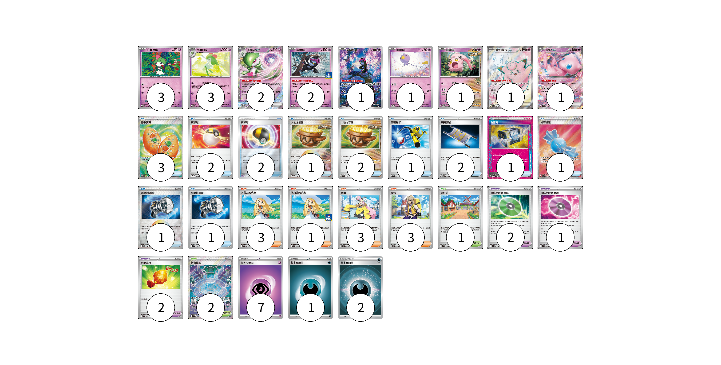 牌組構築方案 以此牌組為基礎新構築牌組 顯示卡面 顯示列表 寶可夢卡(15) 3 3 2 2 1 1 1 1 1 寶可夢道具(5) 2 1 2 物品卡(17) 3 2 2 1 2 1 2 1 1 1 1 支援者卡(10) 3 1 3 3 競技場卡(3) 1 2 能量卡(10) 7 1 2 寶可夢卡(15) 卡牌名稱 張數 卡牌名稱 張數 拉魯拉絲 M1S 040/063 03 奇魯莉安 M1S 041/063 03 沙奈朵ex SVTS 004/022 02 願增猿 M-P 014/M-P 02 願增猿 SV6 107/101 01 飄飄球 SVTS 005/022 01 吼叫尾 SVTS 007/022 01 莉莉艾的皮皮ex SV9 115/100 01 夢幻ex SV4a 076/190 01 寶可夢道具(5) 卡牌名稱 張數 卡牌名稱 張數 招式學習器 演進 SVK 025/042 02 招式學習器 衰退 SVK 026/042 01 勇氣護符 SVM 142/175 02 物品卡(17) 卡牌名稱 張數 卡牌名稱 張數 好友寶芬 M1S 081/063 03 高級球 SVOD 012/020 02 高級球 SPD 010/020 02 大地之容器 SV8a 143/187 01 大地之容器 SV8a 143/187 02 厲害釣竿 SVK 011/042 01 夜間擔架 MBD 016/022 02 秘密箱 SV6 092/101 01 神奇糖果 M1S 082/063 01 反擊捕捉器 SV8a 139/187 01 反擊捕捉器 SV8a 139/187 01 支援者卡(10) 卡牌名稱 張數 卡牌名稱 張數 莉莉艾的決意 MBD 021/022 03 莉莉艾的決意 M-P 018/M-P 01 奇樹 SVOD 016/020 03 派帕 SVOD 018/020 03 競技場卡(3) 卡牌名稱 張數 卡牌名稱 張數 深缽鎮 SVK 039/042 01 神秘花園 M1S 086/063 02 能量卡(10) 卡牌名稱 張數 卡牌名稱 張數 基本【超】能量 SVHM PSY 07 基本【惡】能量 SVF DAR 01 基本惡能量 SLD DAR 02 以此牌組為基礎新構築牌組 牌組編碼 VOEEVg-parLuS-beMTRJ copy 列印牌組單 牌組編碼已複製 分享至SNS
