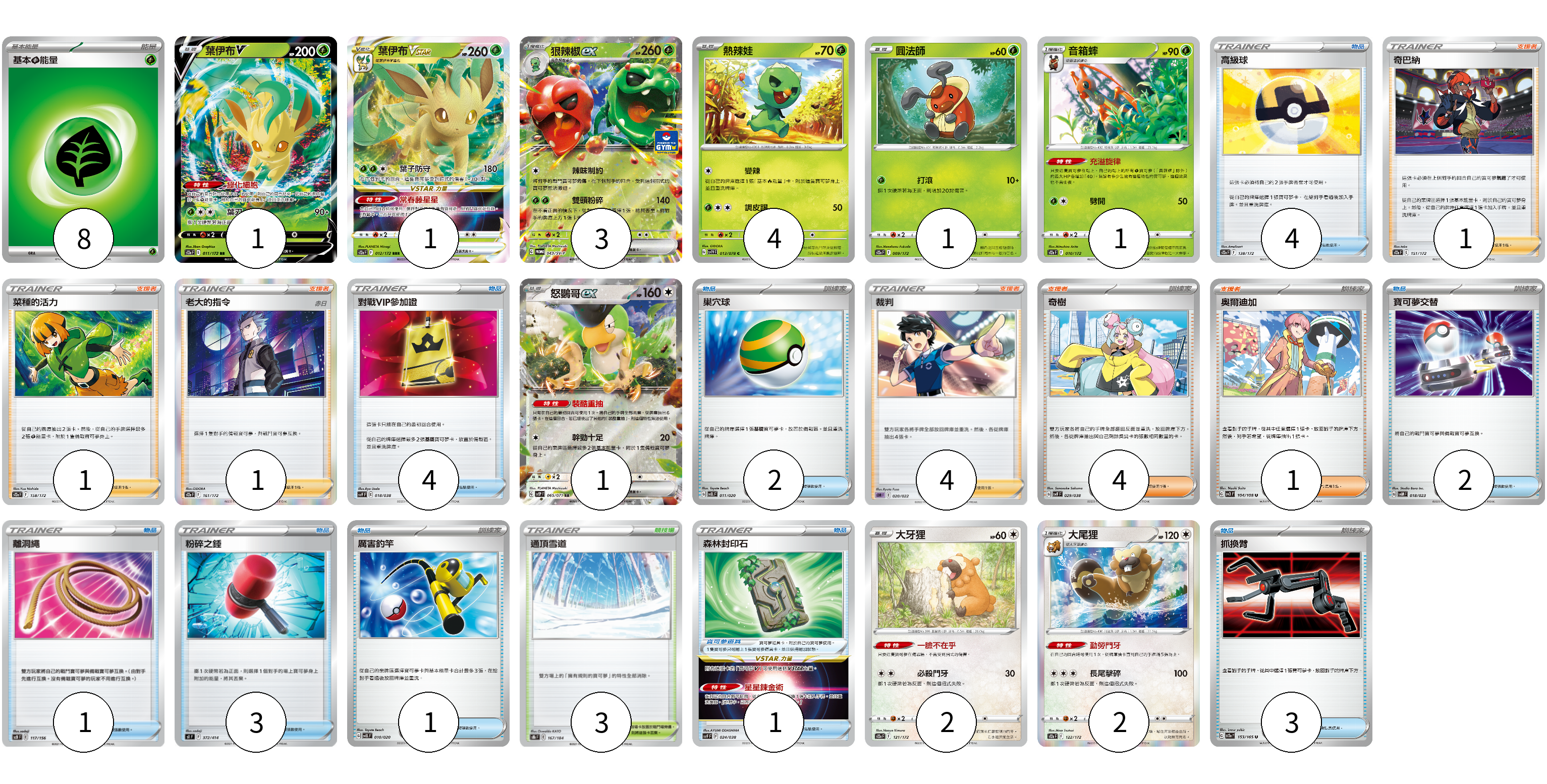 牌組構築方案 以此牌組為基礎新構築牌組 顯示卡面 顯示列表 寶可夢卡(17) 1 1 3 4 1 1 1 1 2 2 物品卡(20) 4 4 2 2 1 3 1 3 支援者卡(12) 1 1 1 4 4 1 競技場卡(3) 3 能量卡(8) 8 寶可夢卡(17) 卡牌名稱 張數 卡牌名稱 張數 葉伊布V S12a 011/172 01 葉伊布VSTAR S12a 012/172 01 狠辣椒ex SV-P 043/SV-P 03 熱辣娃 SV1V 013/078 04 圓法師 S12a 009/172 01 音箱蟀 S12a 010/172 01 怒鸚哥ex SV2P 065/071 01 厲害釣竿 SVEL 010/020 01 大牙狸 S12a 121/172 02 大尾狸 S12a 122/172 02 物品卡(20) 卡牌名稱 張數 卡牌名稱 張數 高級球 S12a 138/172 04 對戰VIP參加證 SVF 018/038 04 巢穴球 SVEL 011/020 02 寶可夢交替 SVAM 018/023 02 離洞繩 SCB 117/156 01 粉碎之錘 SI 372/414 03 森林封印石 SVF 024/038 01 抓換臂 SV2a 153/165 03 支援者卡(12) 卡牌名稱 張數 卡牌名稱 張數 奇巴納 S12a 151/172 01 菜種的活力 S12a 158/172 01 老大的指令(赤日) S12a 161/172 01 裁判 SDM 020/022 04 奇樹 SVF 029/038 04 奧爾迪加 SV3 104/108 01 競技場卡(3) 卡牌名稱 張數 卡牌名稱 張數 通頂雪道 S8b 167/184 03 能量卡(8) 卡牌名稱 張數 卡牌名稱 張數 基本草能量 sv-p GRA 08 以此牌組為基礎新構築牌組 牌組編碼 VPDpUQ-qmzgLo-nELwqW copy 列印牌組單 牌組編碼已複製 分享至SNS