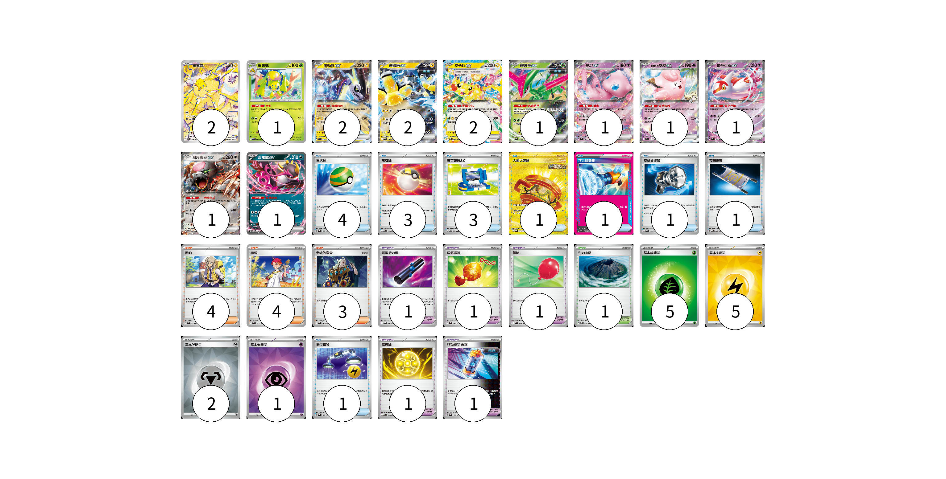 牌組構築方案 以此牌組為基礎新構築牌組 顯示卡面 顯示列表 寶可夢卡(15) 2 1 2 2 2 1 1 1 1 1 1 寶可夢道具(5) 1 1 1 1 1 物品卡(15) 4 3 3 1 1 1 1 1 支援者卡(11) 4 4 3 競技場卡(1) 1 能量卡(13) 5 5 2 1 寶可夢卡(15) 卡牌名稱 張數 卡牌名稱 張數 電電蟲 SV7 108/102 02 電蜘蛛 SV6a 002/064 01 密勒頓ex SVTR 008/021 02 鐵臂膀ex SV8a 054/187 02 皮卡丘ex SV8 033/106 02 鐵斑葉ex SV8a 016/187 01 夢幻ex SV4a 076/190 01 莉莉艾的皮皮ex SV9 033/100 01 拉帝亞斯ex SV7a 019/064 01 月月熊 赫月 ex SV5a 052/066 01 吉雉雞ex SVOM 009/021 01 寶可夢道具(5) 卡牌名稱 張數 卡牌名稱 張數 沉重接力棒 SV5M 066/071 01 勇氣護符 SVM 142/175 01 氣球 MBD 018/022 01 電氣球 M2a 163/193 01 驅勁能量 未來 SV8a 158/187 01 物品卡(15) 卡牌名稱 張數 卡牌名稱 張數 巢穴球 SVM 133/175 04 高級球 MBD 014/022 03 寶可裝置3.0 SV11B 081/086 03 大地之容器 SV6a 093/064 01 頂尖捕捉器 MBG 014/022 01 反擊捕捉器 SV8a 139/187 01 夜間擔架 MBD 016/022 01 能量轉移 SVM 127/175 01 支援者卡(11) 卡牌名稱 張數 卡牌名稱 張數 派帕 SVK 035/042 04 赤松 SV8a 163/187 04 老大的指令 MBD 020/022 03 競技場卡(1) 卡牌名稱 張數 卡牌名稱 張數 引力山岳 SV8 106/106 01 能量卡(13) 卡牌名稱 張數 卡牌名稱 張數 基本【草】能量 M-P GRA 05 基本【雷】能量 SVQP LIG 05 基本【鋼】能量 SVOD MET 02 基本【超】能量 SVOD PSY 01 以此牌組為基礎新構築牌組 牌組編碼 VPPtEE-rhkEtK-GakYmR copy 列印牌組單 牌組編碼已複製 分享至SNS