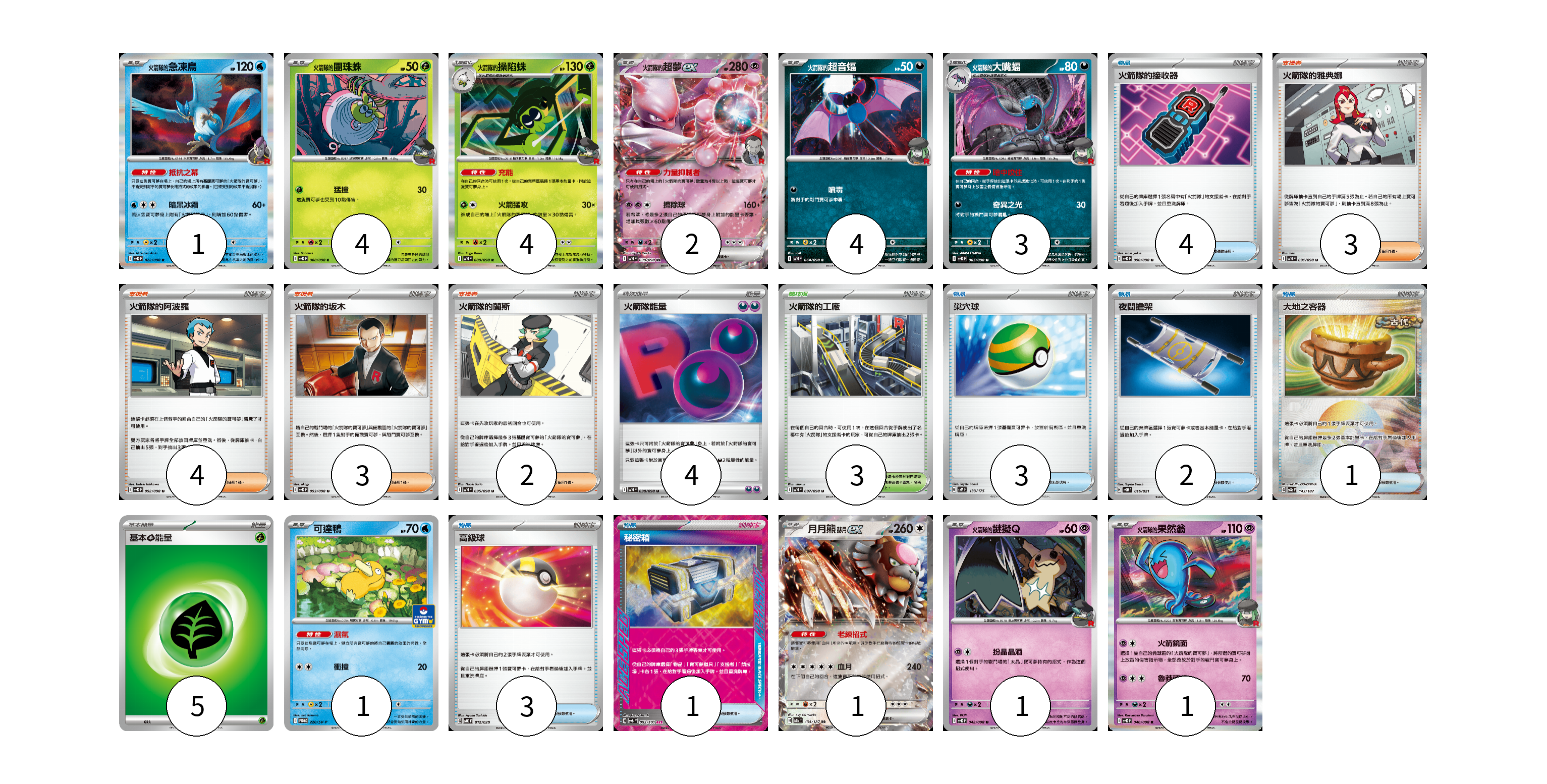 牌組構築方案 以此牌組為基礎新構築牌組 顯示卡面 顯示列表 寶可夢卡(22) 1 4 4 2 4 3 1 1 1 1 物品卡(14) 4 3 2 1 3 1 支援者卡(12) 3 4 3 2 競技場卡(3) 3 能量卡(9) 4 5 寶可夢卡(22) 卡牌名稱 張數 卡牌名稱 張數 <火箭隊的>急凍鳥 SV10 022/098 01 <火箭隊的>團珠蛛 SV10 008/098 04 <火箭隊的>操陷蛛 SV10 009/098 04 <火箭隊的>超夢ex SV10 039/098 02 <火箭隊的>超音蝠 SV10 064/098 04 <火箭隊的>大嘴蝠 SV10 065/098 03 可達鴨 SV-P 220/SV-P 01 月月熊 赫月ex SV8a 134/187 01 <火箭隊的>謎擬Q SV10 042/098 01 <火箭隊的>果然翁 SV10 040/098 01 物品卡(14) 卡牌名稱 張數 卡牌名稱 張數 火箭隊的接收器 SV10 090/098 04 巢穴球 SVM 133/175 03 夜間擔架 SVOM 016/021 02 大地之容器 SV8a 143/187 01 高級球 SVOD 012/020 03 秘密箱 SV6 092/101 01 支援者卡(12) 卡牌名稱 張數 卡牌名稱 張數 火箭隊的雅典娜 SV10 091/098 03 火箭隊的阿波羅 SV10 092/098 04 火箭隊的坂木 SV10 093/098 03 火箭隊的蘭斯 SV10 095/098 02 競技場卡(3) 卡牌名稱 張數 卡牌名稱 張數 火箭隊的工廠 SV10 097/098 03 能量卡(9) 卡牌名稱 張數 卡牌名稱 張數 火箭隊能量 SV10 098/098 04 基本草能量 sv-p GRA 05 以此牌組為基礎新構築牌組 牌組編碼 VQctSt-hWHlnK-Hpmatn copy 列印牌組單 牌組編碼已複製 分享至SNS