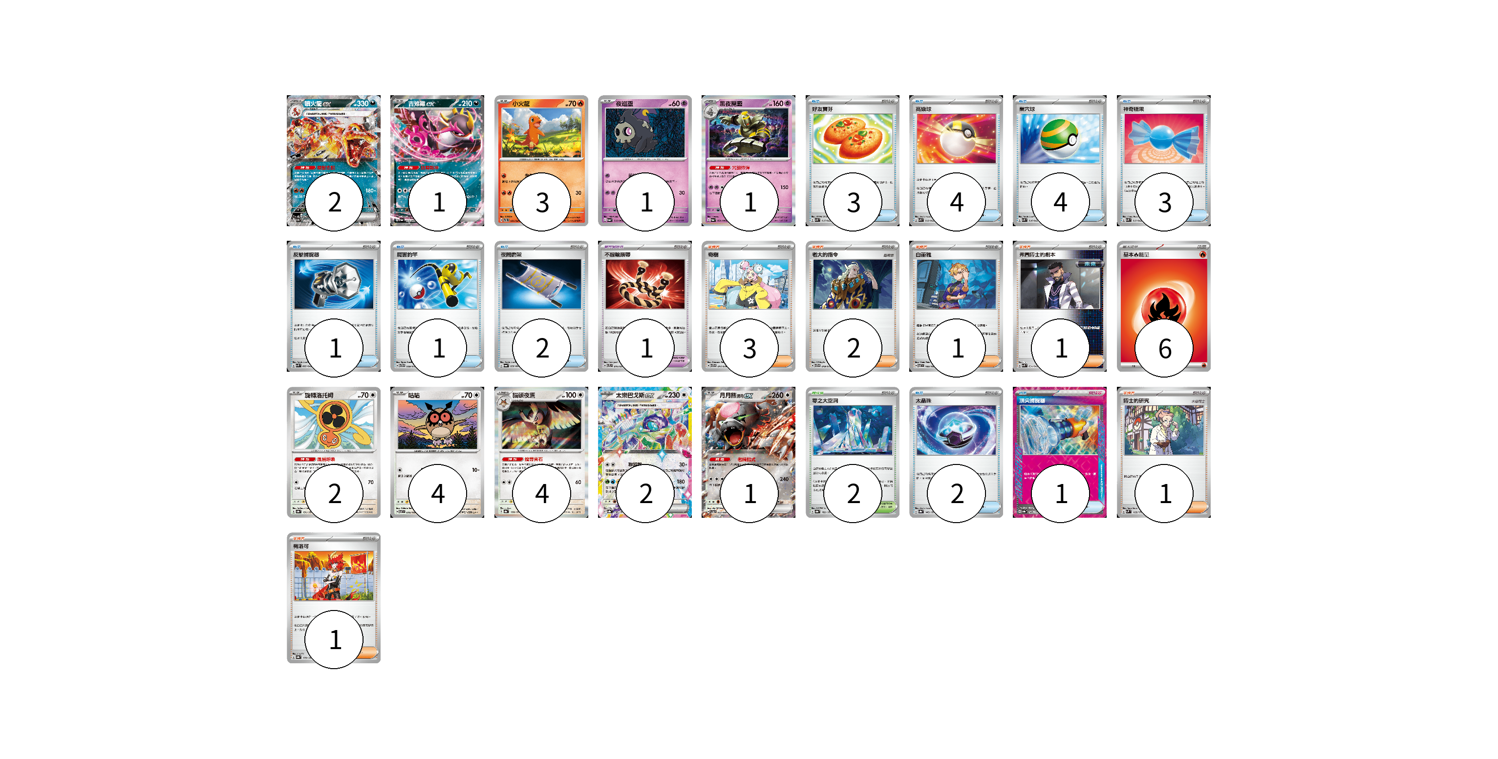 牌組構築方案 以此牌組為基礎新構築牌組 顯示卡面 顯示列表 寶可夢卡(21) 2 1 3 1 1 2 4 4 2 1 寶可夢道具(1) 1 物品卡(21) 3 4 4 3 1 1 2 2 1 支援者卡(9) 3 2 1 1 1 1 競技場卡(2) 2 能量卡(6) 6 寶可夢卡(21) 卡牌名稱 張數 卡牌名稱 張數 噴火龍ex SV4a 115/190 02 吉雉雞ex SV6a 038/064 01 小火龍 SVTL 001/021 03 夜巡靈 SV6a 018/064 01 黑夜魔靈 SV6a 020/064 01 旋轉洛托姆 SV8a 131/187 02 咕咕 SV7 076/102 04 貓頭夜鷹 SV8a 128/187 04 太樂巴戈斯ex SV8a 136/187 02 月月熊 赫月 ex SV5a 052/066 01 寶可夢道具(1) 卡牌名稱 張數 卡牌名稱 張數 不服輸頭帶 SVTL 016/021 01 物品卡(21) 卡牌名稱 張數 卡牌名稱 張數 好友寶芬 SVK 015/042 03 高級球 SVK 018/042 04 巢穴球 SVK 016/042 04 神奇糖果 SVK 019/042 03 反擊捕捉器 SVK 009/042 01 厲害釣竿 SVTG 009/019 01 夜間擔架 SV6a 056/064 02 太晶珠 SV8a 145/187 02 頂尖捕捉器 SV8a 148/187 01 支援者卡(9) 卡牌名稱 張數 卡牌名稱 張數 奇樹 SVTG 017/019 03 老大的指令 SVTG 019/019 02 白蕾雅 SV7 100/102 01 弗圖博士的劇本 SVK 034/042 01 博士的研究 SVM 169/175 01 梅洛可 SV8a 179/187 01 競技場卡(2) 卡牌名稱 張數 卡牌名稱 張數 零之大空洞 SV8a 182/187 02 能量卡(6) 卡牌名稱 張數 卡牌名稱 張數 基本火能量 sv-p FIR 06 以此牌組為基礎新構築牌組 牌組編碼 VUVypL-TFvBaE-ySgxIq copy 列印牌組單 牌組編碼已複製 分享至SNS