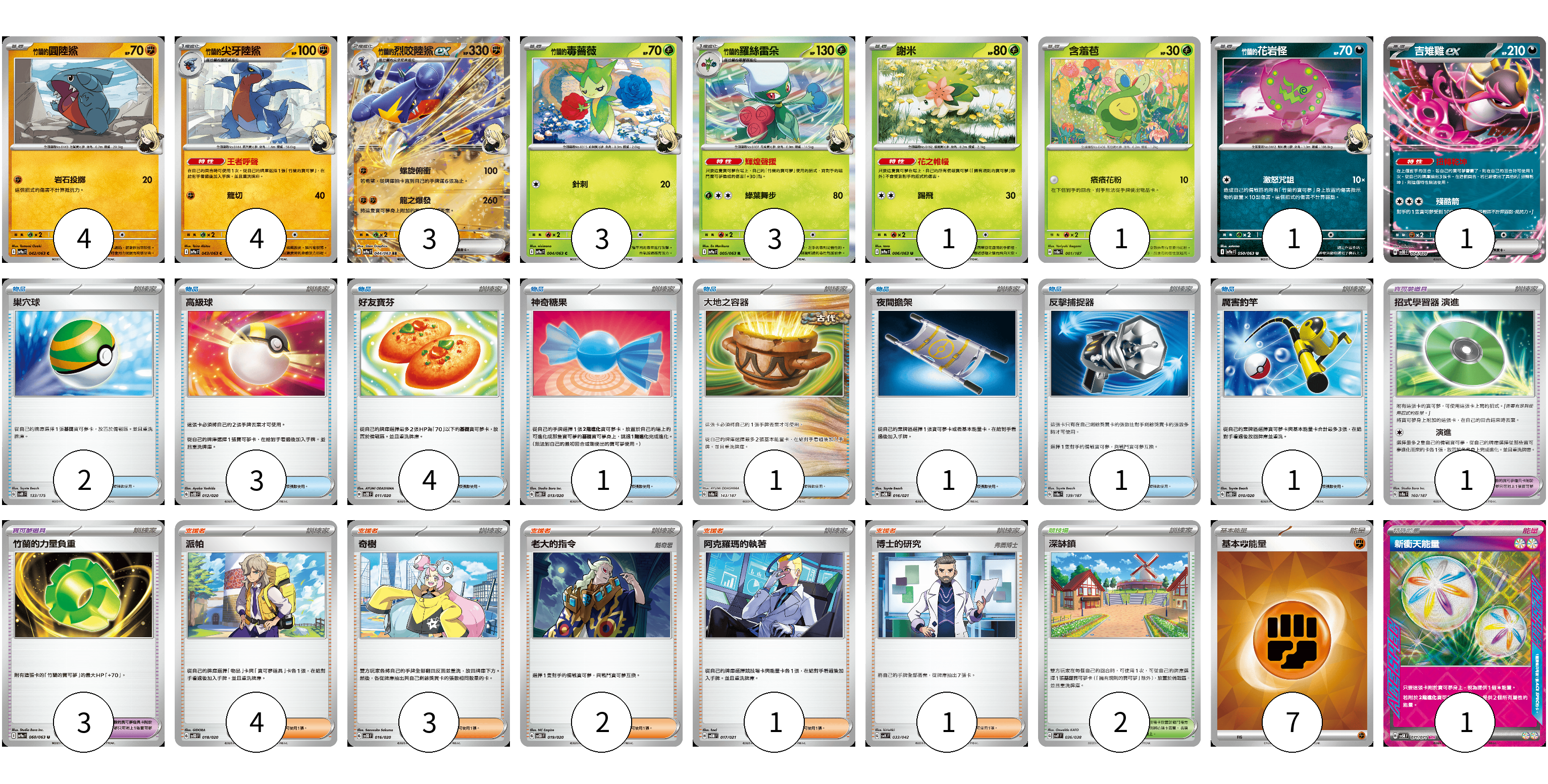 牌組構築方案 以此牌組為基礎新構築牌組 顯示卡面 顯示列表 寶可夢卡(21) 4 4 3 3 3 1 1 1 1 寶可夢道具(4) 1 3 物品卡(14) 2 3 4 1 1 1 1 1 支援者卡(11) 4 3 2 1 1 競技場卡(2) 2 能量卡(8) 7 1 寶可夢卡(21) 卡牌名稱 張數 卡牌名稱 張數 <竹蘭的>圓陸鯊 SV9a 042/063 04 <竹蘭的>尖牙陸鯊 SV9a 043/063 04 <竹蘭的>烈咬陸鯊ex SV9a 044/063 03 <竹蘭的>毒薔薇 SV9a 004/063 03 <竹蘭的>羅絲雷朵 SV9a 005/063 03 謝米 SV9a 006/063 01 含羞苞 SV8a 001/187 01 <竹蘭的>花岩怪 SV9a 050/063 01 吉雉雞ex SVOD 004/020 01 寶可夢道具(4) 卡牌名稱 張數 卡牌名稱 張數 招式學習器 演進 SV8a 160/187 01 竹蘭的力量負重 SV9a 060/063 03 物品卡(14) 卡牌名稱 張數 卡牌名稱 張數 巢穴球 SVM 133/175 02 高級球 SVOD 012/020 03 好友寶芬 SVOD 011/020 04 神奇糖果 SVOD 013/020 01 大地之容器 SV8a 143/187 01 夜間擔架 SVOM 016/021 01 反擊捕捉器 SV8a 139/187 01 厲害釣竿 SVOD 010/020 01 支援者卡(11) 卡牌名稱 張數 卡牌名稱 張數 派帕 SVOD 018/020 04 奇樹 SVOD 016/020 03 老大的指令 SVOD 019/020 02 阿克羅瑪的執著 SVOM 017/021 01 博士的研究 SVK 033/042 01 競技場卡(2) 卡牌名稱 張數 卡牌名稱 張數 深缽鎮 SVF 036/038 02 能量卡(8) 卡牌名稱 張數 卡牌名稱 張數 基本【鬥】能量 SVK FIG 07 新衝天能量 SV5K 071/071 01 以此牌組為基礎新構築牌組 牌組編碼 VYZeFc-tPpiqL-CYUgzJ copy 列印牌組單 牌組編碼已複製 分享至SNS