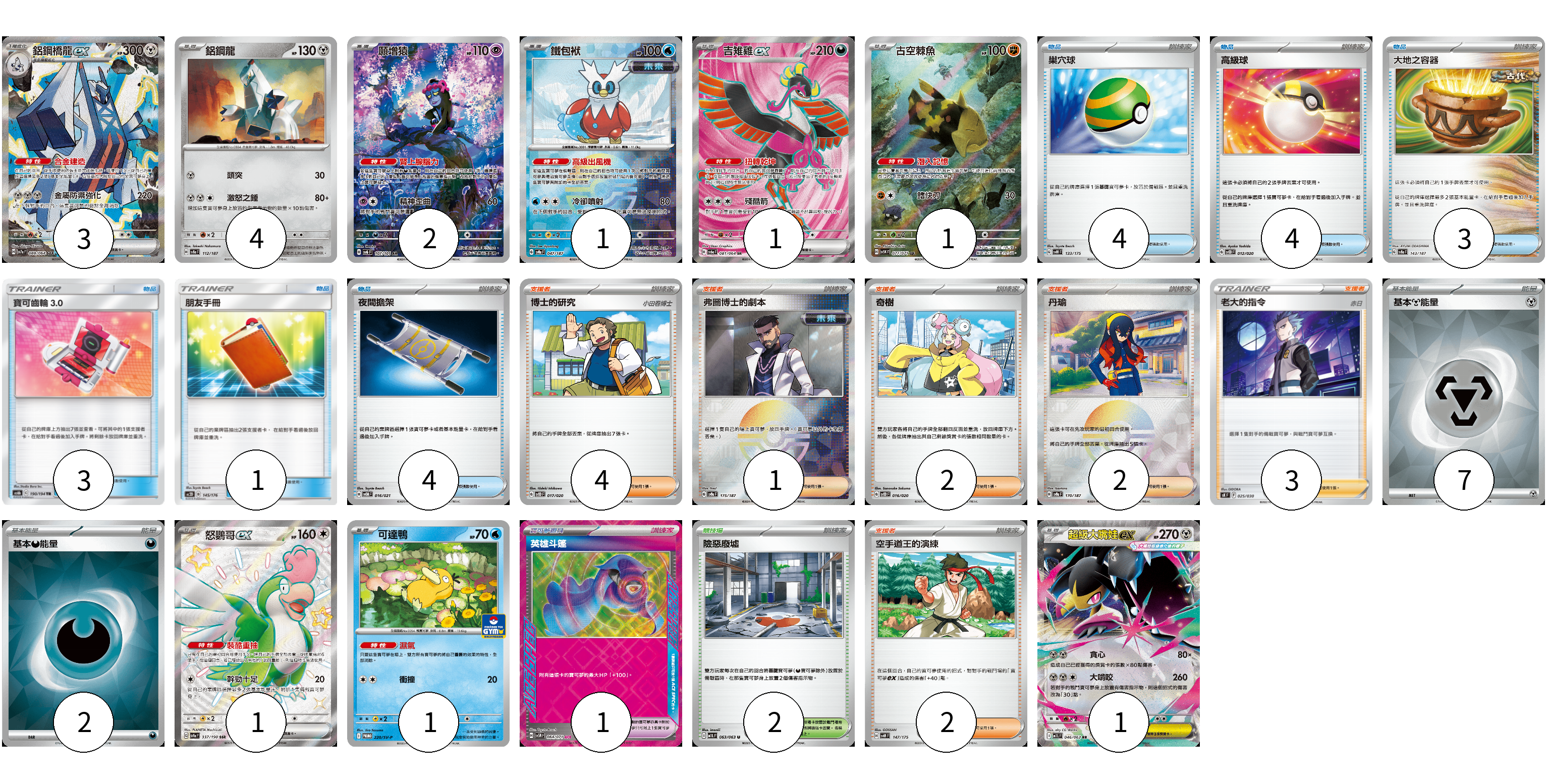 牌組構築方案 以此牌組為基礎新構築牌組 顯示卡面 顯示列表 寶可夢卡(15) 3 4 2 1 1 1 1 1 1 寶可夢道具(1) 1 物品卡(19) 4 4 3 3 1 4 支援者卡(14) 4 1 2 2 3 2 競技場卡(2) 2 能量卡(9) 7 2 寶可夢卡(15) 卡牌名稱 張數 卡牌名稱 張數 鋁鋼橋龍ex SV7a 088/064 03 鋁鋼龍 SV8a 112/187 04 願增猿 SV6 107/101 02 鐵包袱 SV8a 047/187 01 吉雉雞ex SV6a 081/064 01 古空棘魚 SV5K 077/071 01 怒鸚哥ex SV4a 337/190 01 可達鴨 SV-P 220/SV-P 01 超級大嘴娃ex M1L 046/063 01 寶可夢道具(1) 卡牌名稱 張數 卡牌名稱 張數 英雄斗篷 SV5M 064/071 01 物品卡(19) 卡牌名稱 張數 卡牌名稱 張數 巢穴球 SVM 133/175 04 高級球 SVOD 012/020 04 大地之容器 SV8a 143/187 03 寶可齒輪3.0 AS6b 190/194 03 朋友手冊 AC2D 145/176 01 夜間擔架 SVOM 016/021 04 支援者卡(14) 卡牌名稱 張數 卡牌名稱 張數 博士的研究 SVOD 017/020 04 弗圖博士的劇本 SV8a 175/187 01 奇樹 SVOD 016/020 02 丹瑜 SV8a 170/187 02 老大的指令(赤日) SK 025/030 03 空手道王的演練 SVM 147/175 02 競技場卡(2) 卡牌名稱 張數 卡牌名稱 張數 險惡廢墟 M1L 063/063 02 能量卡(9) 卡牌名稱 張數 卡牌名稱 張數 基本【鋼】能量 SVOD MET 07 基本【惡】能量 SVOM DAR 02 以此牌組為基礎新構築牌組 牌組編碼 VZkhTc-SidkYY-kGpuiU copy 列印牌組單 牌組編碼已複製 分享至SNS