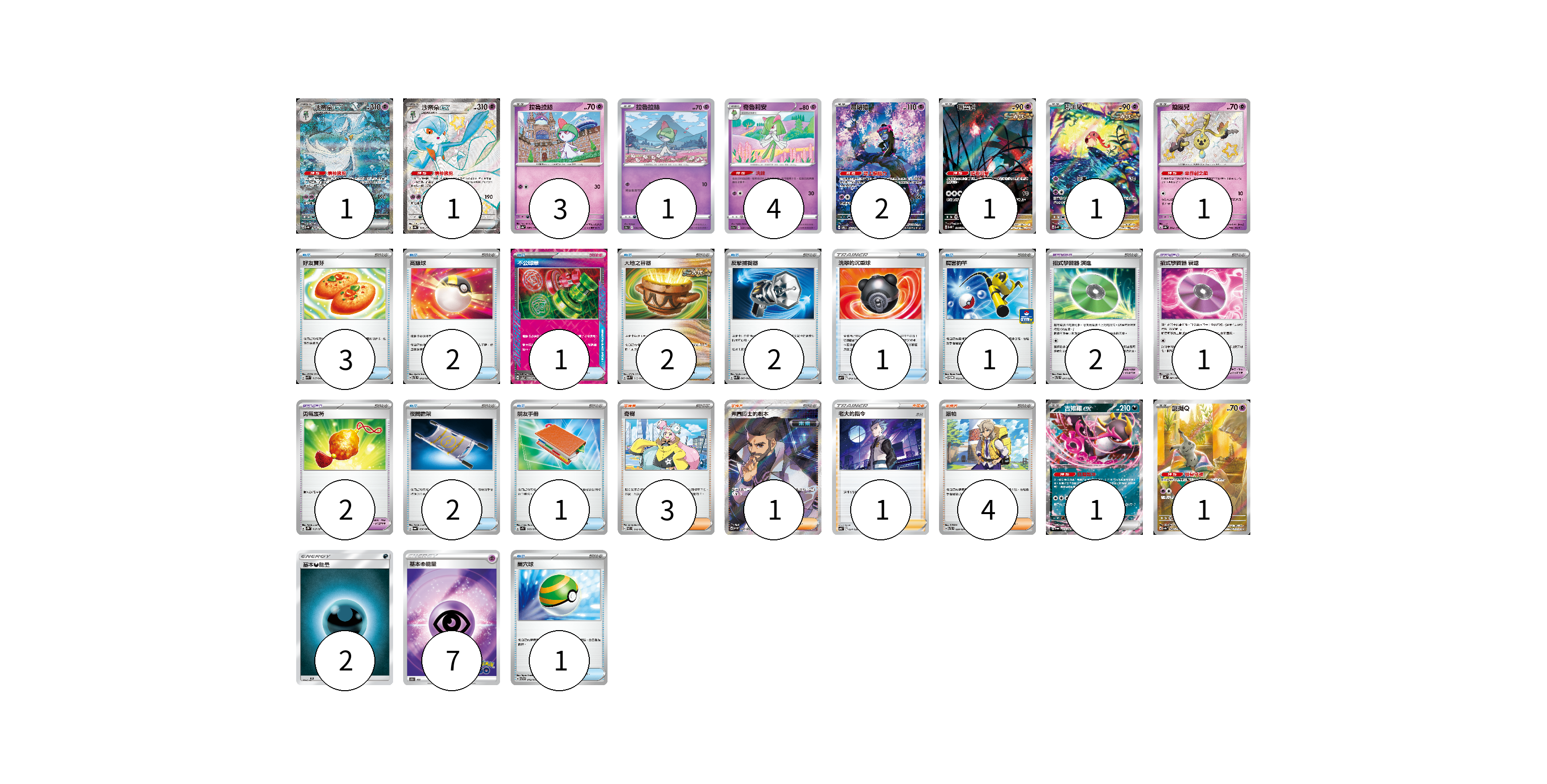 牌組構築方案 以此牌組為基礎新構築牌組 顯示卡面 顯示列表 寶可夢卡(17) 1 1 3 1 4 2 1 1 1 1 1 寶可夢道具(5) 2 1 2 物品卡(16) 3 2 1 2 2 1 1 2 1 1 支援者卡(9) 3 1 1 4 能量卡(9) 2 7 寶可夢卡(17) 卡牌名稱 張數 卡牌名稱 張數 沙奈朵ex SV4a 348/190 01 沙奈朵ex SV4a 328/190 01 拉魯拉絲 SV4a 080/190 03 拉魯拉絲 S9a 032/067 01 奇魯莉安 S11a 037/068 04 願增猿 SV6 107/101 02 振翼髮 SV5K 076/071 01 吼叫尾 SV4K 071/066 01 鑰圈兒 SV4a 264/190 01 吉雉雞ex SV6a 038/064 01 謎擬Q SV4a 341/190 01 寶可夢道具(5) 卡牌名稱 張數 卡牌名稱 張數 招式學習器 演進 SVTL 017/021 02 招式學習器 衰退 SV4K 063/066 01 勇氣護符 SV2D 067/071 02 物品卡(16) 卡牌名稱 張數 卡牌名稱 張數 好友寶芬 SVK 015/042 03 高級球 SVTL 012/021 02 不公印章 SV5a 053/066 01 大地之容器 SVK 012/042 02 反擊捕捉器 SVK 009/042 02 洗翠的沉重球 SVF 019/038 01 厲害釣竿 SV-P 112/SV-P 01 夜間擔架 SV6a 056/064 02 朋友手冊 SV1S 069/078 01 巢穴球 SVTG 012/019 01 支援者卡(9) 卡牌名稱 張數 卡牌名稱 張數 奇樹 SVEL 016/020 03 弗圖博士的劇本 SV4M 086/066 01 老大的指令(赤日) SVB 024/028 01 派帕 SVTL 020/021 04 能量卡(9) 卡牌名稱 張數 卡牌名稱 張數 基本惡能量 AS6D DAR 02 基本超能量 S10b PSY 07 以此牌組為基礎新構築牌組 牌組編碼 VabttJ-zuuaSb-OaUWWF copy 列印牌組單 牌組編碼已複製 分享至SNS